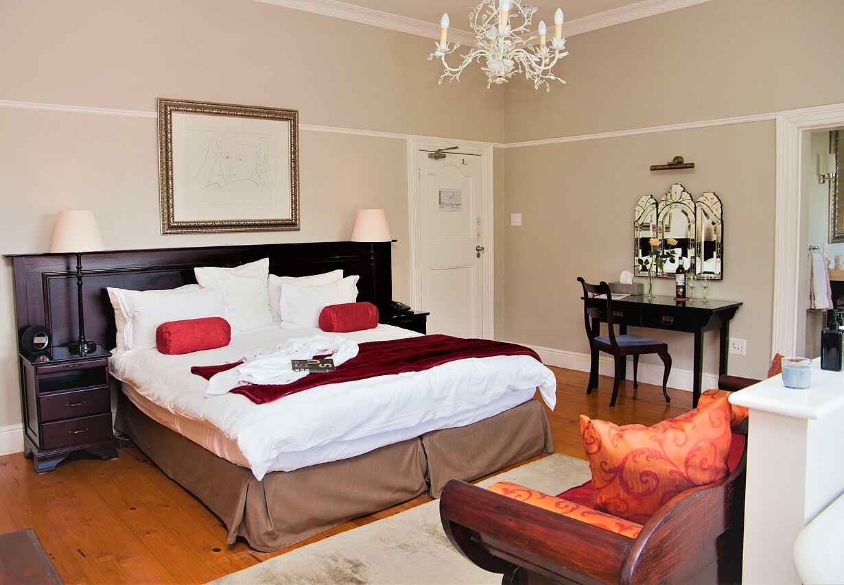 Jede der neun Suiten hat ihren eigenen Charakter und kombiniert historischen Charme mit modernem Komfort. Gäste schlafen in hochwertigen Betten mit feiner Bettwäsche und genießen Annehmlichkeiten wie Klimaanlage, Minibar, Safe sowie Kaffee- und Teezubereitung. Die eleganten Badezimmer sind mit Dusche oder Badewanne, Haartrockner und ausgesuchten Pflegeprodukten ausgestattet. Je nach Lage öffnet sich der Blick entweder direkt auf den Tafelberg oder über die Dächer von Kapstadt.