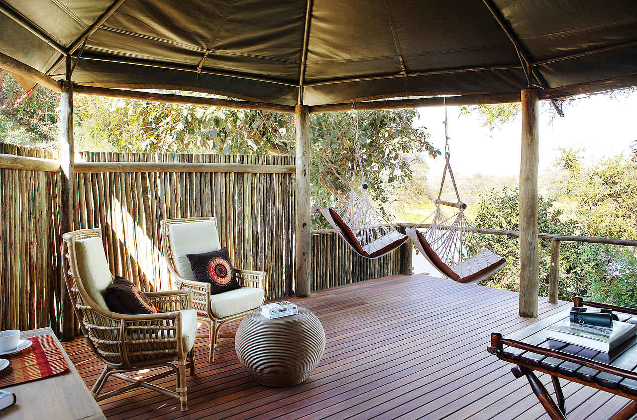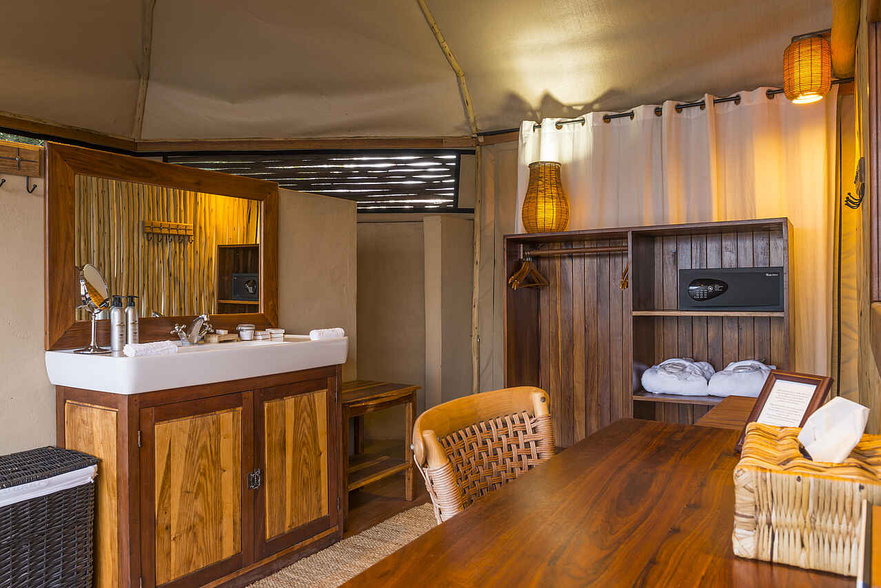 4 Safari-Zelte auf einem Holzdeck, ca. 45 m², mit je 2 großen Betten, Balkon mit gemütlichen Hängesesseln, Wohnbereich, Bad en suite (Dusche, separate Toilette), Moskitonetz, Ventilatoren, Safe, Minibar. 24 Std Strom, Wäscheservice inkl. Großer Abstand für genügend Privatsphäre. 2 der Zelte können zum Familienzelt zusammengelegt werden.
