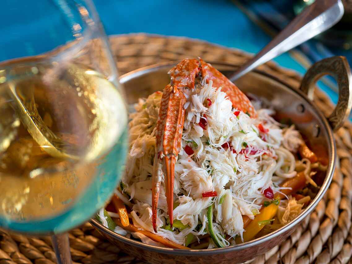 Fisch und Meeresfrüchte sind erwartungsgemäß die Spezialität der exquisiten Küche. Frühstück: Tee, Kaffee, Säfte, Früchte, Brot, Aufstrich, Cerealien, Cooked Breakfast. Mittagessen: Pikante Speisen, leichte Salate. Mahlzeiten werden vor allem im eleganten Restaurant im Hauptgebäude serviert. Dinner kann auf Wunsch auch am Strand oder an den privaten Casitas oder Cabanas serviert werden. Eine Dhow wurde zur Strandbar umgebaut. Koshere Zubereitung von Speisen ist ausdrücklich nicht möglich.