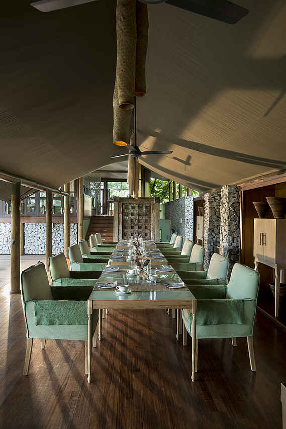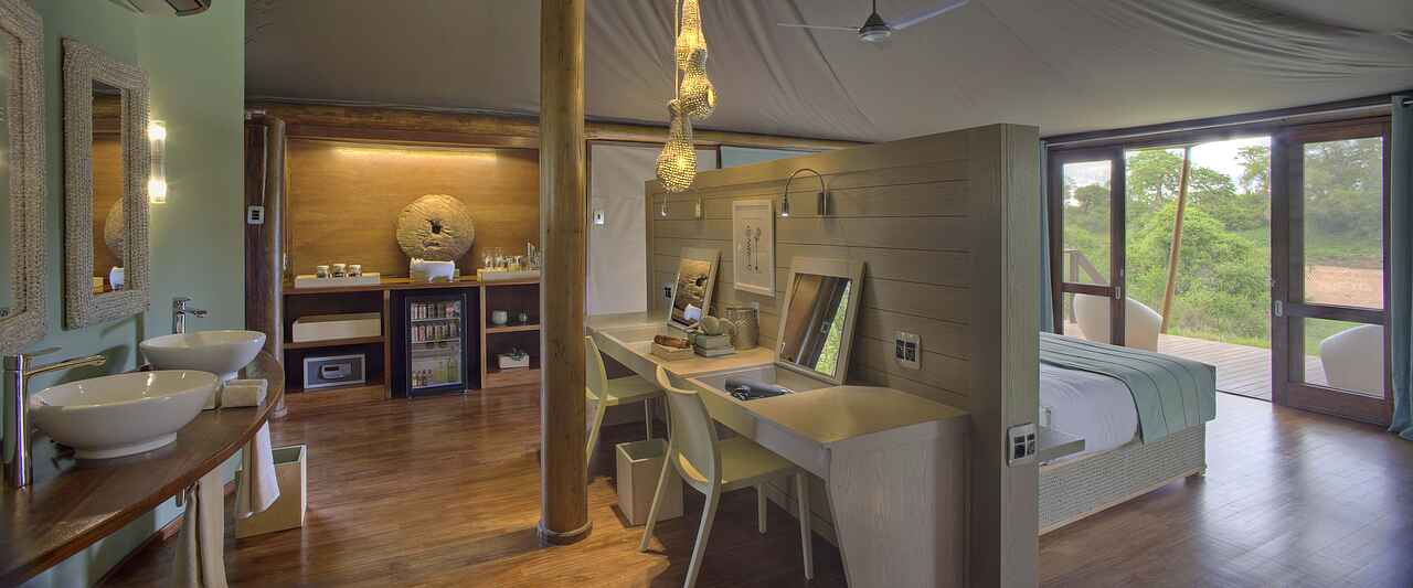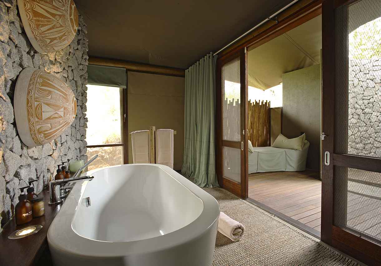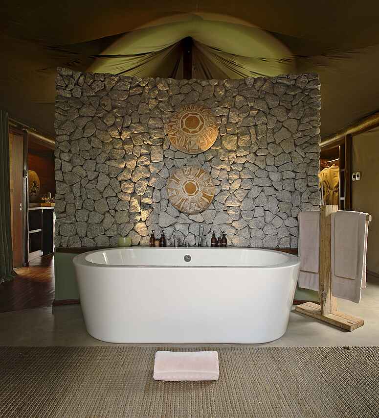 9 Zelte aus Segeltuch und auf Holzplattformen errichtet; eingerichtet mit einem Doppelbett, Schreibtisch und Deckenventilatoren; Ensuite Badezimmer mit Waschtisch, Badewanne und separater Toilette; Außendusche; private Holzterrasse mit Sesseln und Esstisch.