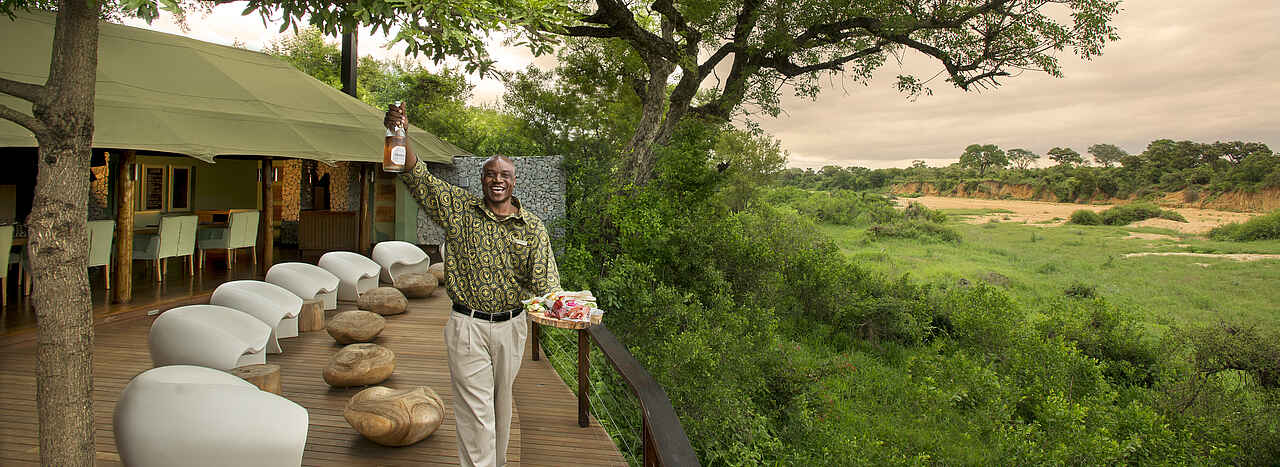 Morgens vor dem Game Drive Tee/Kaffee und Gebäck, nach dem Game Drive reiches Frühstücksbuffet; Lunch auf der Terrasse, am Pool oder auf dem Rasen; Dinner im ausgetrockneten Flussbett am Lagerfeuer; auch koscheres Essen wird bei voriger Ankündigung zubereitet; Snacks und Getränke werden über den Tag verteilt angeboten.