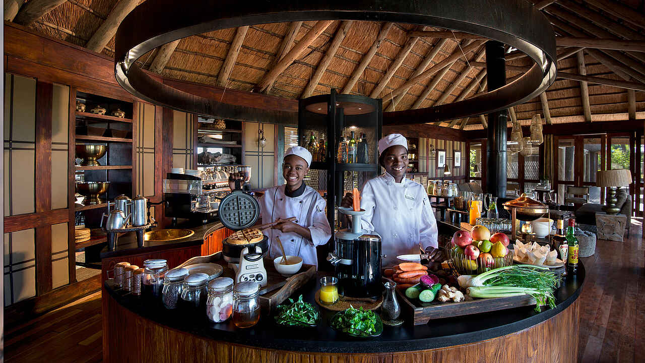 Vollpension, Getränke inklusive. Die Gäste speisen im Speisesaal oder in der Boma, jeweils an der großen Tafel oder an separaten Tischen. Frühstück, Lunch, Tea Time, 3-Gänge-Dinner.