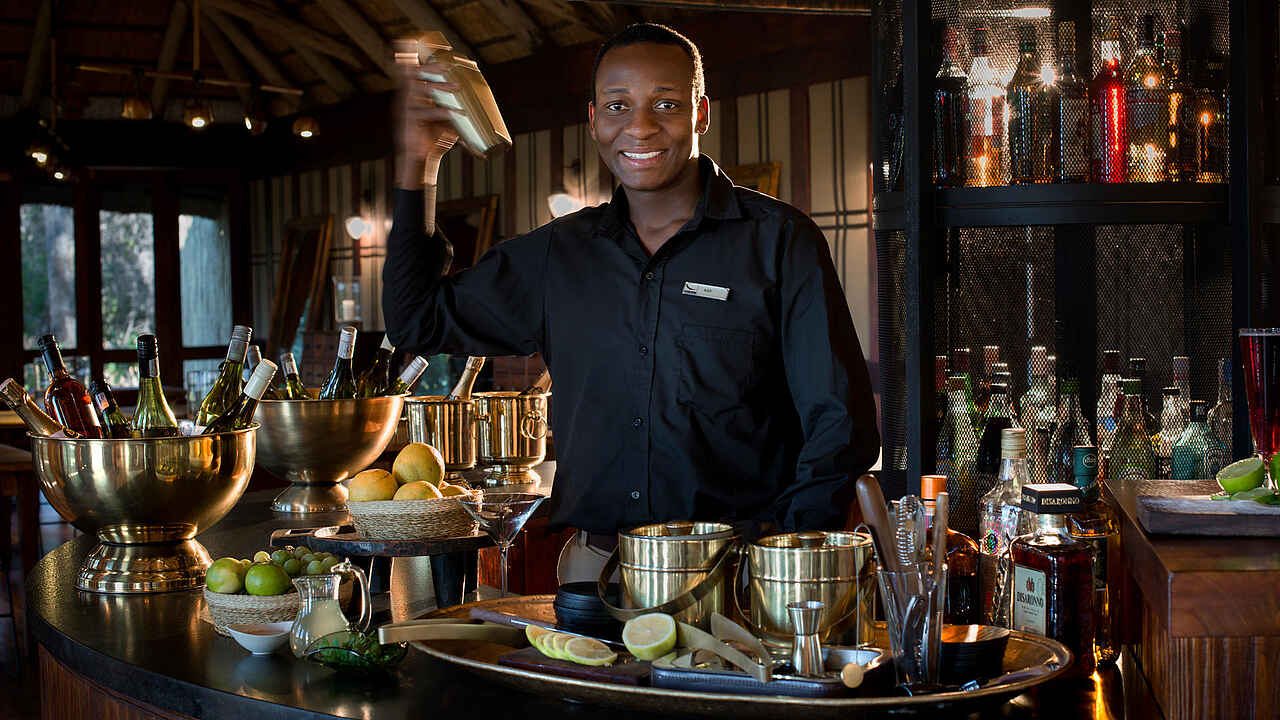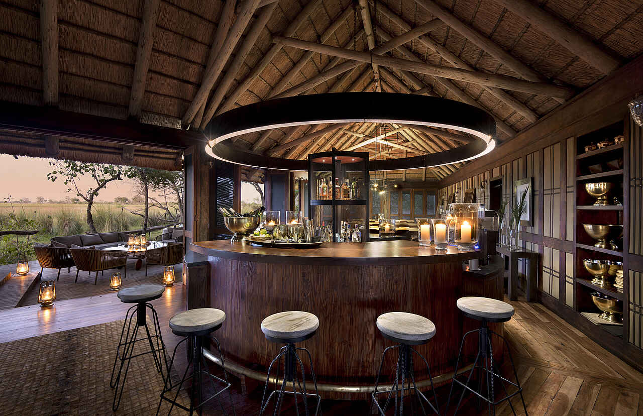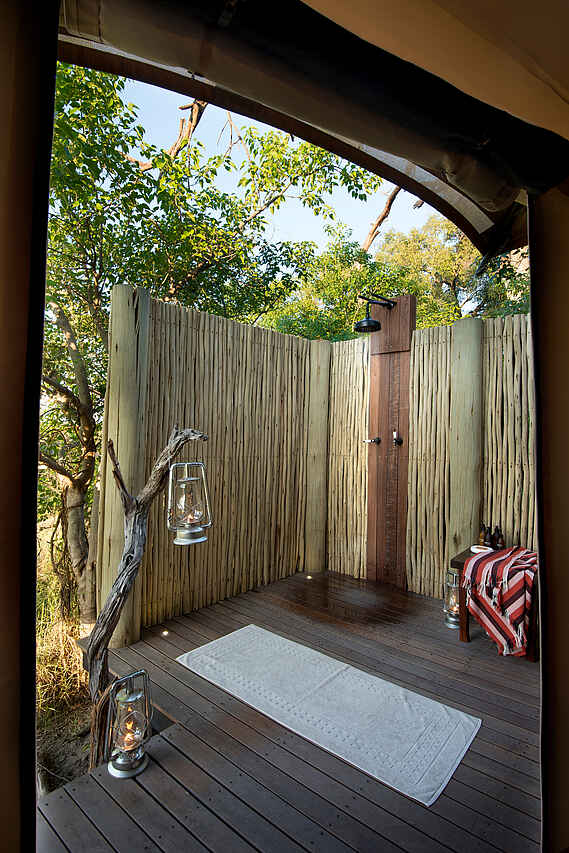 Ganzjährig geöffnet. Main Area mit Lounge- und Speisebereich, Bar, Aussichtsdeck, Safari Shop, Plunge Pool, Boma mit Feuerstelle. Kein Telefon/Mobilfunk/TV/Radio, aber WiFi in der Guest Area. Stromversorgung über Generator.