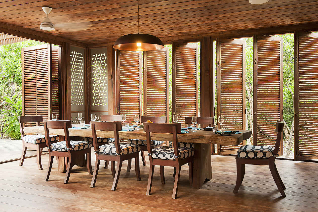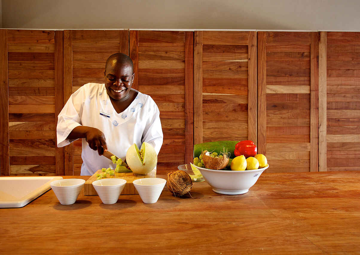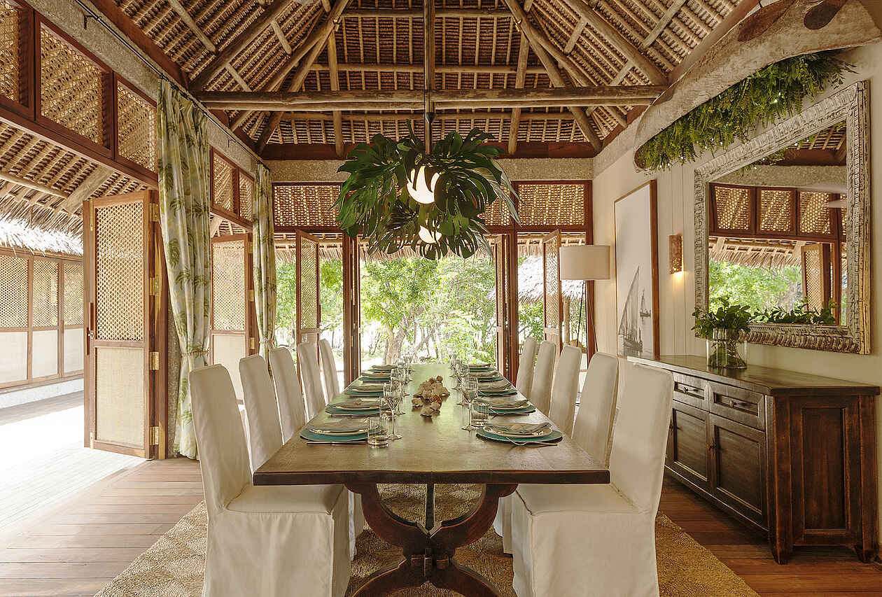 Gebucht wird auf der Basis von Vollpension. Mitinbegriffen sind drei Mahlzeiten, Erfrischungsgetränke, Hausweine, lokale Marken an Spirituosen und Bier, Tee und Kaffee. Nicht mitinbegriffen sind Champagner, Cognac, Premiumweine und Premium Schnapsmarken. Das Essen wird in der eigenen privaten Villa serviert und nach individuellen Wünschen vom persönlichen Koch zubereitet. Das Restaurant im Hauptgebäude steht ebenso zur Verfügung. Die Küche ist von hervorragender Qualität. Die Gerichte orientieren sich außerdem nach dem täglichen Fischfang und werden somit stets fangfrisch zubereitet.