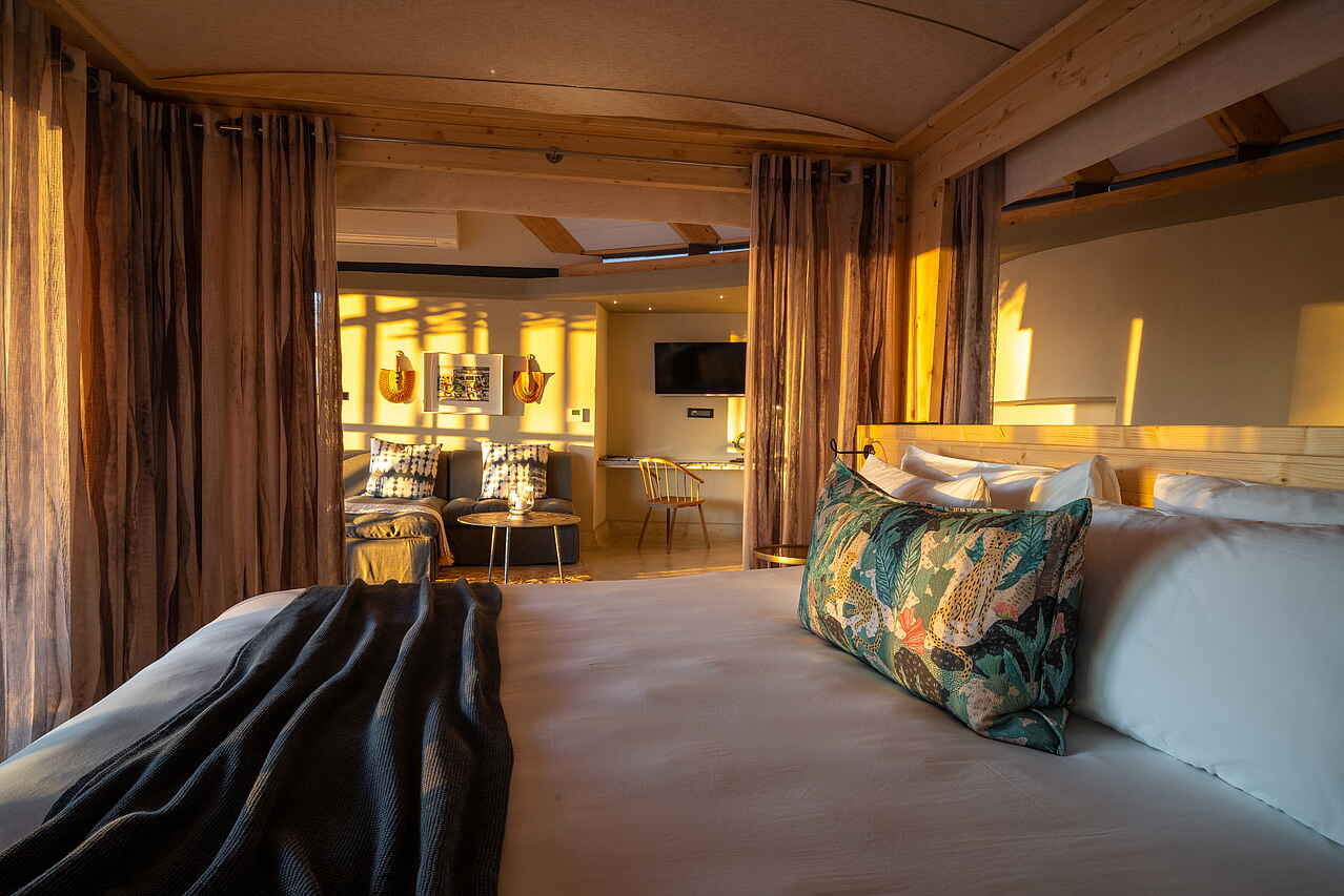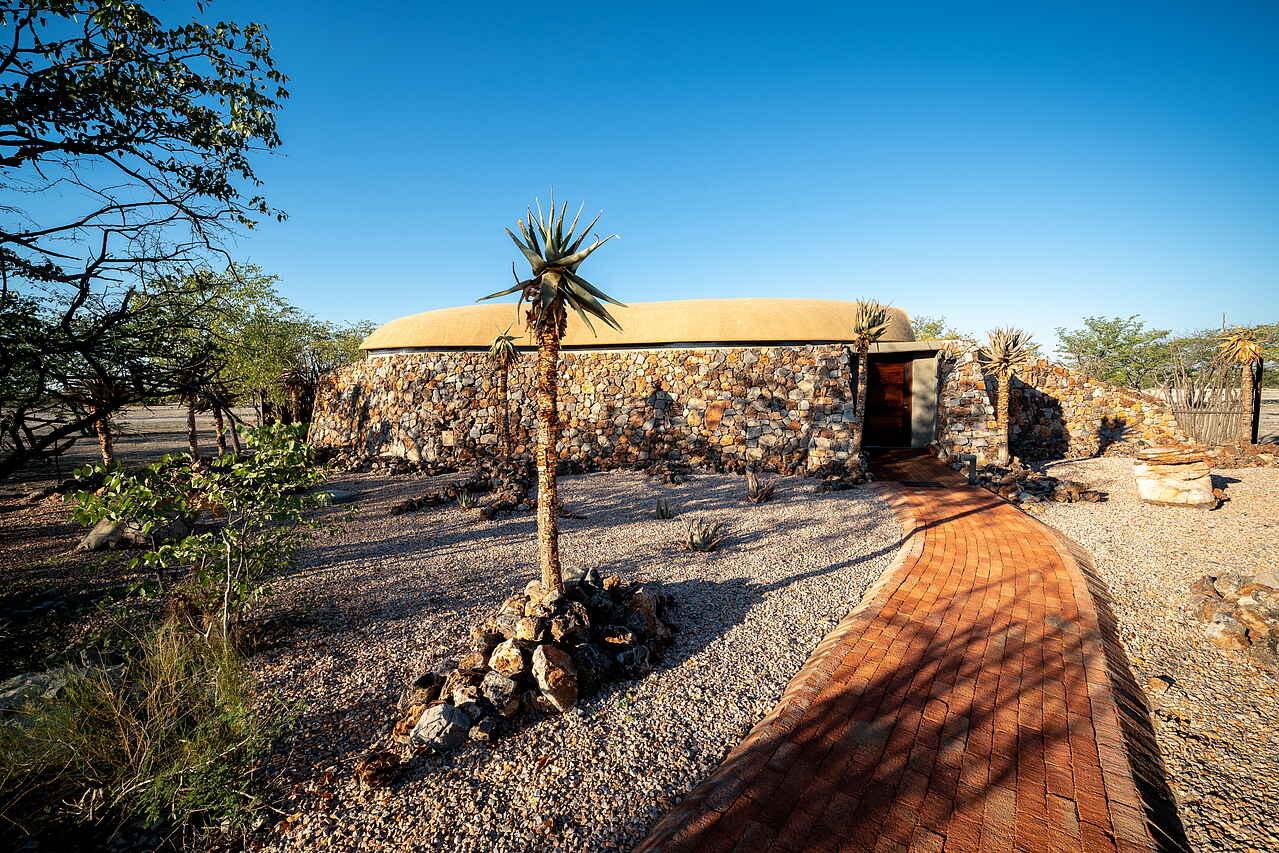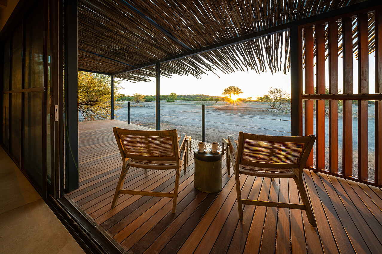 Es gibt 7 Gästechalets und eine Famlieneinheit die über Ziegelstein-gepflasterte Wege mit dem Zantralbereich der Lodge verbunden sind. Das auffälligste Merkmal der Chalets sind die eleganten Dächer mit ihren geschwungenen Rippen aus hellem Holz. Die Fußböden sind hell zementiert, hier und da liegen Teppiche aus Naturmaterialien. Das große Doppelbett steht mitten im Raum und kann rundherum durch Moskitovorhänge geschützt werden. Kleiner Schreibtisch mit Stuhl. Eine Monitor überträgt permanent Bilder von den Webcams an den Wasserlöchern. Chaise Longue mit Sessel, private Holzdielenveranda. Im Bad zwei Waschbecken, WC und eine blau geflieste Innendusche. Außerdem erreichbar durch eine Seitentür eine Außendusche. Orientierung der Chalets Richtunf Westen und Sonnenuntergang.