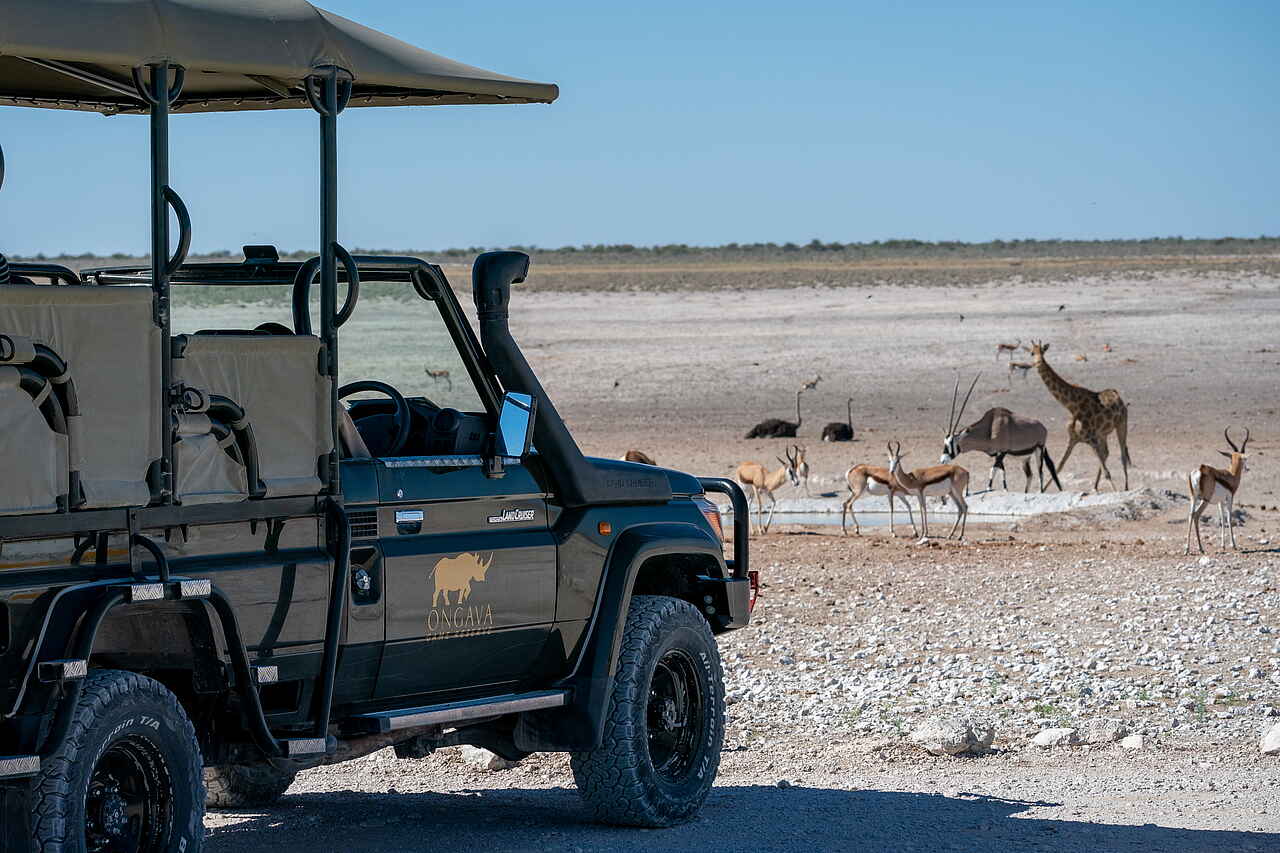 Wildbeobachtungsfahrten (auch bei Nacht) im offenen Geländewagen. Im Ongava Wildschutzgebiet sowie im Etosha-Nationalpark gibt es eine Vielfalt an Wildtieren. Vor allem an den vielen Wasserstellen tummeln sich Zebras, Giraffen, Elefanten, Springböcke, Oryx-Antilopen, Strauße und sogar Löwen und Geparde. Aber auch die seltenen Spitz- und Breitmaulnashörner löschen dort ihren Durst. Darüber hinaus lohnt sich auch eine Buschwanderung in Begleitung eines bewaffneten Fährtensuchers. Dieser kennt sich besonders gut aus und kann einiges über die einheimischen Tiere und Pflanzen erzählen, was eine Wanderung zu einem unvergesslichen Erlebnis macht. Das Ongava Wildschutzgebiet beherbergt neben einer Vielzahl an Wildtieren auch eine unglaubliche Artenvielfalt an Vögeln. Mit rund 340 unterschiedlichen Vogelarten, wovon 14 nur in Namibia einheimisch sind, ist dieser Ort ideal für Vogelbeobachtungen. Neben Merlen (Amseln), Wiedehopfen, Rotnackenfalken, Webervögeln und Steppenfalken finden Sie hier auch den Rotbauchwürger, der zugleich Namibias Reichsvogel ist. Außerdem Unterstand für Fotografen am Wasserloch, Teleskop, Besuche des Ongava Research Center in Eigenregie. Gelegentlich Vorträge von Forschern, Naturschützern, Tierärzten oder Rangern.