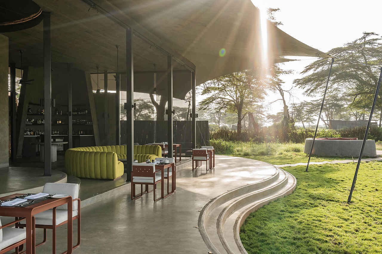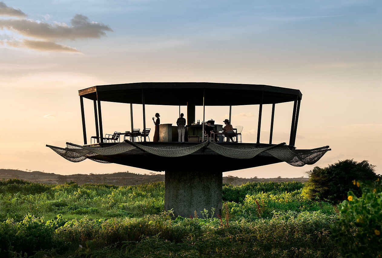 Der Hauptbereich von Angama Amboseli begeistert mit einer einladenden Lounge und flexiblen Indoor- und Outdoor-Dining-Möglichkeiten. Eine gemütliche Baraza am Feuer lädt dazu ein, den Abend entspannt bei einem Drink oder beim Rösten von Marshmallows zu verbringen. Zu den weiteren Einrichtungen gehören ein Safari-Shop, ein Spielzimmer, eine Kunstgalerie und ein Webstudio. Der Infinity-Pool bietet Erholung mit Blick auf den Kilimandscharo und ein nahegelegenes Wasserloch, das regelmäßig von Elefanten besucht wird - ein eindrucksvolles Schauspiel der Natur. Der Mnara, ein Aussichtsturm mit 360-Grad-Blick auf dieKimana Sanctuary, die Chyulu Hills und den Kilimandscharo, ist ideal, um Wildtiere zu beobachten, ein Picknick zu genießen oder den Tag bei einem Sundowner ausklingen zu lassen.