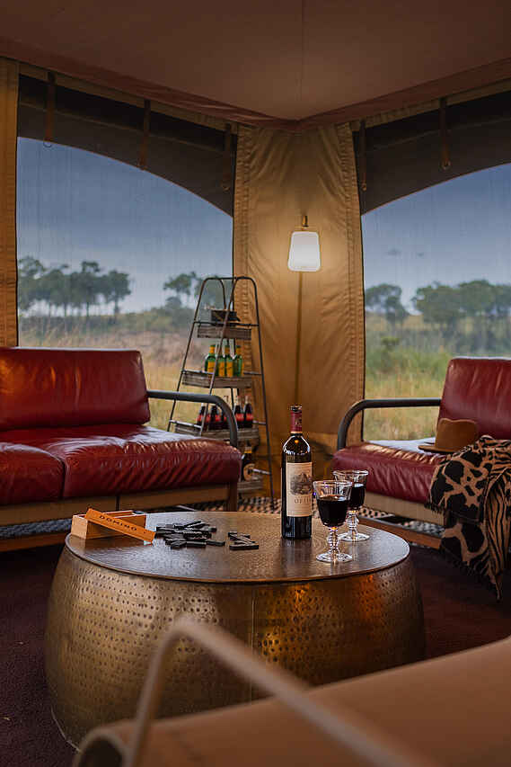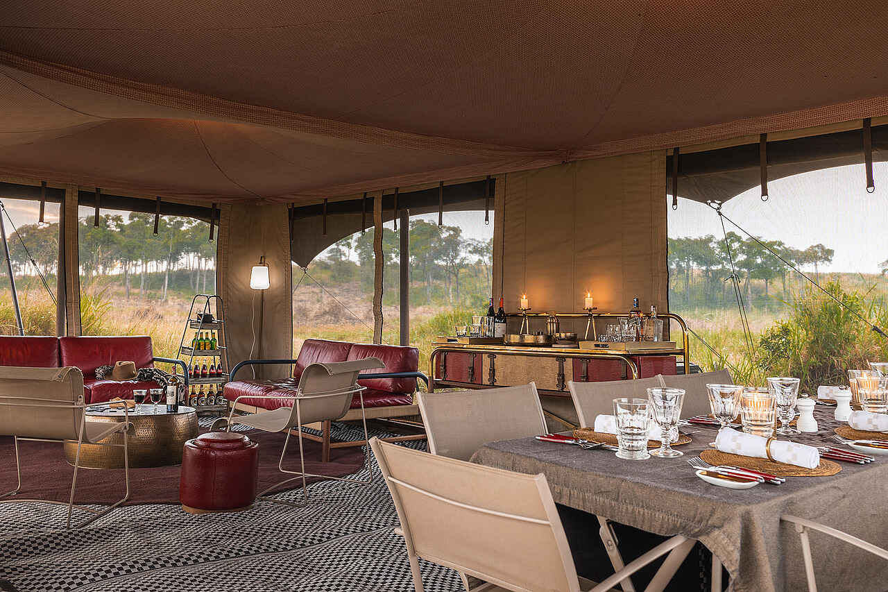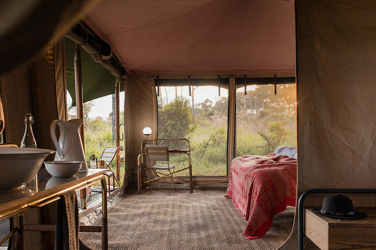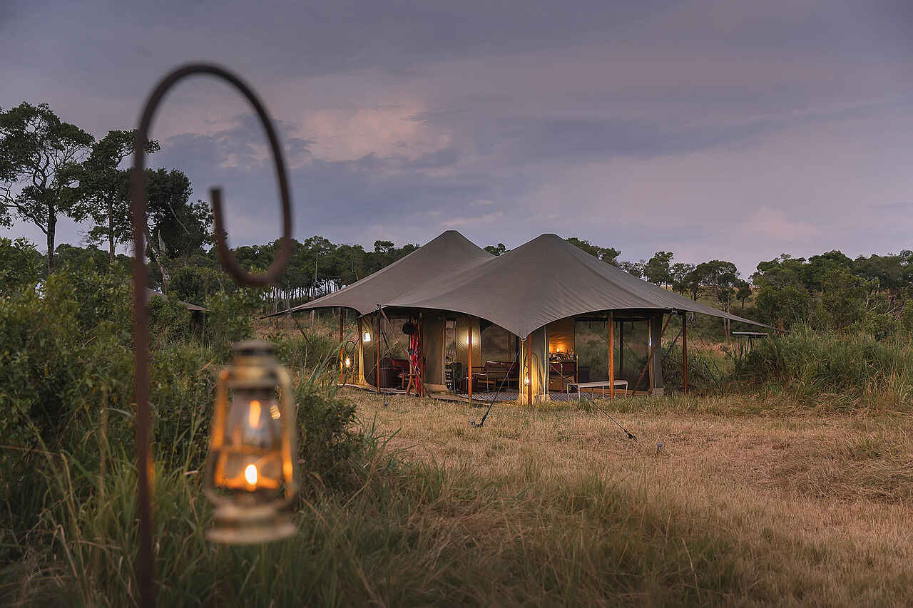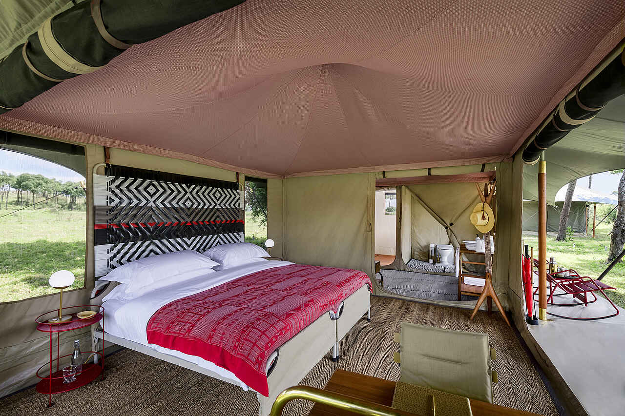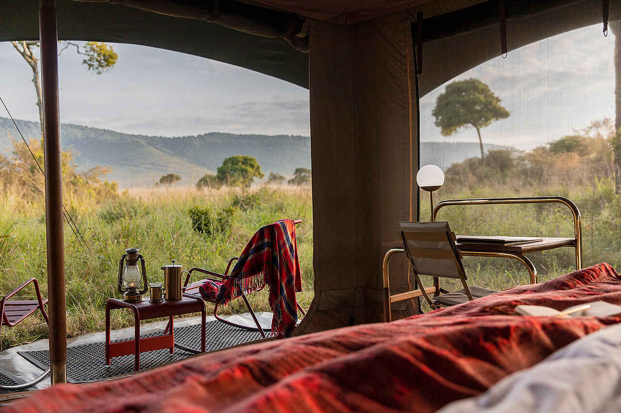 Jedes der vier Zelte verfügt über ein großes Doppelbett mit Moskitonetz, Sitzmöbel und ausreichend Ablageflächen. Die Farbgebung ist hell und erdverbunden. Die Zelte besitzen eine private Veranda mit Ausrichtung auf die Ebenen des Mara Dreiecks. Im En-suite-Badezimmer stehen eine Dusche, Waschbecken und WC zur Verfügung, ergänzt durch hochwertige Pflegeprodukte, weiche Handtücher und warmes Wasser. Kaffee und Tee werden morgens im Zelt serviert, auf Wunsch auch als Weckdienst. Die Unterkünfte sind so positioniert, dass sie deutlichen Abstand zueinander wahren und ein hohes Maß an Privatsphäre bieten. Familienzelte werden nicht angeboten, Gruppen können jedoch das gesamte Camp exklusiv buchen.