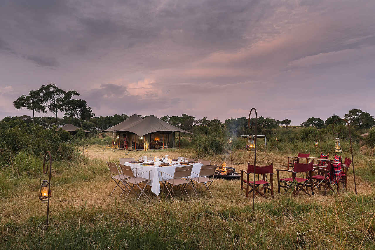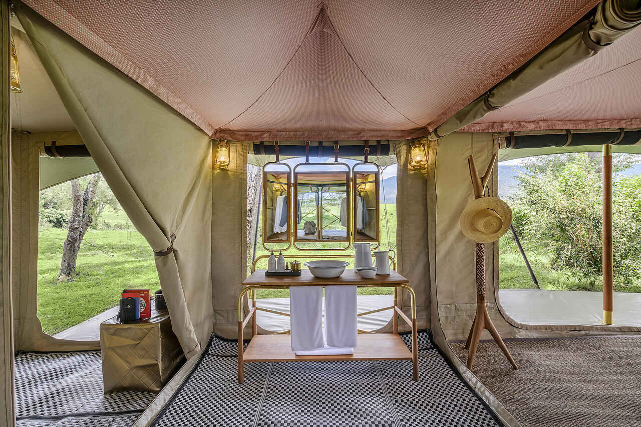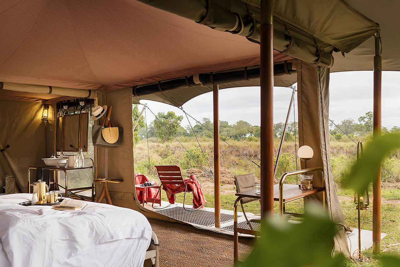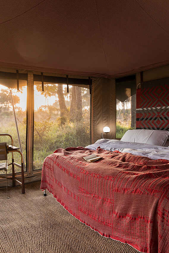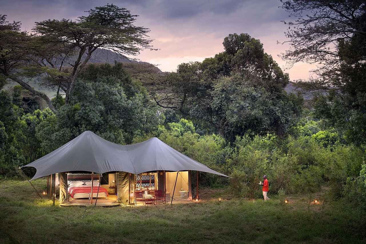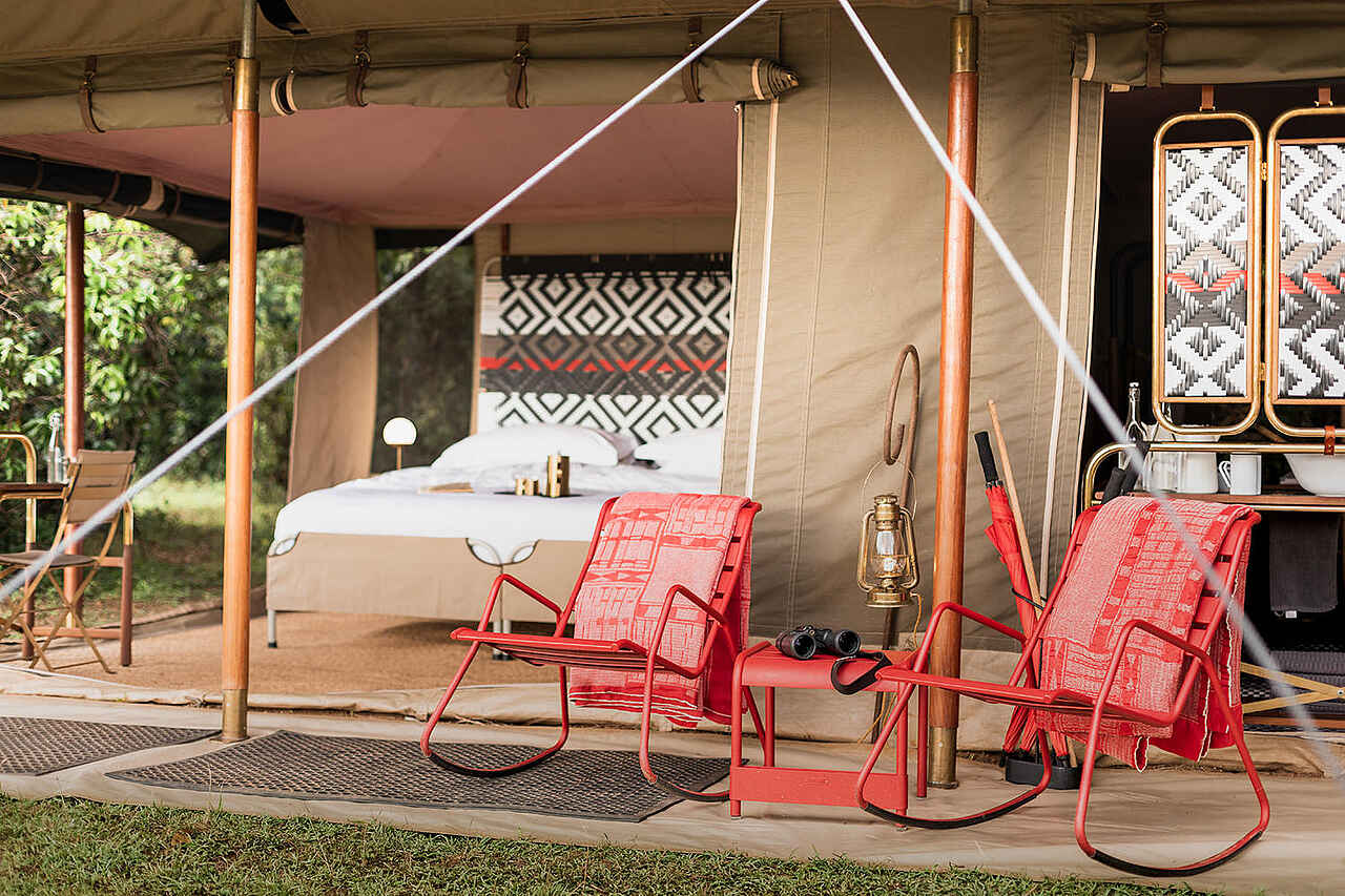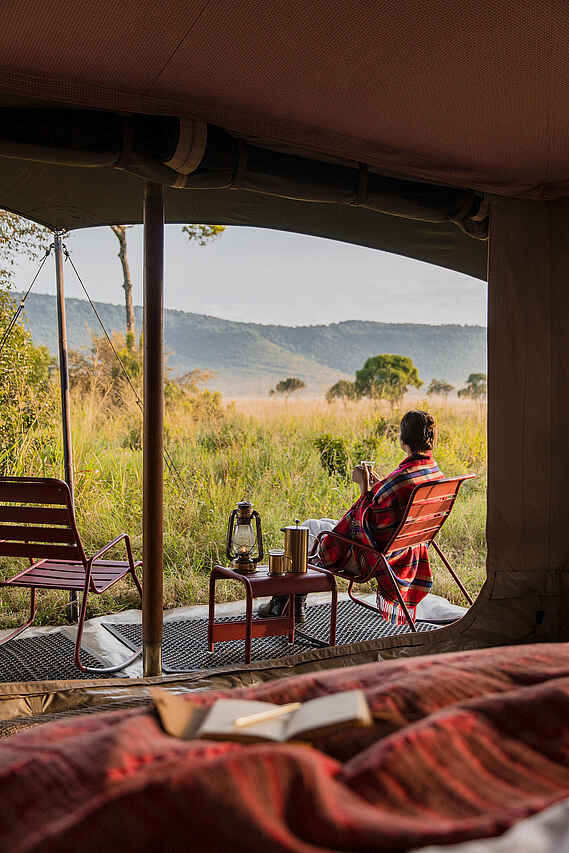 Jedes der vier Zelte verfügt über ein großes Doppelbett mit Moskitonetz, Sitzmöbel und ausreichend Ablageflächen. Die Farbgebung ist hell und erdverbunden. Die Zelte besitzen eine private Veranda mit Ausrichtung auf die Ebenen des Mara Dreiecks. Im En-suite-Badezimmer stehen eine Dusche, Waschbecken und WC zur Verfügung, ergänzt durch hochwertige Pflegeprodukte, weiche Handtücher und warmes Wasser. Kaffee und Tee werden morgens im Zelt serviert, auf Wunsch auch als Weckdienst. Die Unterkünfte sind so positioniert, dass sie deutlichen Abstand zueinander wahren und ein hohes Maß an Privatsphäre bieten. Familienzelte werden nicht angeboten, Gruppen können jedoch das gesamte Camp exklusiv buchen.