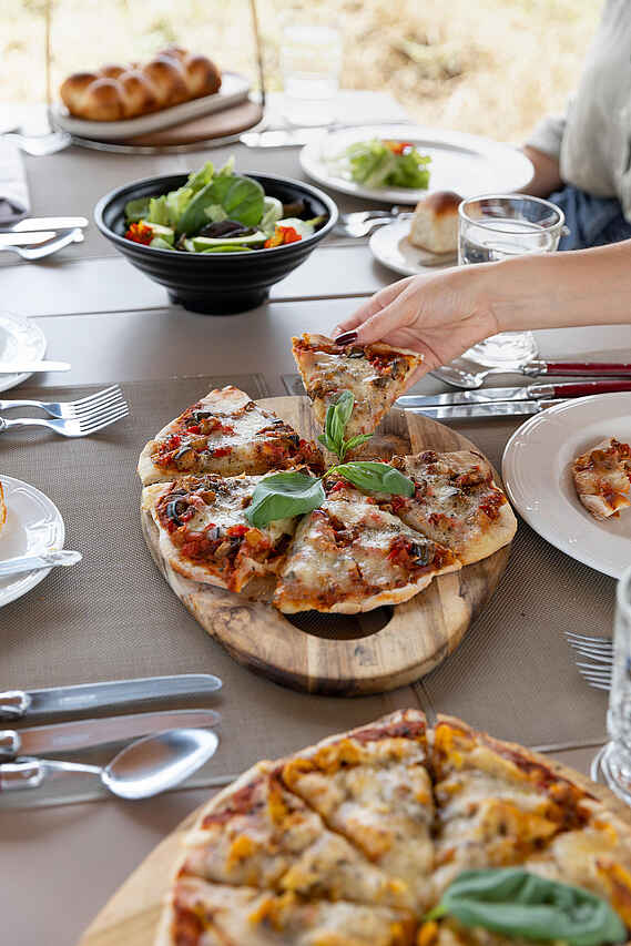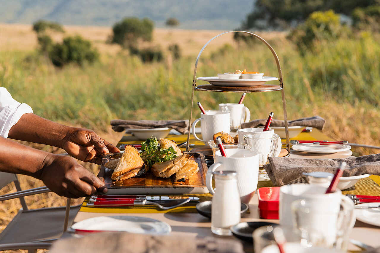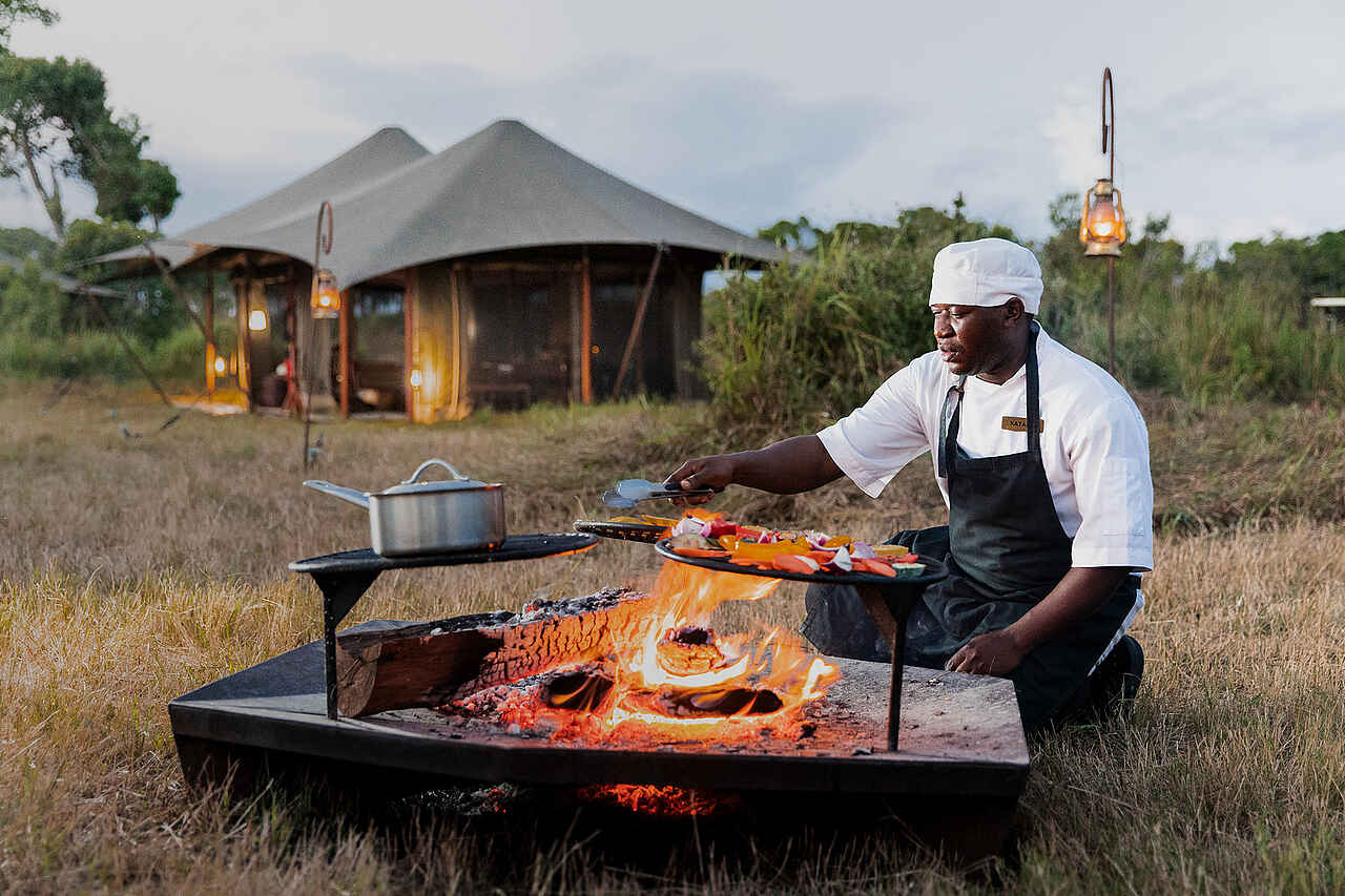 Mahlzeiten werden an einem gemeinsamen Tisch im Loungezelt oder unter freiem Himmel serviert. Frühstück kann warm im Camp oder während der Pirschfahrt eingenommen werden. Mittags wird ein leichtes Menü gereicht, abends folgt ein mehrgängiges Dinner. Alle Mahlzeiten und Getränke einschließlich Tee, Kaffee, Wasser, Softdrinks und ausgewählte Alkoholika sind inklusive. Das Küchenteam arbeitet mit klaren, frischen Gerichten, die sich gut auf individuelle Wünsche abstimmen lassen.