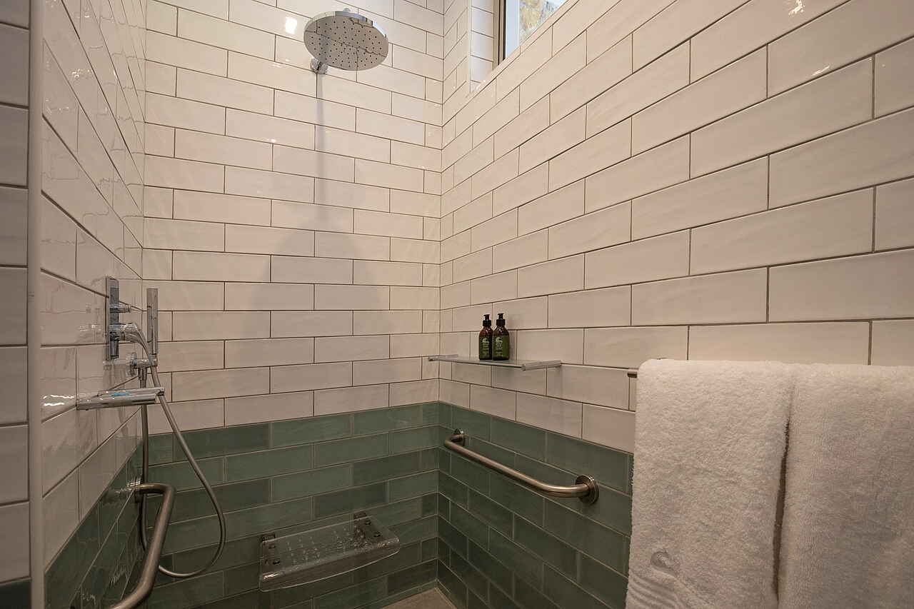 In allen Zimmern und Suiten ist die Einrichtung modern und elegant. Klare Linien, helle Fliesen- und Wandfarben bestimmen die Atmosphären. Polster und Kissen sind in aquamarinblau gehalten.