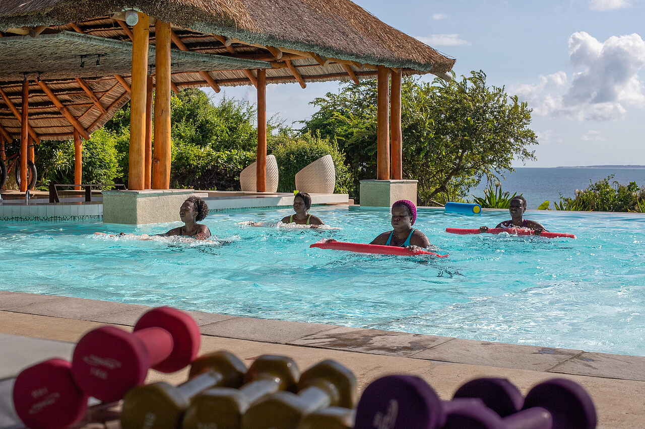 Hinter dem Haupthaus gibt es separate Einrichtungen, in denen Fitnesskurse bzw. Wellness-behandlungen angeboten werden.