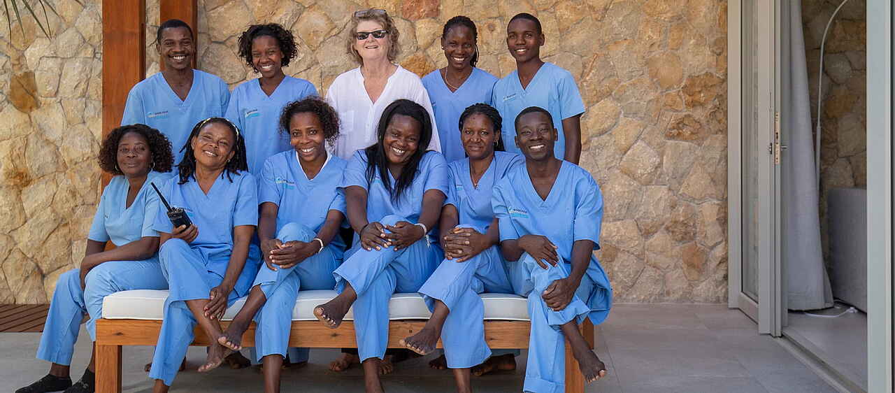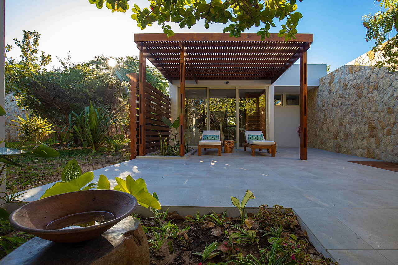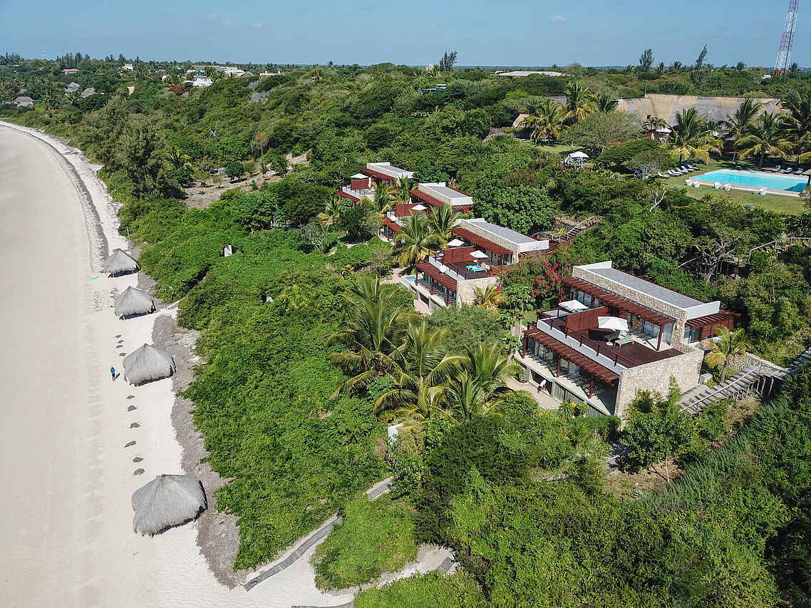 Am Hang zwischen Gartenplateau und Strand stehen vier Terrassenhäuser mit jeweils einer Beach Suite (50m²) in der unteren Etage und 2 Sea View Bedrooms (25m²) in der oberen Etage. Die südöstlichste Beach Suite ist die etwas luxuriöser ausgestattete Presidential Suite (50m²). Sie hat einen größeren privaten Plunge Pool. Außerdem gibt es 5 Garden Suites (35m²), die ohne Meerblick im Garten auf dem Plateau liegen.