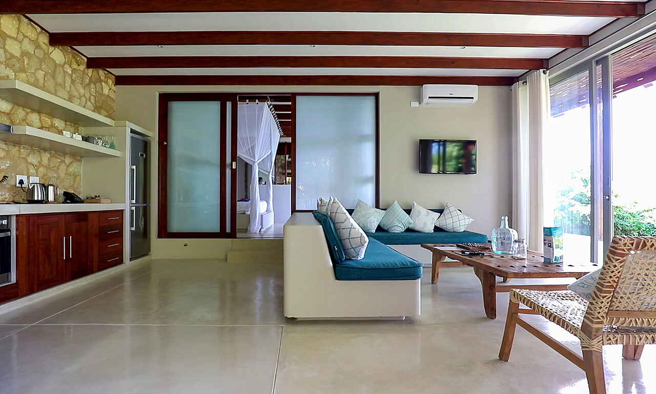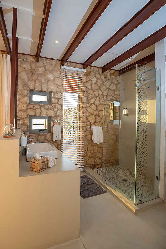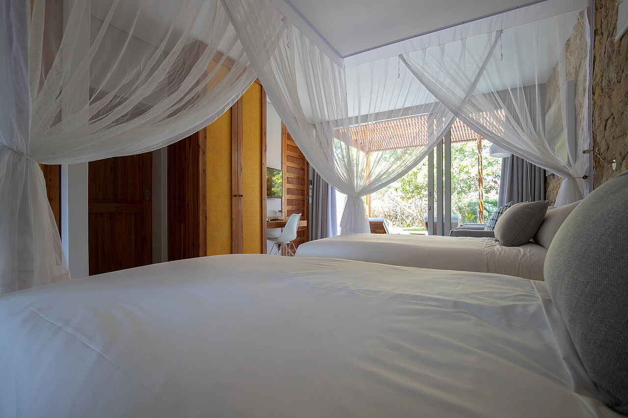 Das Beach House verfügt über zwei getrennte Schlafzimmer und Bäder. Beide sind mit Doppelbetten, Klimaanlagen, Moskitonetze. Die Bäder verfügen über Dusche, Waschbecken, WC sowie fließend Kalt- und Warmwasser.
