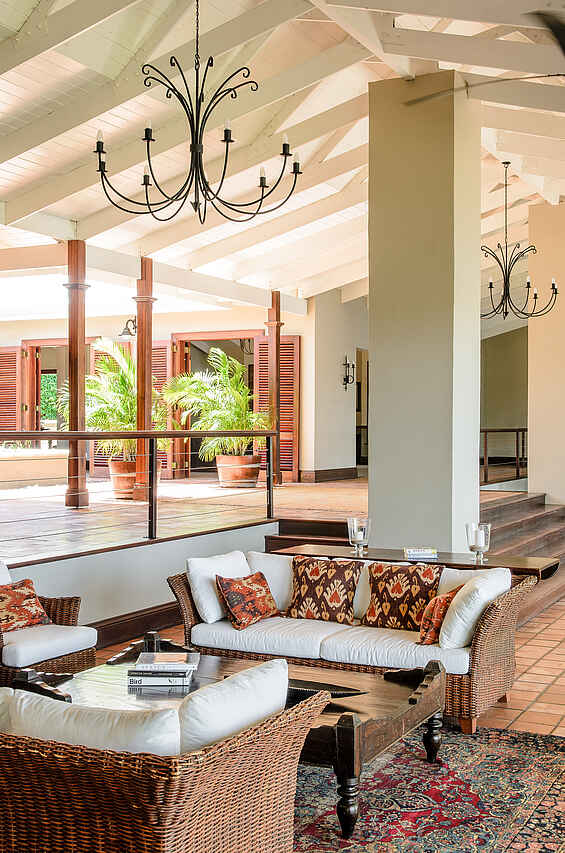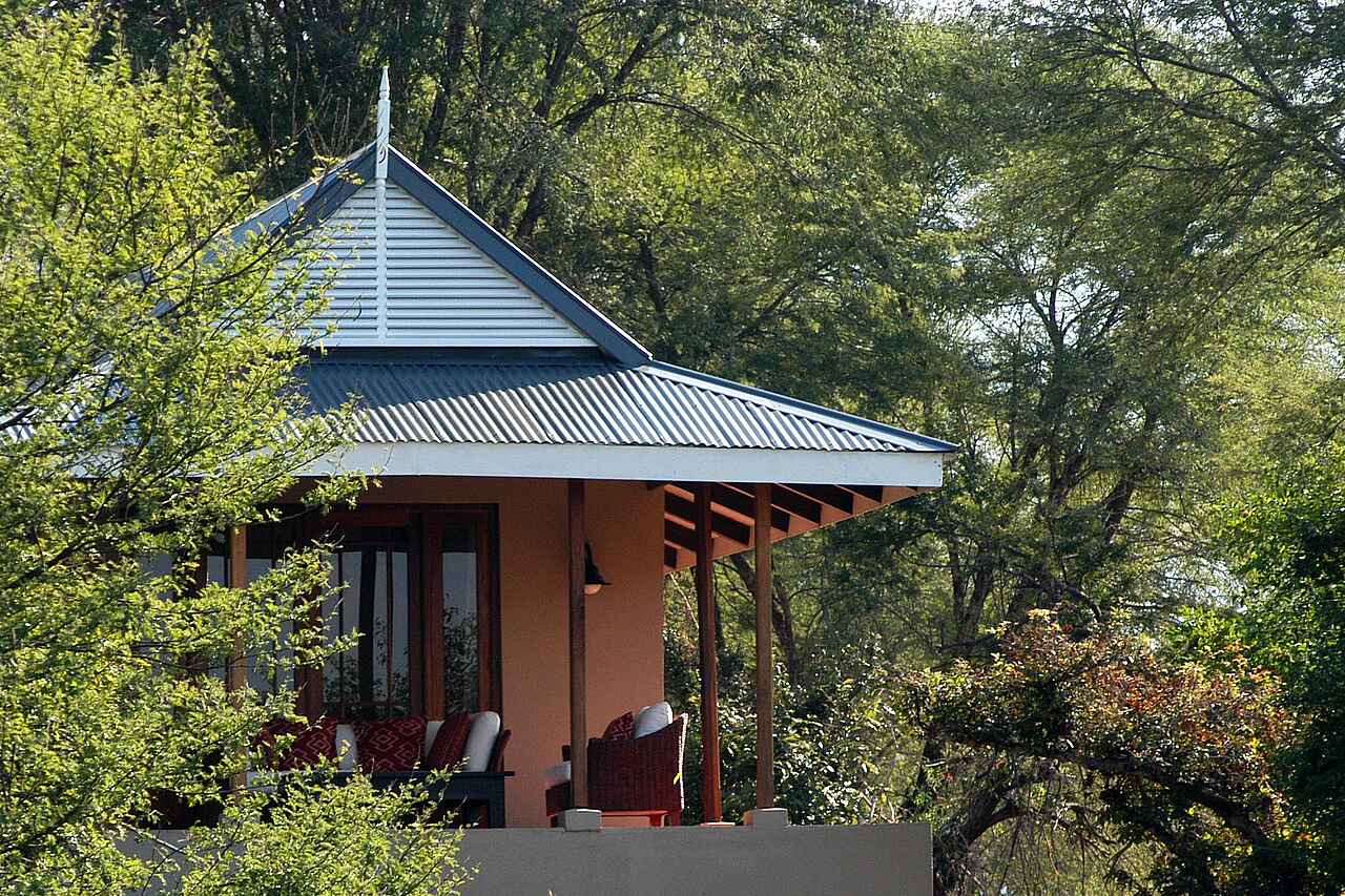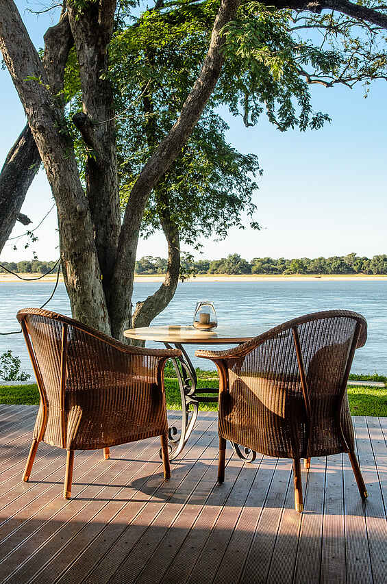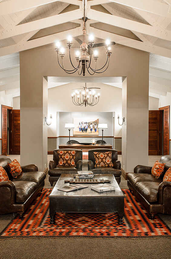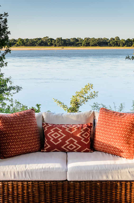 Die Lodge ist im Hauptbereich offen im Kolonialstil konzipiert: Bar mit offenem Kamin, 2 Loungebereiche mit komfortablen Sofas und Sesseln, Essbereiche mit Tischen im Innen- und Außenbereich sowie der Pool bieten Blick auf den Fluss Sambesi.