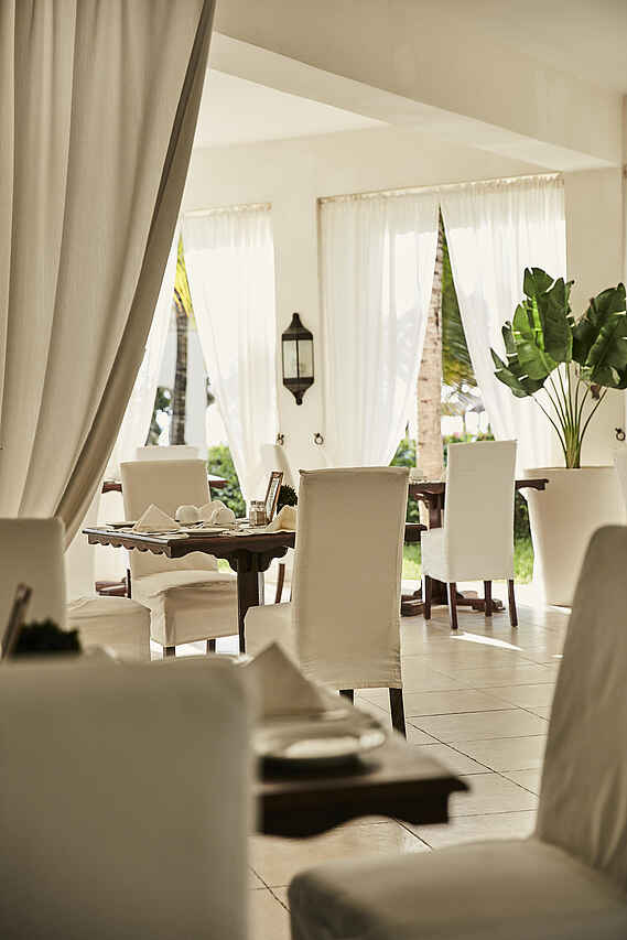 Die Gerichte des Baraza Resort & Spa Zanzibar spiegeln die Vielfalt der lokalen Produkte wider und bieten eine abwechslungsreiche Fusionsküche aus den kulinarischen Kulturen Afrikas, Asiens, Indiens und Persiens. Das Livingstone Terrace serviert ein reichhaltiges Frühstücksbuffet. Das Abendessen findet abwechselnd in den beiden Restaurants Livingstone Terrace und The Sultans Dining Room statt. Der Dresscode für Männer sind lange Hosen. Mittagessen in Form von traditionellen leichten Speisen, Salaten, Pizza und einer großen Auswahl an Tagesgerichten des Küchenchefs genießt man entweder am Poolrestaurant Ocean Lounge oder ganz entspannt am Strand unter dem Sonnenschirm. Nachmittags serviert die Chai Lounge Nachmittagstee, in der Dhahabu Bar & Lounge erhält man abends erfrischende Getränke und Cocktails. Alle Mahlzeiten und lokale Getränke sind im All-Inclusive-Angebot enthalten.