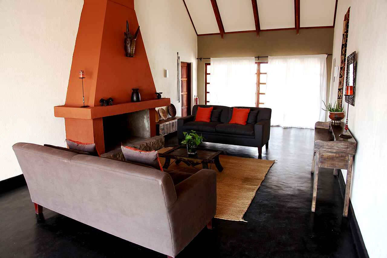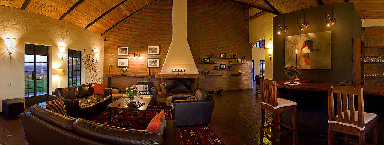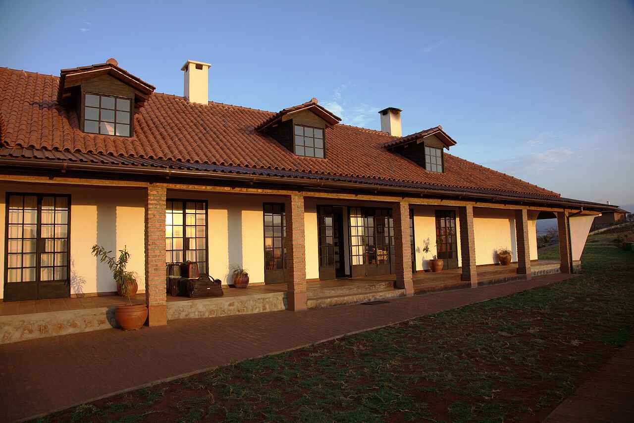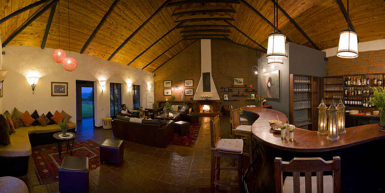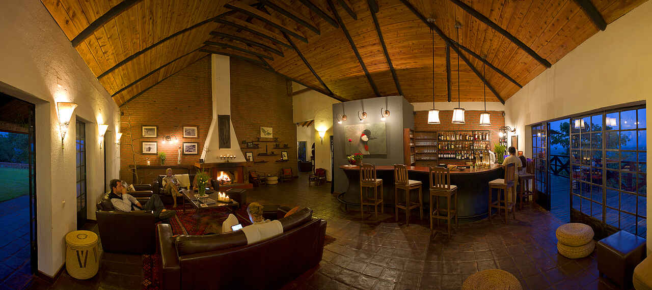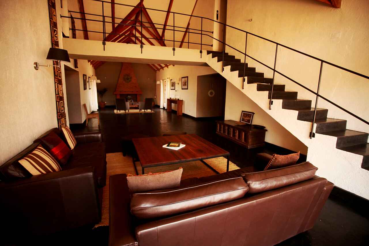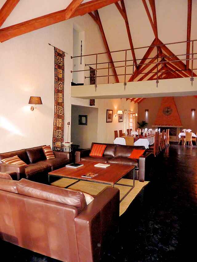 Im Haupthaus, das auf einem Hügel liegt, eine Lounge mit Bar und offenem Kamin, Speisesaal ebenfalls mit offenem Kamin. Kleiner Nebensalon. Rezeption. Von der Terrasse vor dem Haupthaus weiter Westblick ein großer Swimming Pool. Daneben das Poolhaus mit Umkleiden, Dusche und Toilette. Etwa 10% des Geländes auf dem die Lodge liegt werden als Garten für die Gäste und Kräuter- und Gemüsegarten für die Küche genutzt. Alle Gebäude liegen in einer parkähnlichen Anlage.