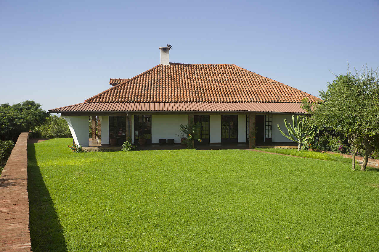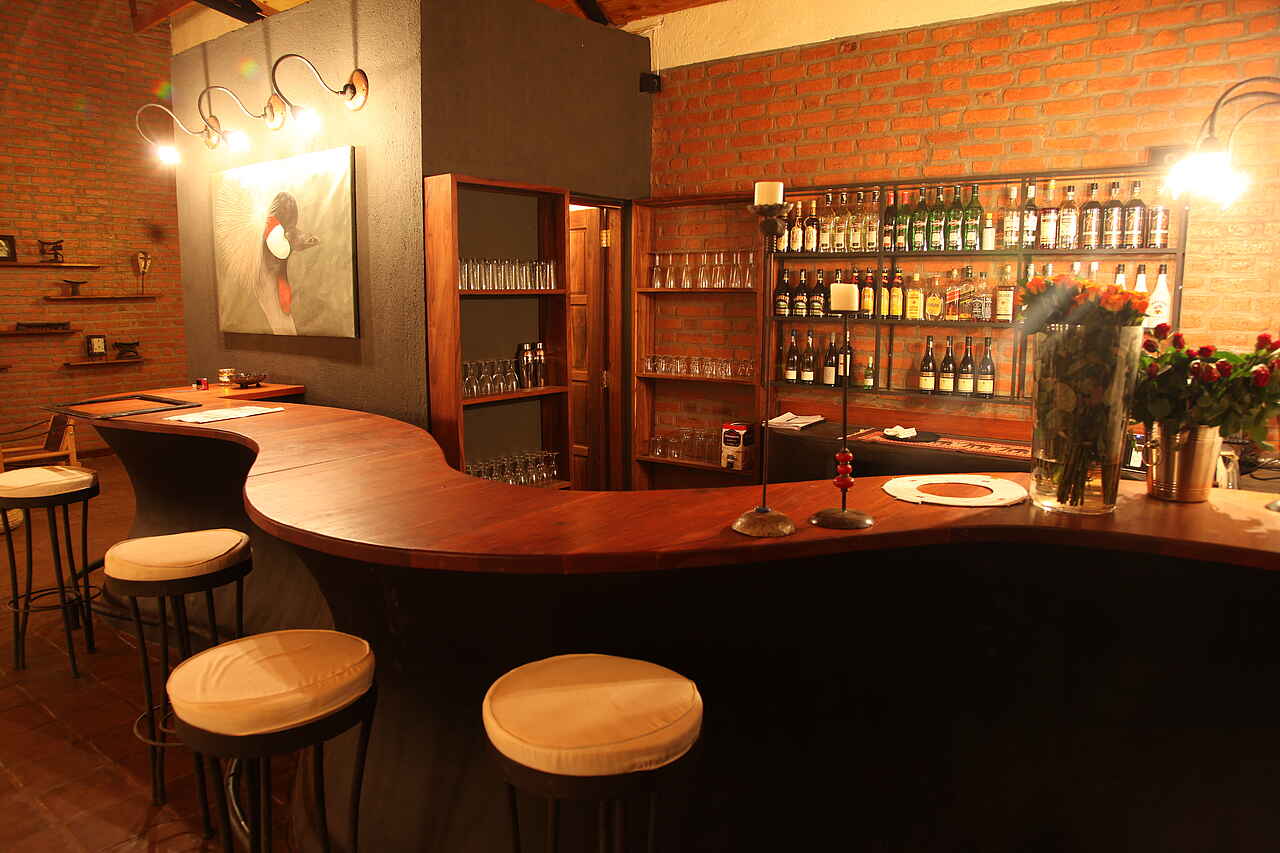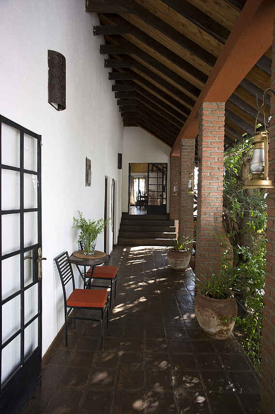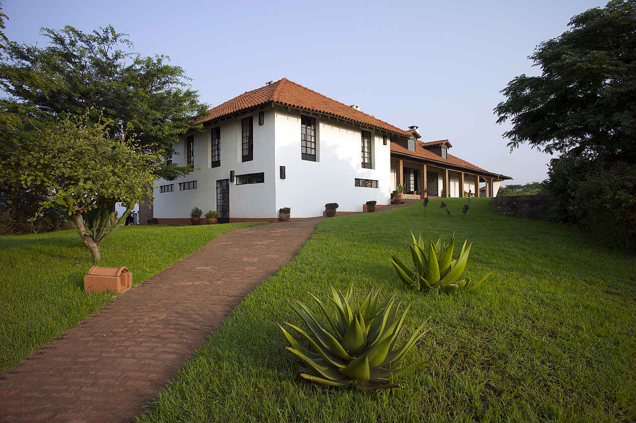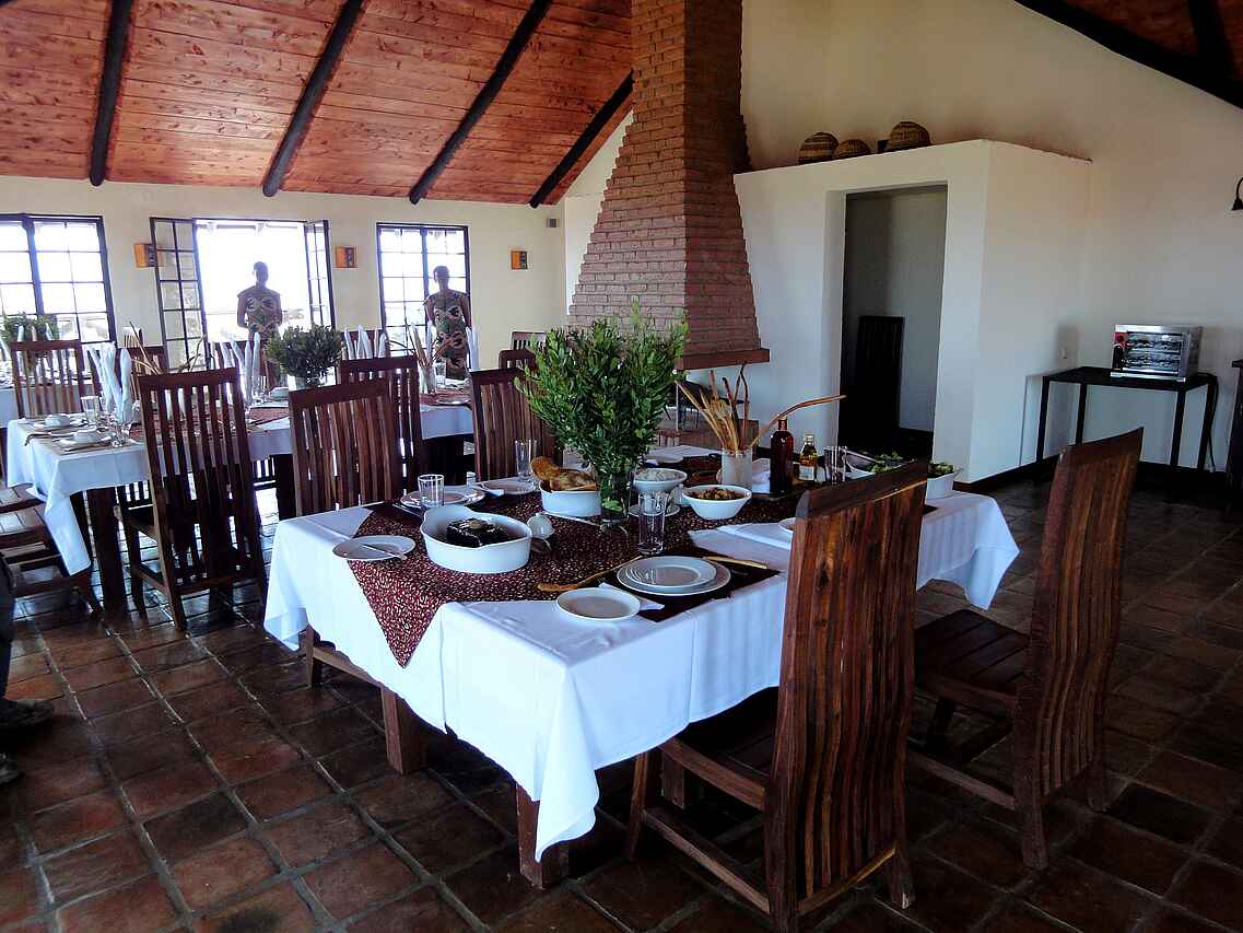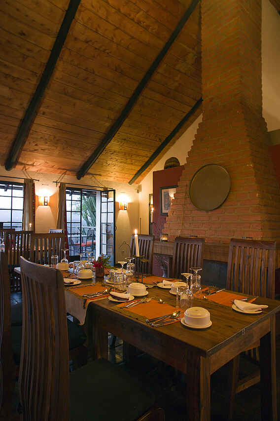 Im Haupthaus, das auf einem Hügel liegt, eine Lounge mit Bar und offenem Kamin, Speisesaal ebenfalls mit offenem Kamin. Kleiner Nebensalon. Rezeption. Von der Terrasse vor dem Haupthaus weiter Westblick ein großer Swimming Pool. Daneben das Poolhaus mit Umkleiden, Dusche und Toilette. Etwa 10% des Geländes auf dem die Lodge liegt werden als Garten für die Gäste und Kräuter- und Gemüsegarten für die Küche genutzt. Alle Gebäude liegen in einer parkähnlichen Anlage.