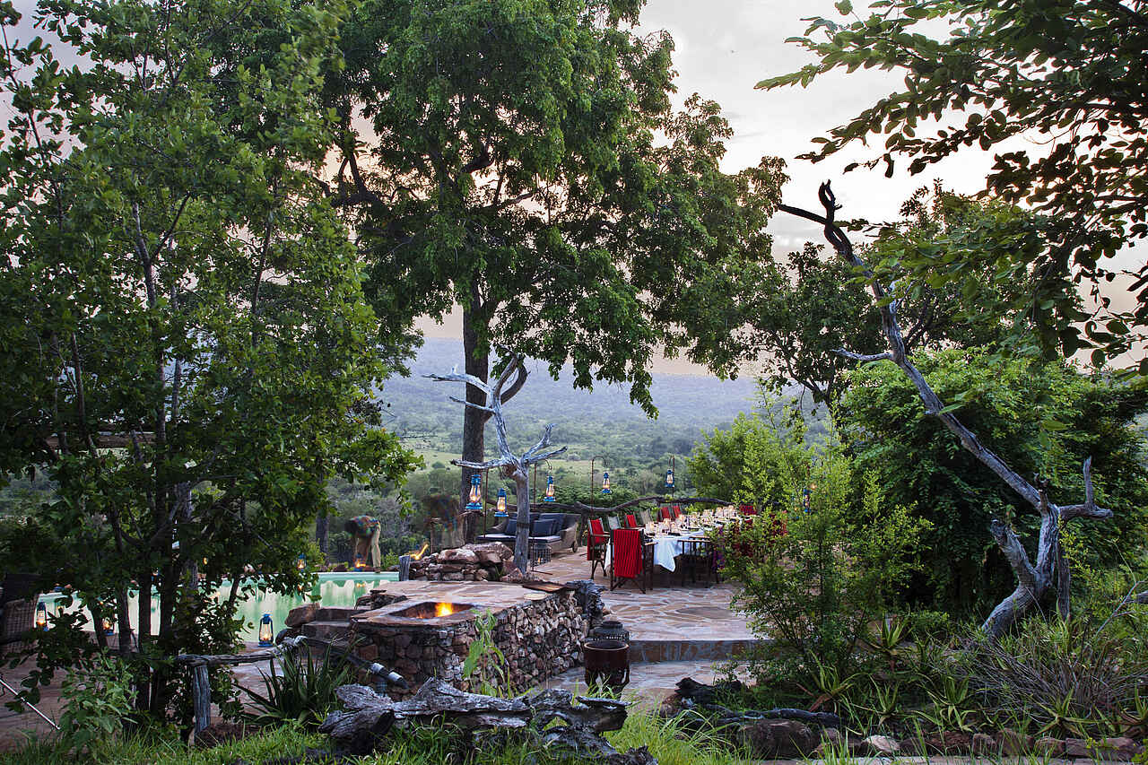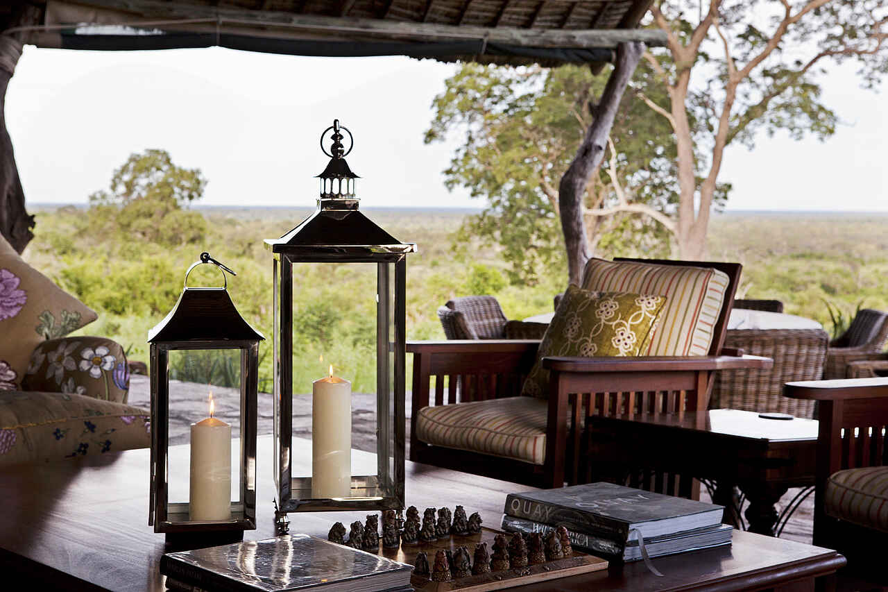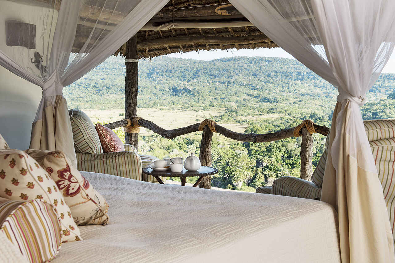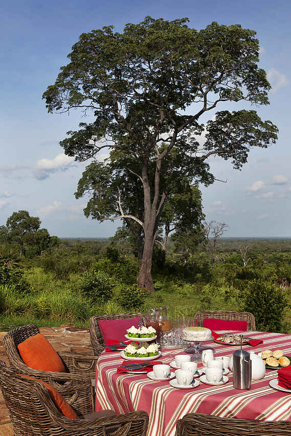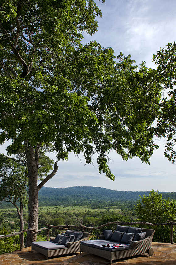 Das Beho Beho Camp liegt auf einem Hügel im kühlen Hochland des Selous Game Reserve im Süden Tansanias. Aussicht auf die Rufiji-Flussebene und Baobab-Bäume.