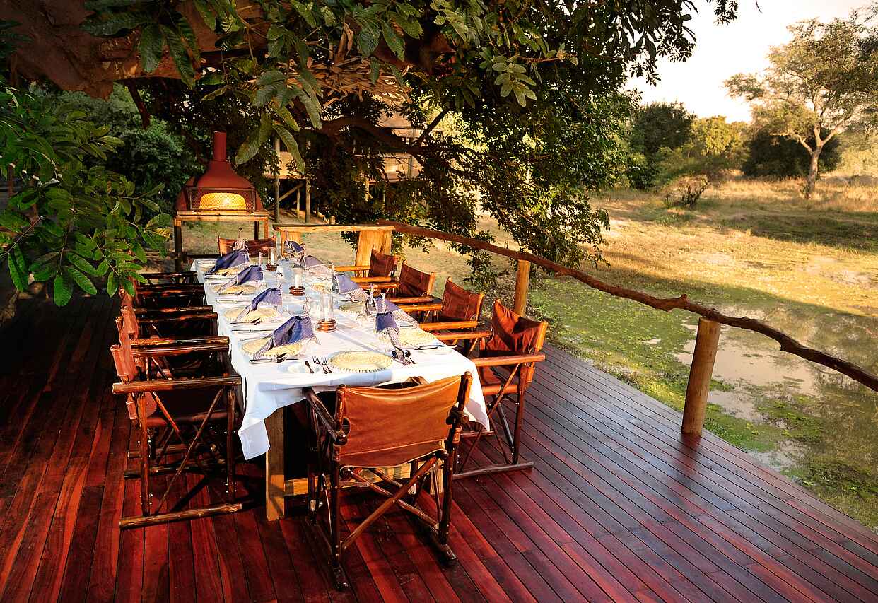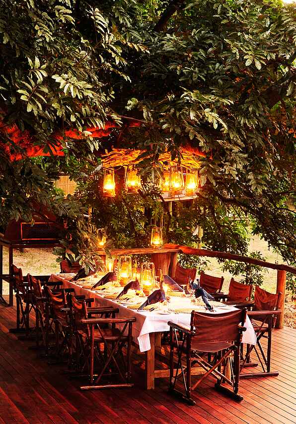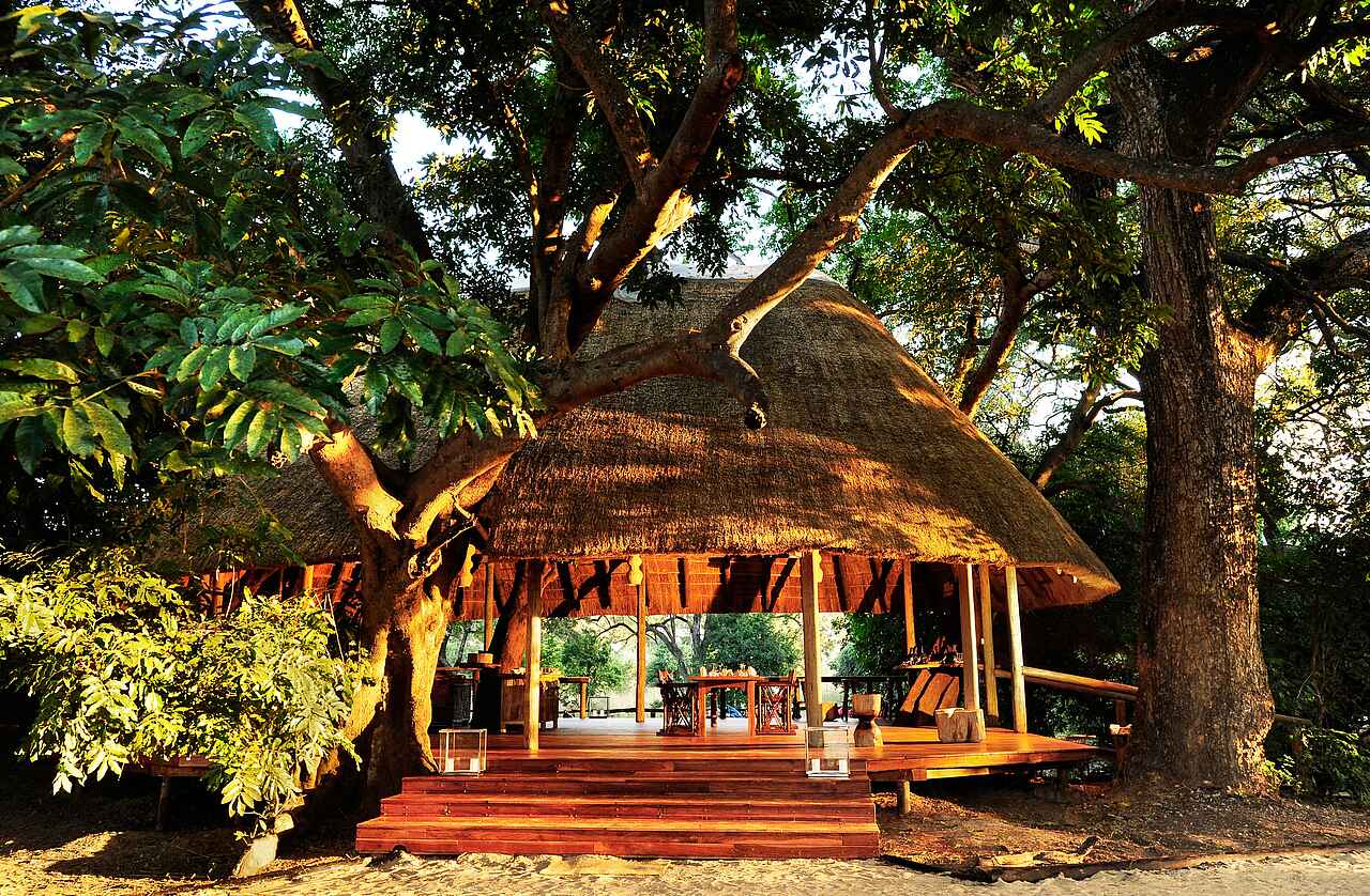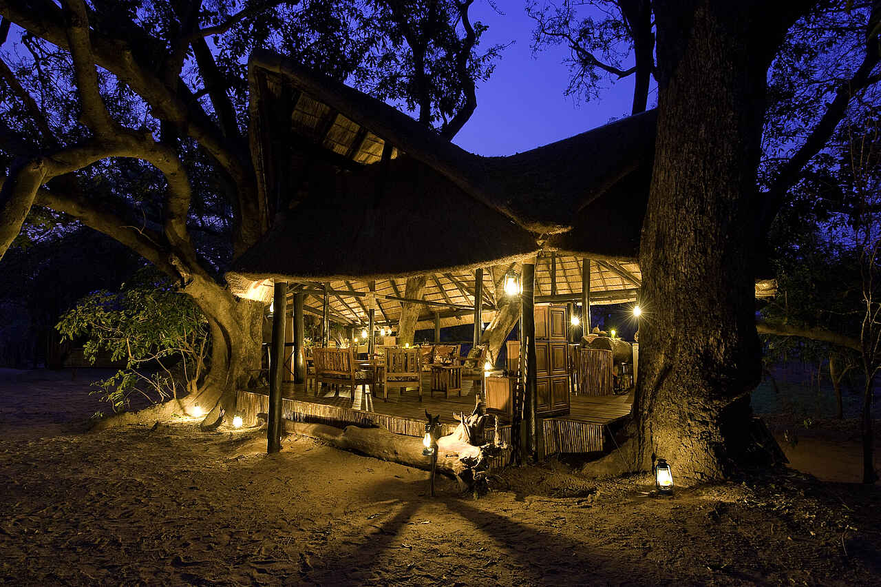 Zentraler Bereich reetgedeckt inmitten von hochgewachsenen Mahagonibäumen, gemütliche Lounge mit Rattan-Möbeln, Bibliothek, Bar, Aussichtsdeck. Etwas tiefer größeres Deck auf Stelzen, gemütliche Sessel und Tische, Blick auf das Wasserloch in der Senke. Bar auf Rückseite mit Sitzmöglichkeiten unter freiem Himmel. Bushcamp ist nicht eingezäunt: Wildhüter sorgen für Sicherheit. Gäste werden am Abend von den Lounge-Bereichen zum Chalet eskortiert. Kostenloser Wäscheservice. Rechnungen werden in der Mfuwe Lodge beglichen. Zugang für Behinderte auf Anfrage. Zimmerservice: Toilettenartikel werden täglich aufgefüllt.