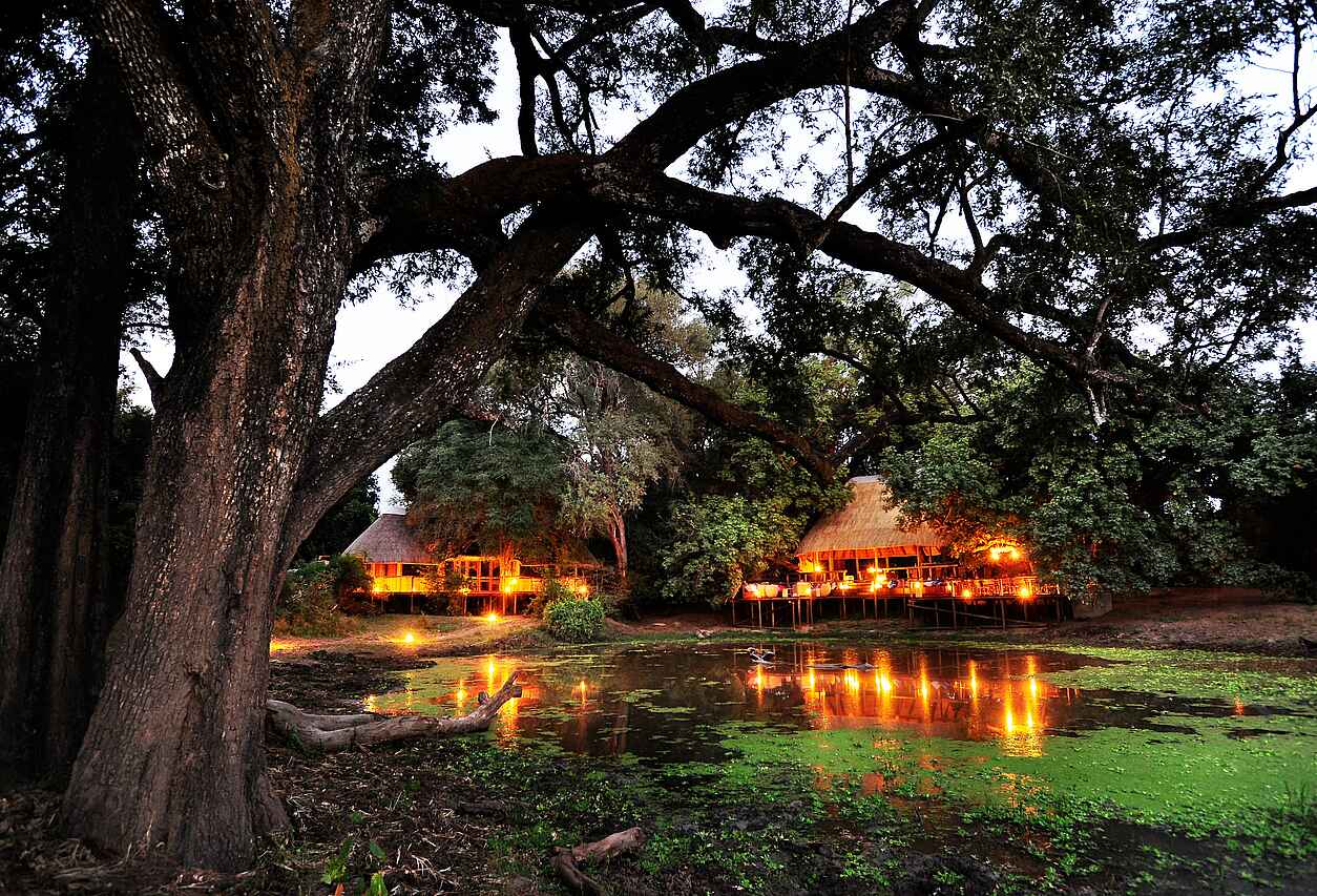 4 im Wald, an den Resten eines Altarms des Luangwa gelegene Gästechalets und ein Zentralgebäude. Flussufer liegt außerhalb, etwa 100 Meter entfernt.