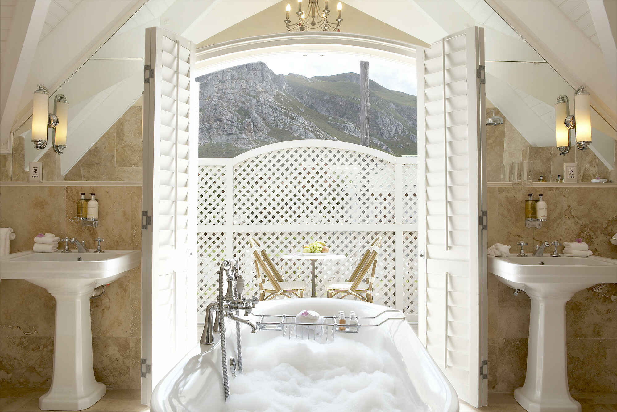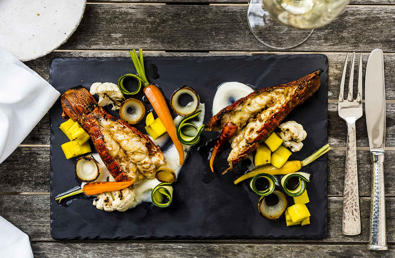 Dreimal täglich genießen Gäste feine Küche, begleitet von ausgewählten Weinen, Cocktails und Spirituosen. Die Gerichte verbinden südafrikanische Kochkunst mit französischen, italienischen und asiatischen Einflüssen. Frischer Fisch und Meeresfrüchte aus der Region stehen ebenso auf dem Menü wie Produkte aus dem nahen Umland. Mal wird im eleganten Speisesaal mit Blick auf das Meer serviert, mal im offenen Glaspavillon oder auf der Terrasse über den Klippen. Wer es privat mag, bestellt das Dinner in die eigene Suite. Alle Mahlzeiten sowie Getränke sind im Aufenthalt inklusive, ausgenommen sind nur Premium-Spirituosen und Reserve-Weine.