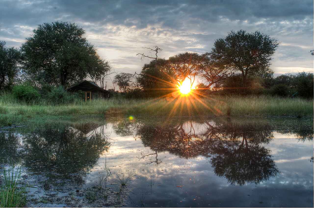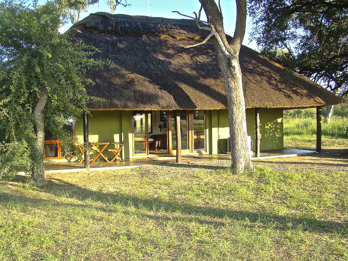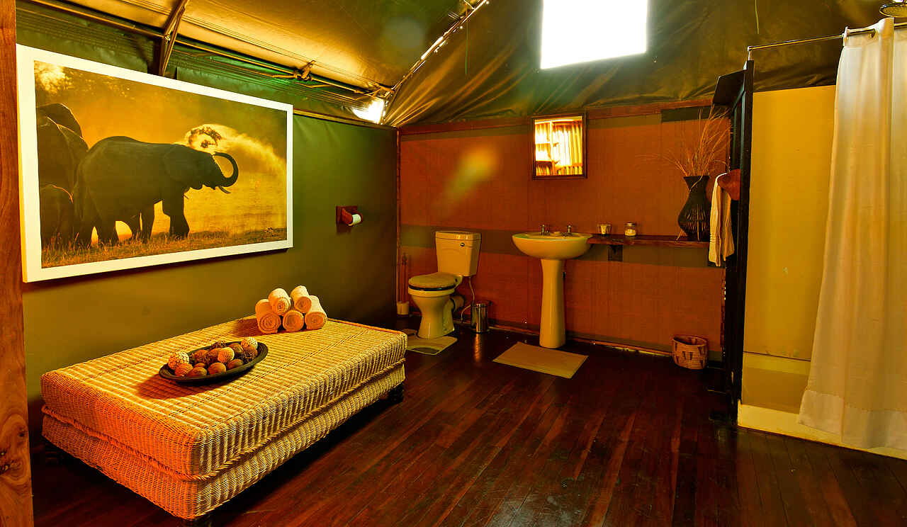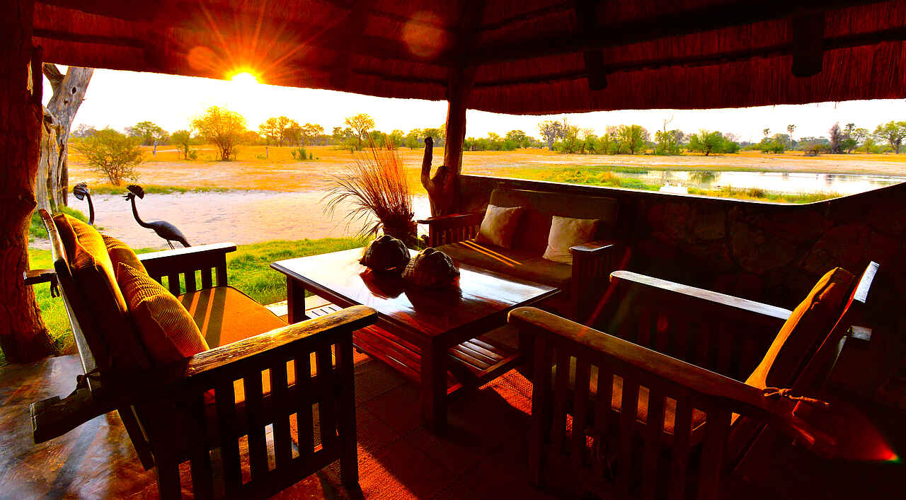 Fünf „Hornbill Tents“: auf Stelzen gebaute überdachte Zelte, Blick auf die Ebene von Ngamo Vier „Spurwing Suites“: ebenerdige Zelte, Blick auf das Wasserloch, private Terrasse Ausstattung: Bad en suite mit fließend heißem Wasser, Dusche, WC; Ventilatoren; Doppelbett; Couch und kleiner Tisch