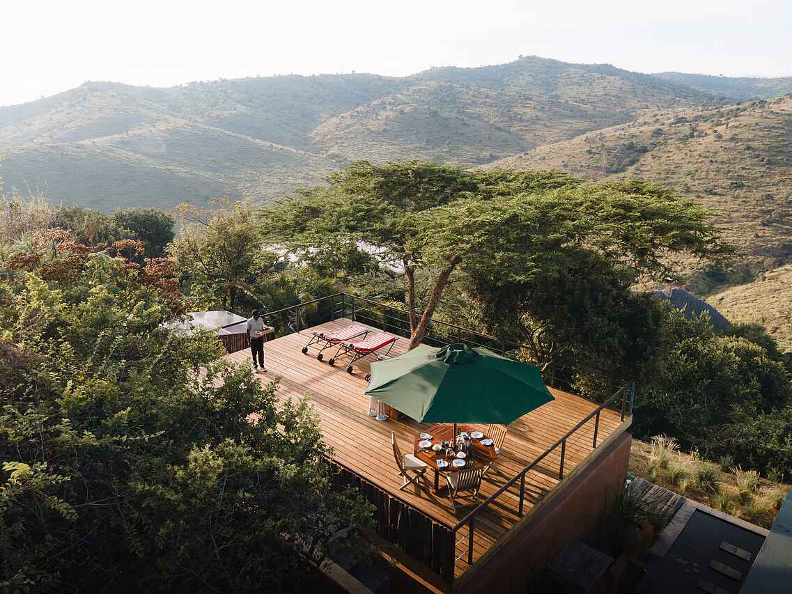 Ergänzt wird das Angebot durch ein kleines Spa, in dem verschiedene Massagen und Wellnessanwendungen in ruhiger Umgebung angeboten werden. Am Fuß des Hügels befindet sich ein diskret gelegenes Fotoversteck mit Blick auf eine Wasserstelle mit Salzlecke. Von dort aus lassen sich Wildtiere aus nächster Nähe und auf Augenhöhe beobachten, ungestört und auf Wunsch begleitet von einem Picknickkorb mit Snacks und kühlen Getränken.