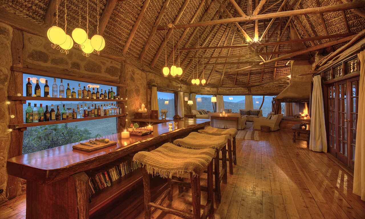 Der zentrale Bereich der Borana Lodge umfasst einen offenen, einladenden Wohnraum mit zwei Kaminen, Lounge, Bar und Essbereich, jeweils mit Blick auf ein belebtes Wasserloch unterhalb der Lodge. Naturstein, warmes Holz und handgefertigte Möbel schaffen eine stilvolle und zugleich entspannte Atmosphäre. Der Pool liegt inmitten der Felsenlandschaft und bietet an warmen Nachmittagen eine erfrischende Abkühlung. Eine erhöhte Terrasse mit Feuerstelle eignet sich hervorragend für Sundowner und nächtliche Sternenbeobachtungen.