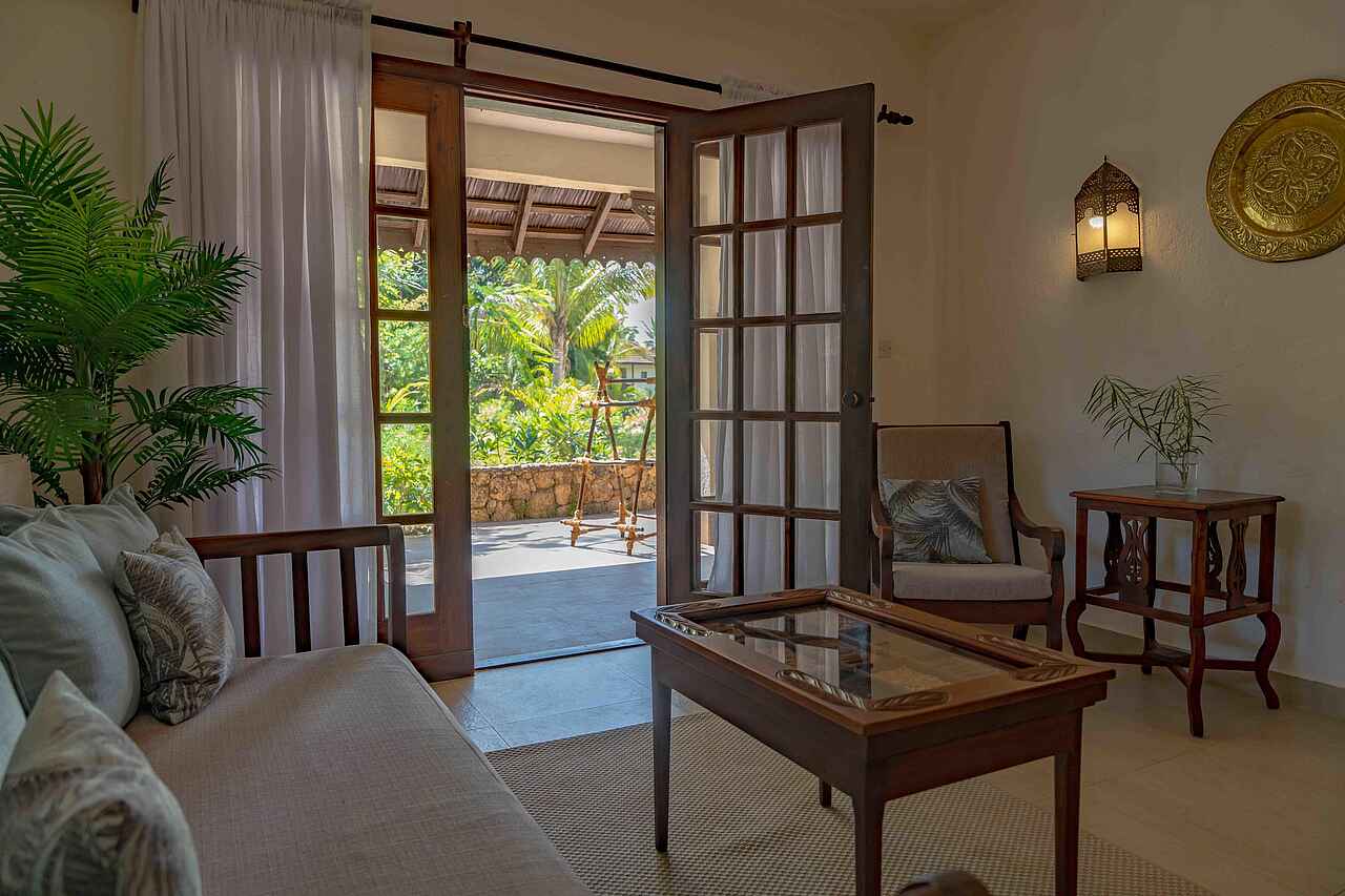 Die 74 Zimmer und Suiten des Breezes Beach Club & Spa Zanzibar sind im traditionellen Swahili-Stil eingerichtet. Sie befinden sich in mehreren Bungalows, die im tropischen Garten verteilt liegen. Die geräumigen Zimmer und Suiten verfügen über einen Loungebereich, ein Moskitonetz, eine Klimaanlage, einen Tee-/Kaffeezubereiter, einen Safe, einen kleinen Kühlschrank sowie eine private Terrasse oder einen Balkon mit einem Ständer für nasse Handtücher und Badekleidung. Das Sofa lässt sich in ein zusätzliches Bett umwandeln, das eigene Badezimmer ist mit modernen Annehmlichkeiten wie Dusche, Toilette, Haartrockner, Handtüchern und Pflegeprodukten ausgestattet. Die 10 Garten-Zimmer befinden sich alle in einstöckigen Bungalows im hinteren Bereich des Gartens und bieten Sicht auf die einheimischen Blumen und Bäume. Die 44 Deluxe-Zimmer und 20 Suiten liegen im vorderen Teil des Hotels und verfügen je nach Lage über einen schönen Blick auf den Garten oder den Indischen Ozean. Einige der sich im Erdgeschoss befindenden Deluxe-Zimmer haben Verbindungstüren und sind besonders für Familien geeignet. Die Suiten im ersten Stock der Bungalows haben zusätzlich ein separates Ankleidezimmer und einen großen Balkon mit Sonnenliegen.