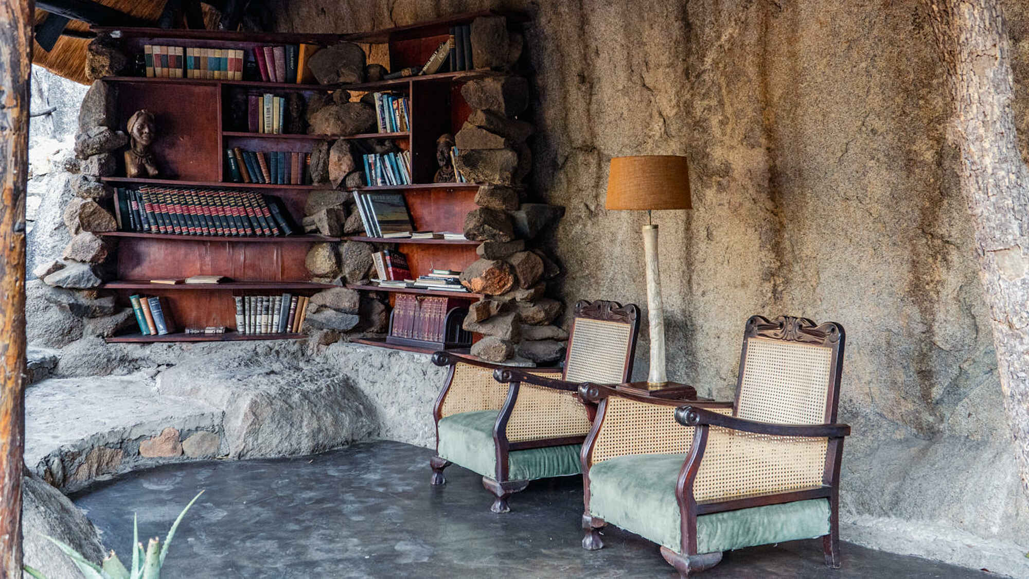 Im Herzen der Lodge befindet sich ein offener Lounge- und Restaurantbereich, eingerahmt von riesigen Granitblöcken. Der Blick schweift über geschichtsträchtige Felsen, während Gäste entspannen oder Mahlzeiten genießen. Ein großer Naturpool, direkt in Stein eingelassen, sorgt für Abkühlung. Bequeme Sitzgelegenheiten und ein rustikaler Essbereich laden zum Verweilen ein. Ergänzt wird das Angebot durch einen kleinen Weinkeller, ein Spa für Anwendungen und einen Feuerplatz unter freiem Himmel. Die Atmosphäre ist ruhig, nur Wind, Vogelstimmen und das gelegentliche Klirren von Gläsern in guter Gesellschaft begleiten den Aufenthalt.