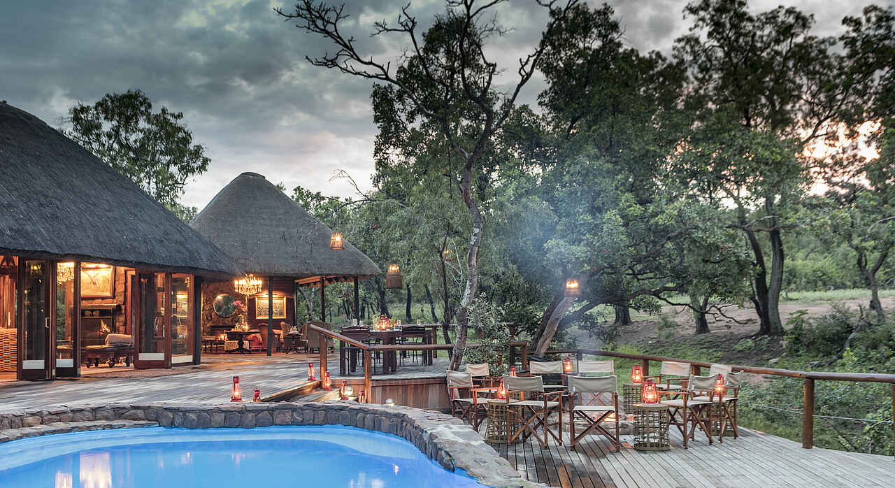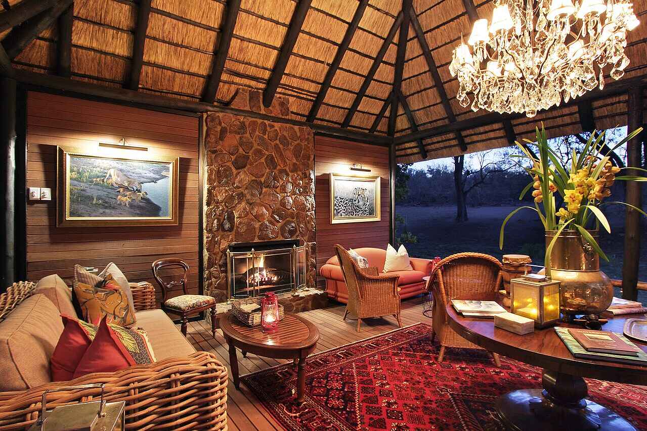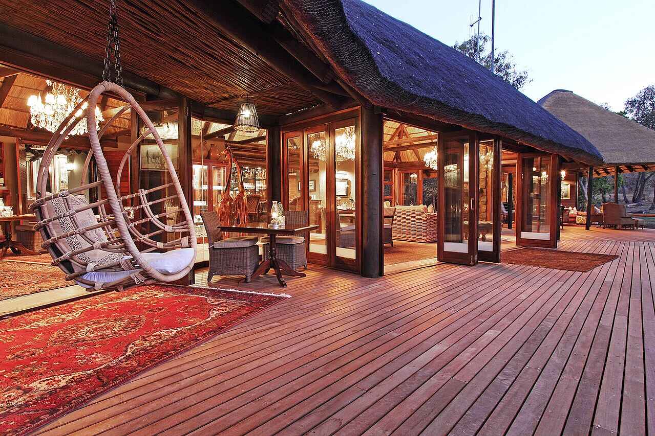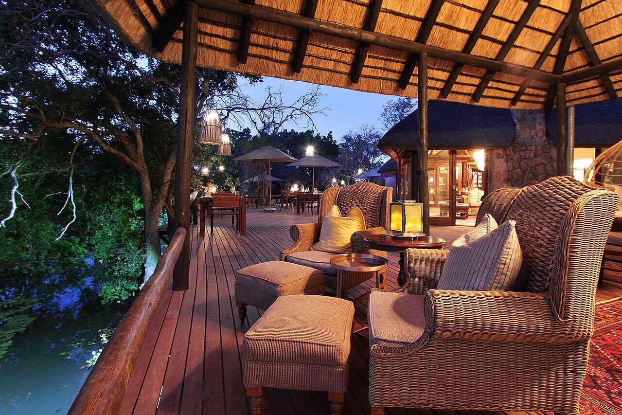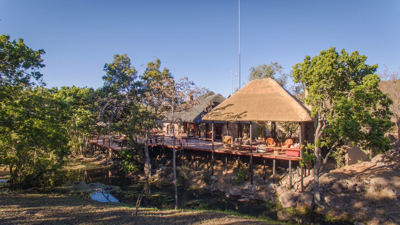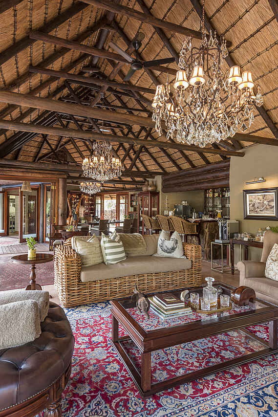 Als Hauptlodge ein strohgedecktes Langhaus mit ca. 5 Meter hohem Dachfirst, strohgedeckt, offener Dachstuhl. Hier befinden sich die Küche, WCs, in einem großen Raum der Essbereich, Bar und Lounge. Die Rezeption befindet sich in einem leicht abgesetzten Gebäude. Das Interieur mit boutiquehaftem Charakter, mit ausladenden Lüstern, Perserteppichen, Lederstühlen und Plüschsofas, offenen Kaminen, Kristallgläsern und Silberbesteck, solide gerahmte Tieraufnahmen, großen Vitrinen. Die Fassade der Hauptlodge in Richtung Bach offen, durch große Panoramafenstertüren verschließbar; eine wohlsortierte Bar aus bearbeitetem Naturstein als Übergang von Essbereich zur Lounge; hier vor offenem Kamin Plüsch- und Ledermöbel vor einem niedrigen Tisch.Sehr große Terrasse, mit Grundfläche ähnlich der Hauptlodge. Große Sitzmuscheln aus Korb am überkragenden Dach; mehrere Tischgruppen mit Korbstühlen über das Deck verteilt. Ein große Holzlaube steht separat und fungiert als Outdoorlounge, mit Blick von lederbezogenen Sesseln ins Gelände. Etwas abgesetzt über eine kleine Treppenflucht erreichbar eine Feuerstelle, daneben ein Pool in Natursteinfassung, von mehreren Liegen und Sonnenschirmen gesäumt. Weiterhin separat ein Gym, Spa und Curio Shop.