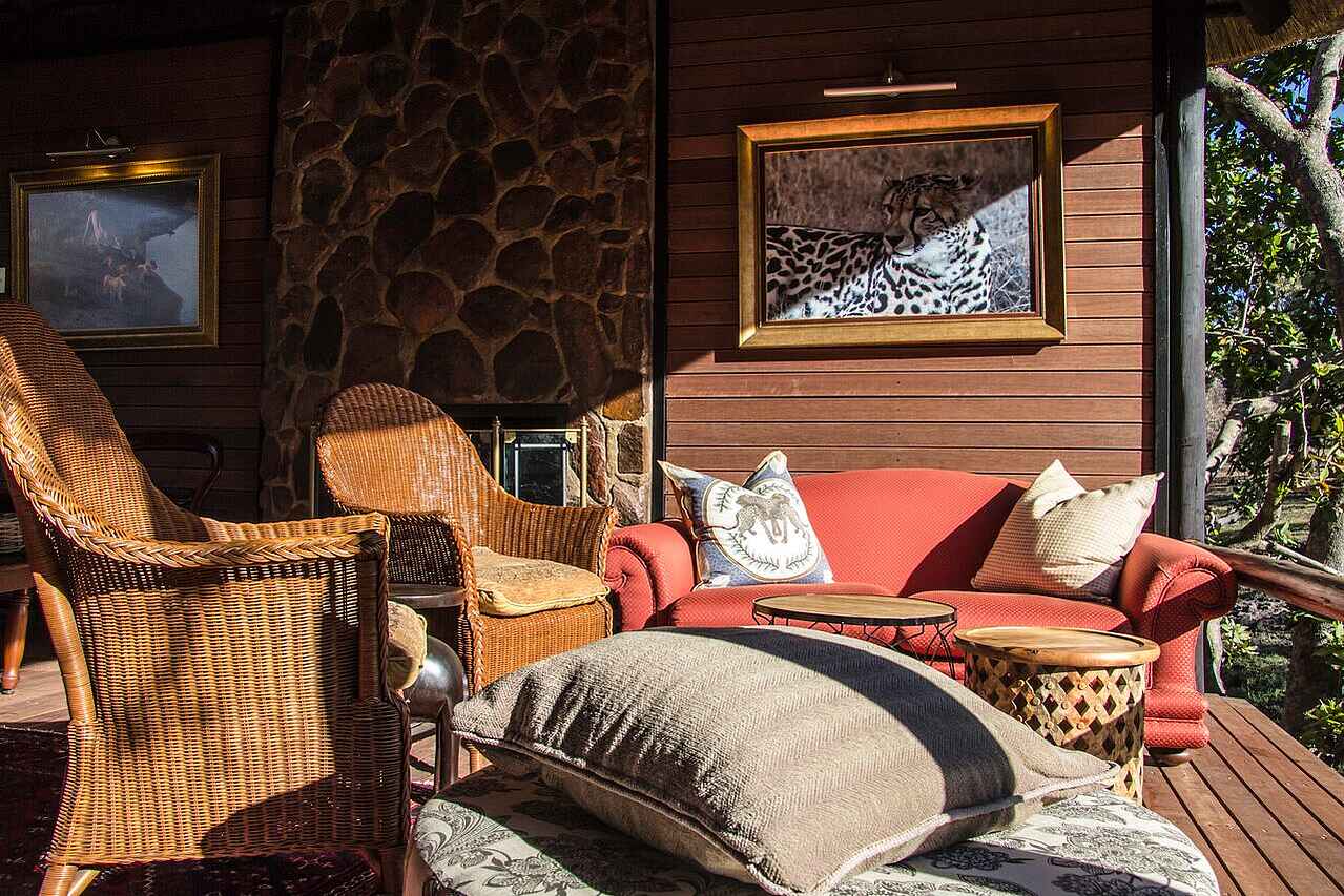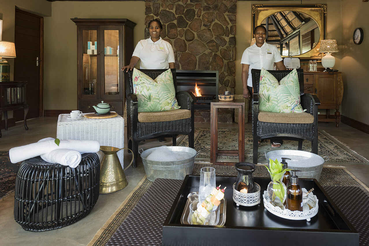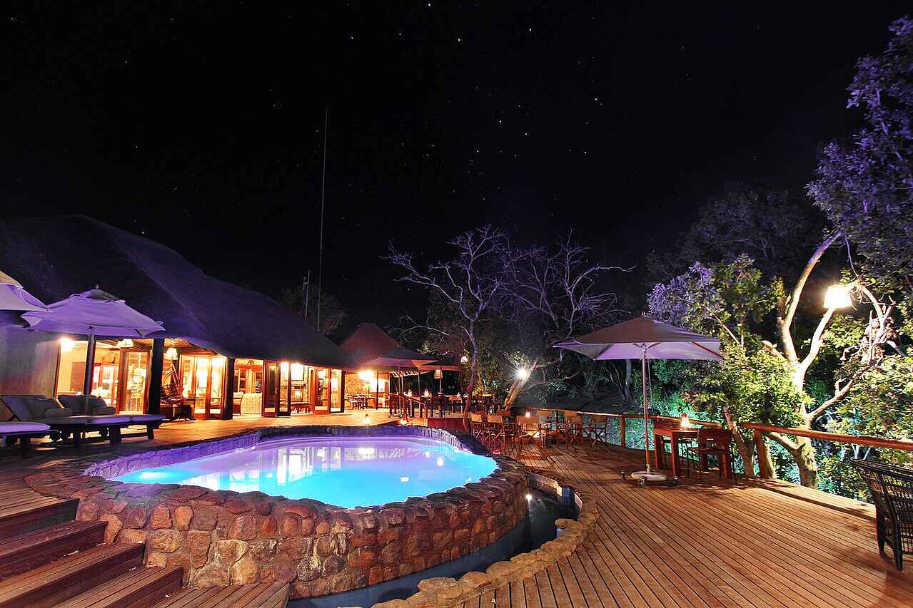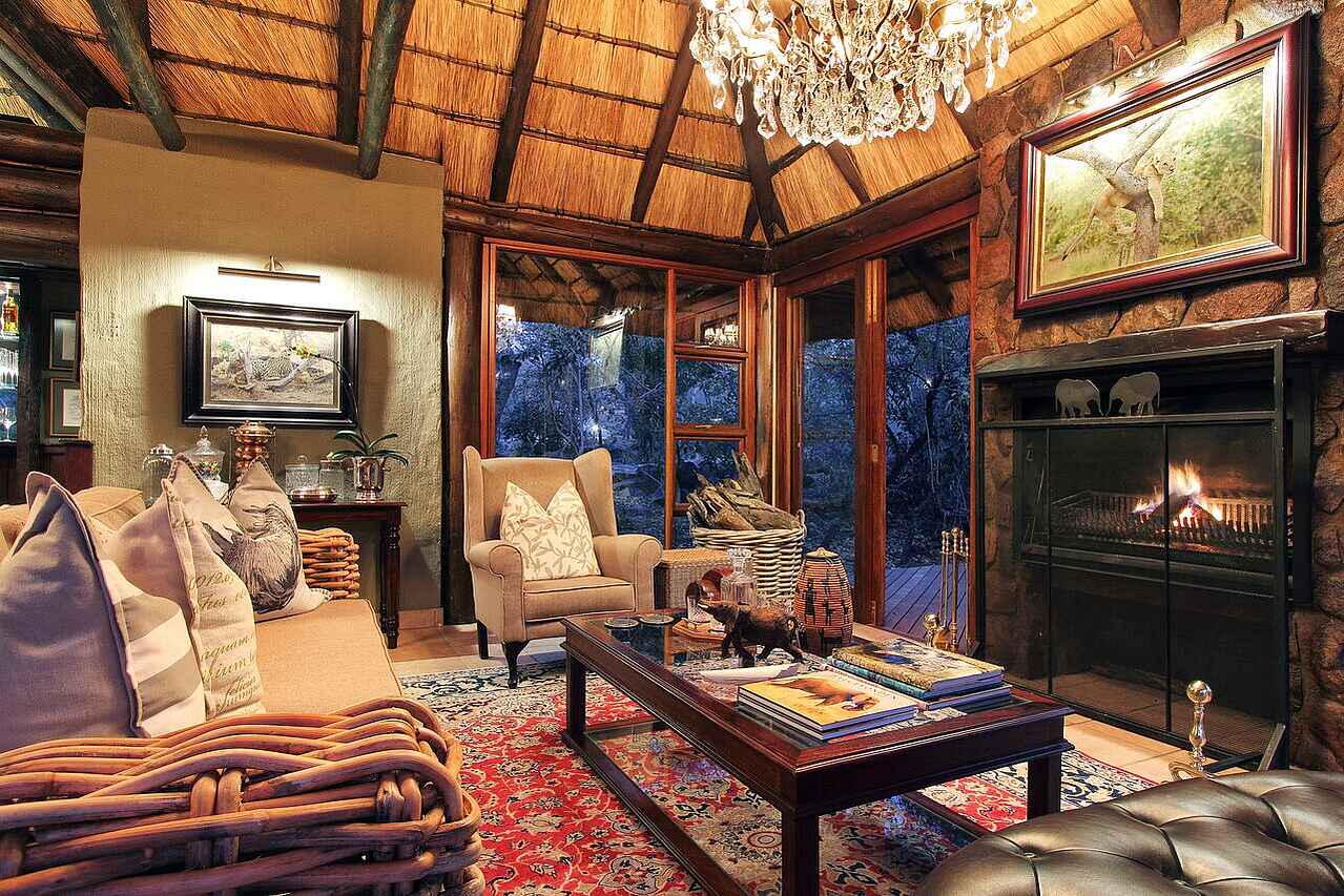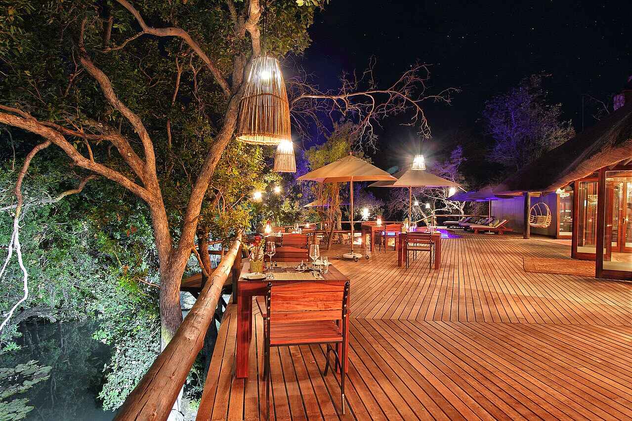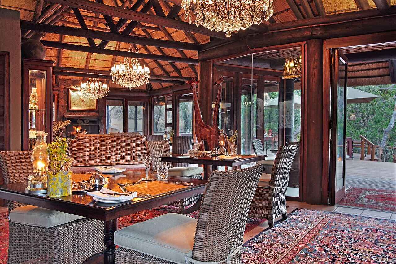 Als Hauptlodge ein strohgedecktes Langhaus mit ca. 5 Meter hohem Dachfirst, strohgedeckt, offener Dachstuhl. Hier befinden sich die Küche, WCs, in einem großen Raum der Essbereich, Bar und Lounge. Die Rezeption befindet sich in einem leicht abgesetzten Gebäude. Das Interieur mit boutiquehaftem Charakter, mit ausladenden Lüstern, Perserteppichen, Lederstühlen und Plüschsofas, offenen Kaminen, Kristallgläsern und Silberbesteck, solide gerahmte Tieraufnahmen, großen Vitrinen. Die Fassade der Hauptlodge in Richtung Bach offen, durch große Panoramafenstertüren verschließbar; eine wohlsortierte Bar aus bearbeitetem Naturstein als Übergang von Essbereich zur Lounge; hier vor offenem Kamin Plüsch- und Ledermöbel vor einem niedrigen Tisch.Sehr große Terrasse, mit Grundfläche ähnlich der Hauptlodge. Große Sitzmuscheln aus Korb am überkragenden Dach; mehrere Tischgruppen mit Korbstühlen über das Deck verteilt. Ein große Holzlaube steht separat und fungiert als Outdoorlounge, mit Blick von lederbezogenen Sesseln ins Gelände. Etwas abgesetzt über eine kleine Treppenflucht erreichbar eine Feuerstelle, daneben ein Pool in Natursteinfassung, von mehreren Liegen und Sonnenschirmen gesäumt. Weiterhin separat ein Gym, Spa und Curio Shop.