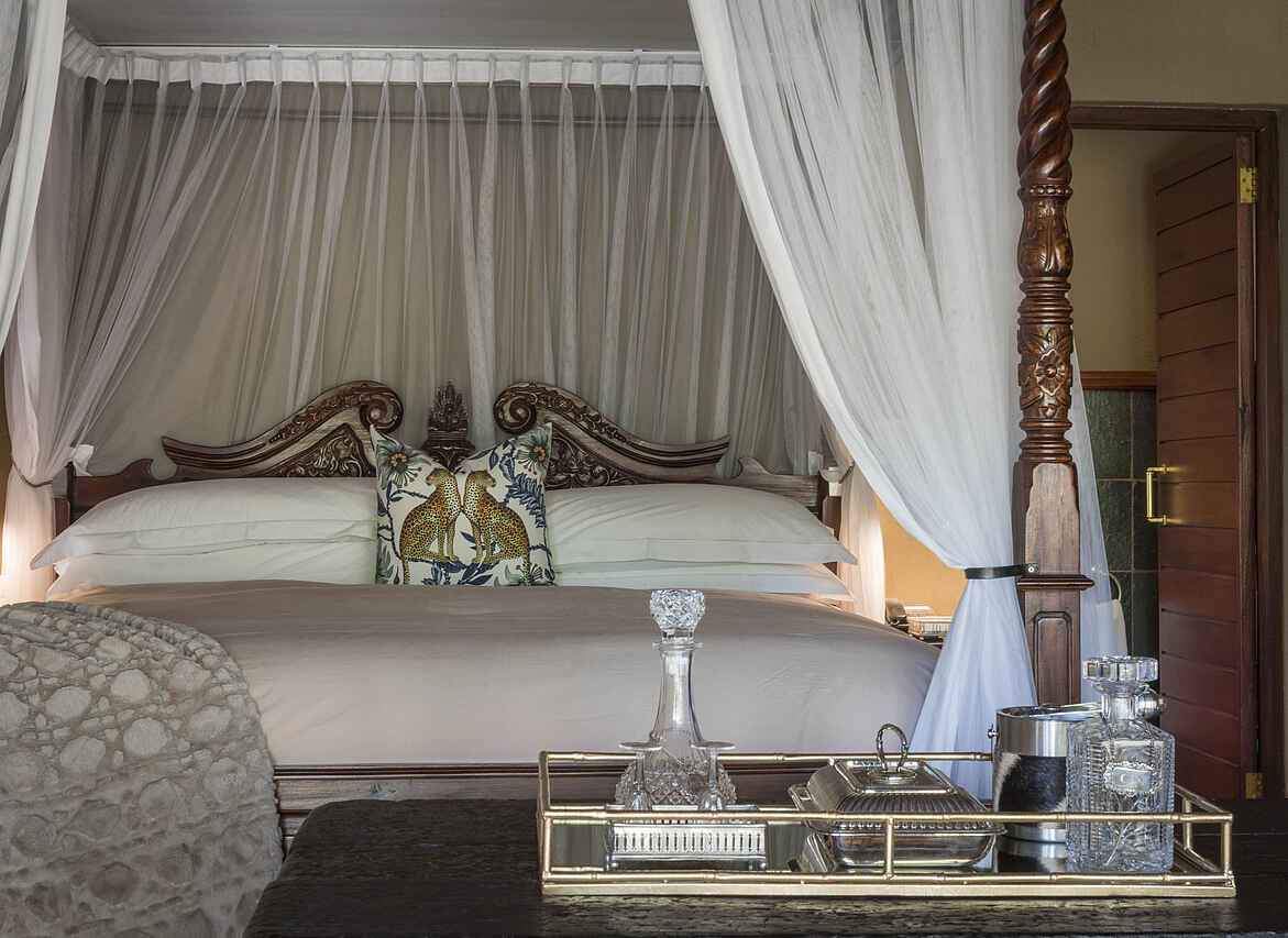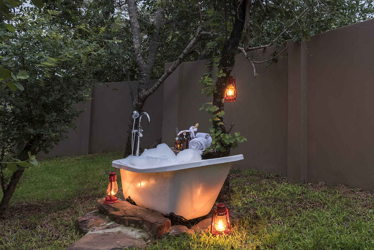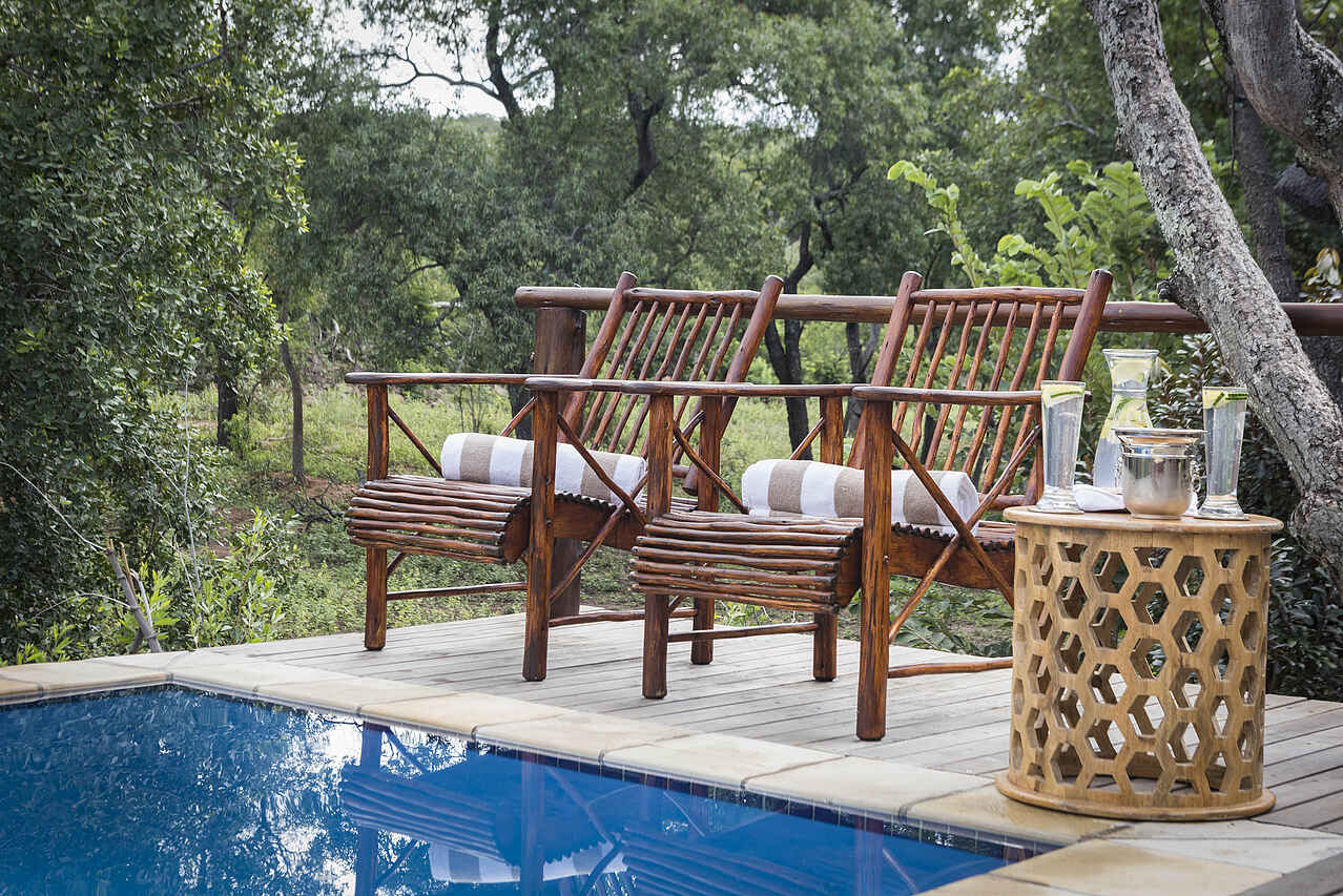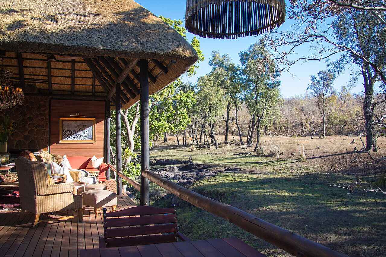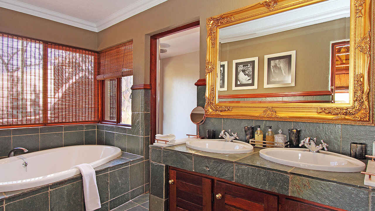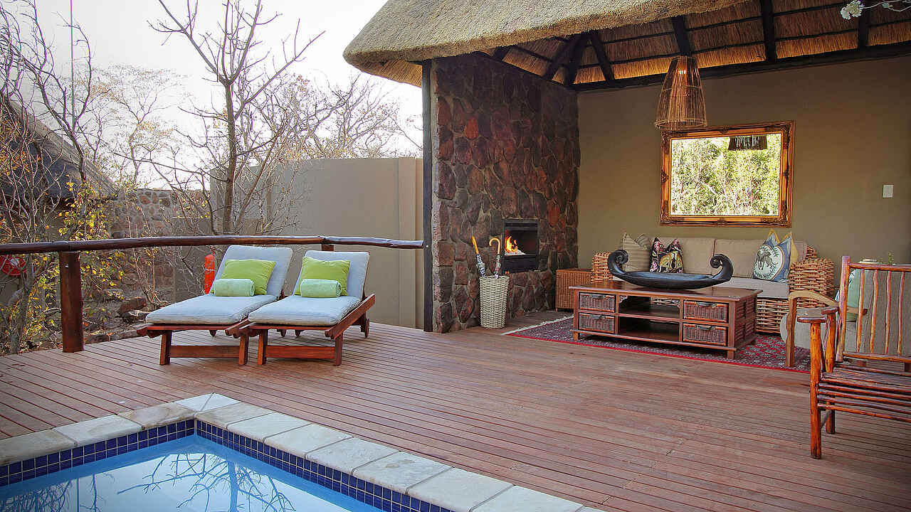 5 Suiten in einzelnstehenden Chalets, mit Natursteinmauer teilweise umfriedet Richtung Bach offen. Die Grundfläche der Suiten überschaubar aber groß, in 2 Räume unterteilt: Ein großes Schlafzimmer mit Lounge sowie das Bad. Interieur weniger überbordend als in der Hauptlodge; king-size Himmelbett mit Moskitonetz; kleine Privatlounge mit Plüschsofa und Lehnstuhl, kleinem Tischchen, Fernglas, offenem Kamin. Bad in zwei Bereiche unterteilt: erster mit Badewanne, 2 Waschbecken, einem riesigen Spiegel; Handtücher, Heißluftfön und Badeaccessoires vorhanden. Zweiter Bereich durch kleine Türe abgetrennt mit Dusche und Toilette; durch Glastüre Zugang zum Gärtchen und freistehende Badewanne mit Outdoordusche. Von der privaten Lounge Zugang zur Terrasse über Glasschiebetüren, hier mehrere Sitzmöglichkeiten und der private Plungepool. Direkte Sicht in das Gelände und auf die Tiere. Vorsicht vor den Baboons, Türen immer geschlossen halten. Suite 1,2,3, und 5 mit privatem Plunge Pool. Suite 5 für Familien geeignet, weil mit Verbindungstüren an Suite 4 angeschlossen. Alle Unterkünfte mit elektrischem Strom, klimatisiert mit Deckenventilator, Moskitonetz, Mini-Safe, Schreibtisch, Minibar. Wäscheservice auf Anfrage.