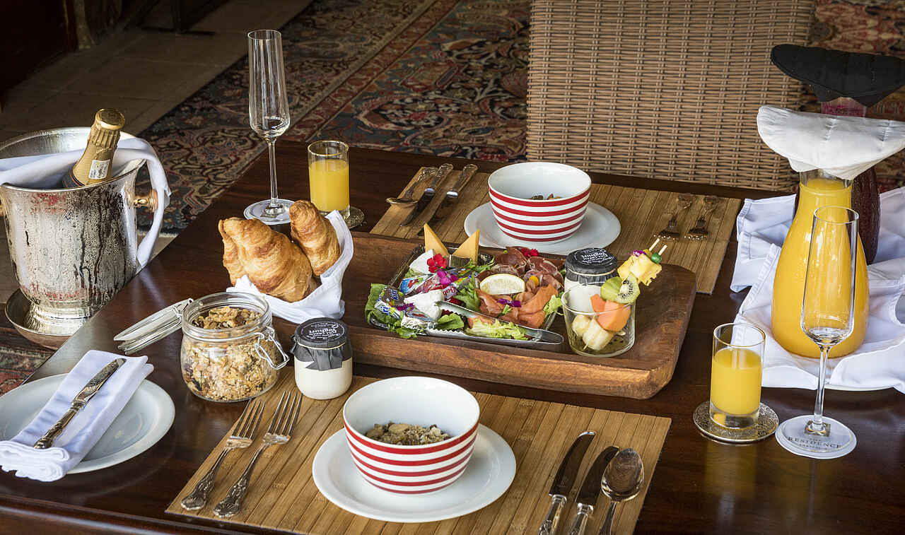 Alle Mahlzeiten und Getränke, auch alkoholische, mit Ausnahme von Premiummarken. Mehrere Mahlzeiten täglich: Früher Snack um 6 Uhr, Morning Coffee während der Pirschfahrt, warmes und kaltes Frühstück nach Rückkehr, serviert am Platz; Mittagessen serviert, Hightea vor der Nachmittagsaktivität, Sundowner mit Snack während der Pirschfahrt, Dinner abends, 3 Gänge, serviert. Servierte Mahlzeiten am Zweiertisch, private Dinner auf Anfrage. Speisen abwechslungsreich mit Fisch, Fleisch, Gemüse, vegetarisch, vegan und koscher auf Anfrage.