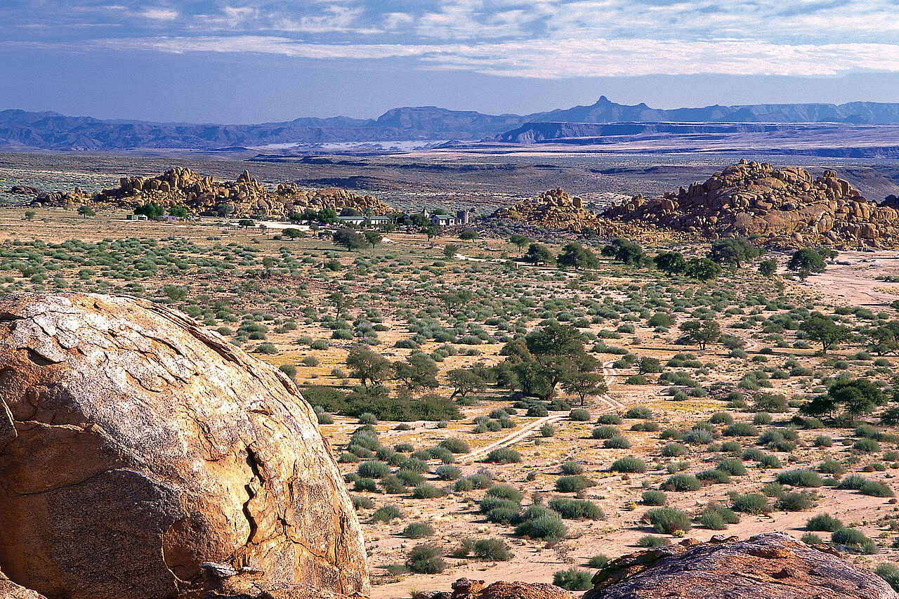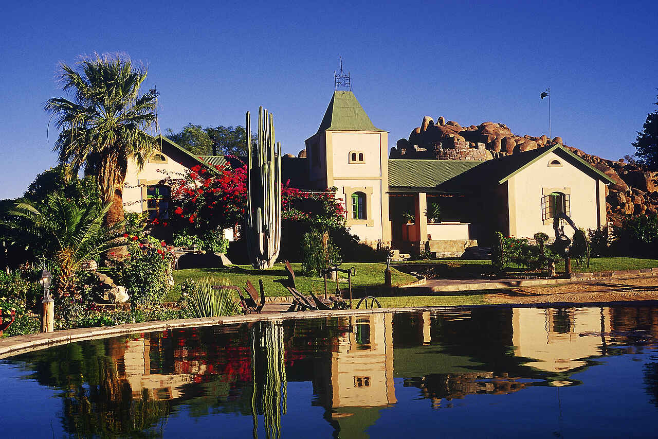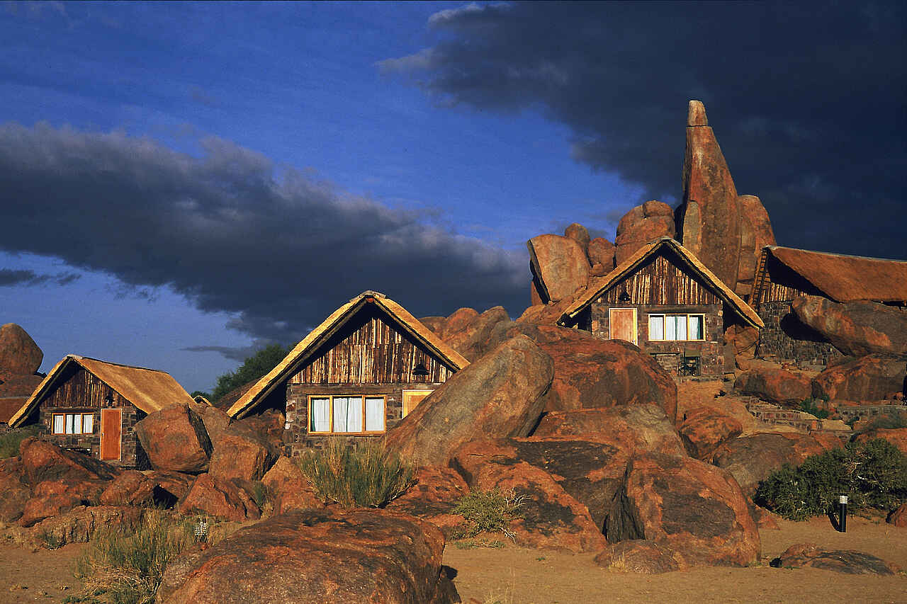 Inmitten gigantischer Granitblöcke zwischen kleineren Felsen liegt die Cañon Lodge im 100.000 Hektar großen Gondwana Cañon Park, ca. 20 Kilometer vom Fischfluss Canyon entfernt an der C37.