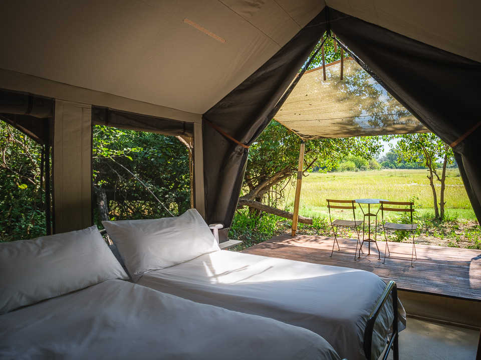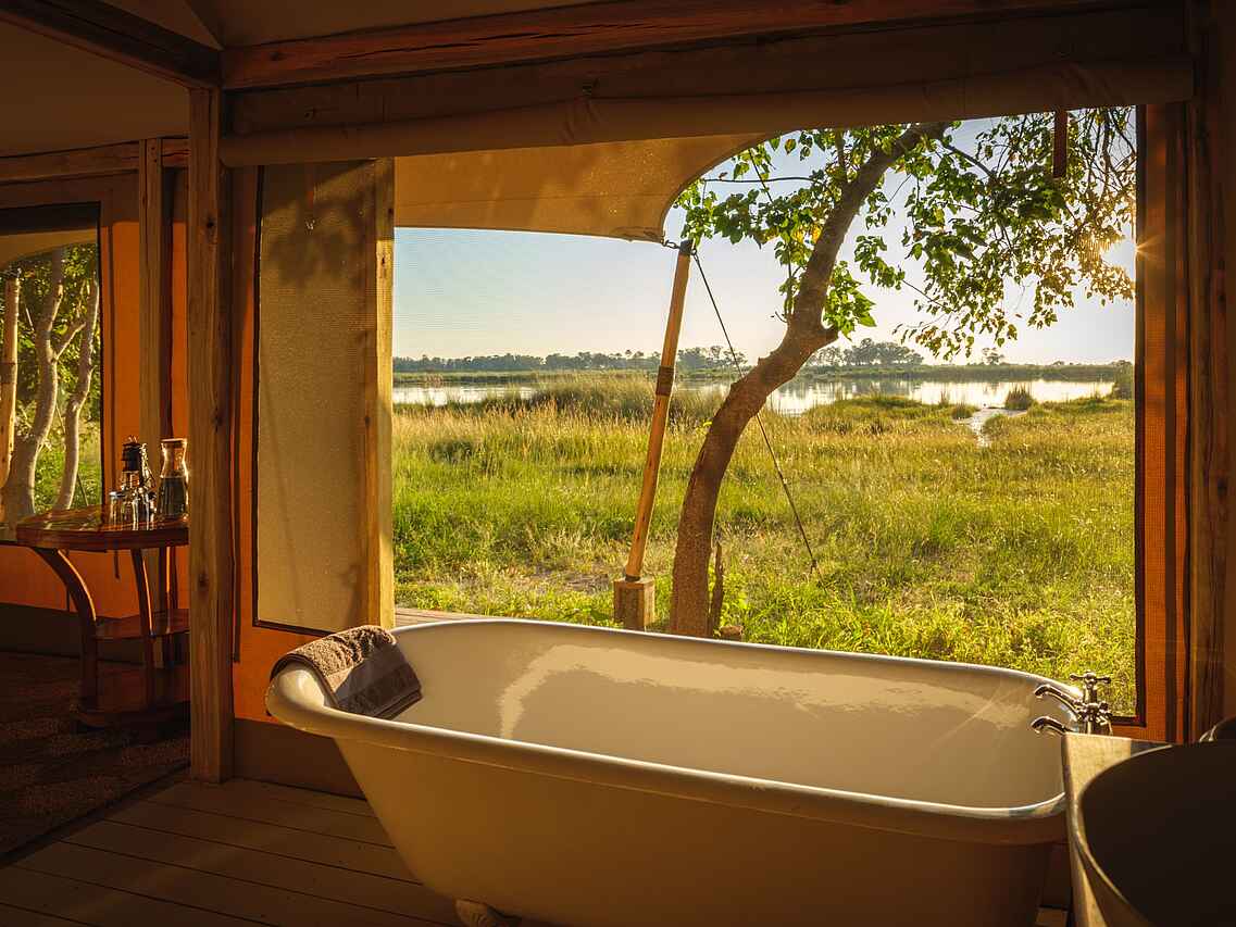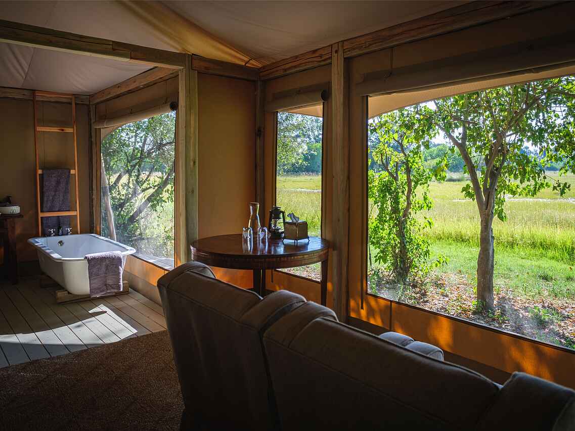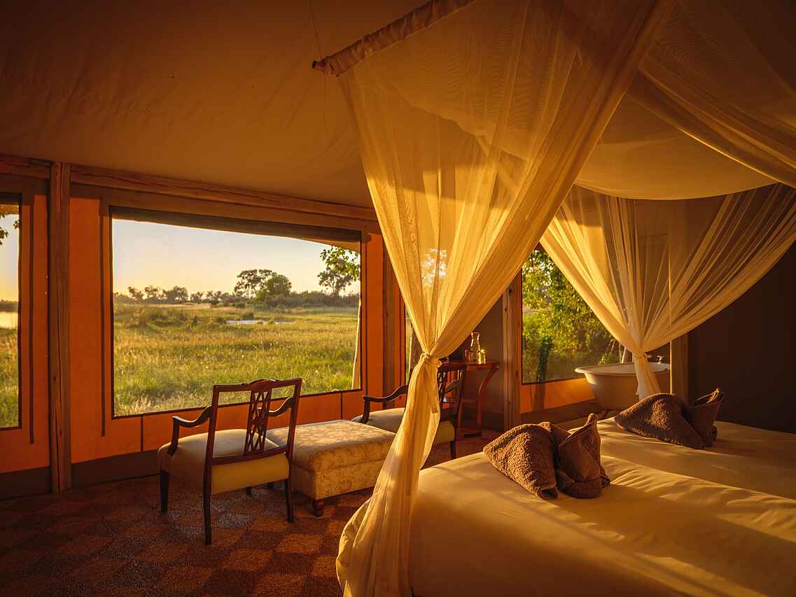 Das Camp verfügt über sechs komfortable Zeltsuiten, darunter zwei Familienzelte. Versteckt unter einem kühlen Baldachin aus Ahnen- und Knopfdornbäumen bieten alle Zelte malerische Ausblicke auf das Wasser. Ansässige Flusspferde sorgen für Unterhaltung und können einen manchmal nachts wachhalten. Die Zelte sind auf Holzdecks gebaut, mit Wänden aus Canvas im klassischen Meru-Stil. Jede Suite ist mit gemütlichen Betten (entweder einem King-Size-Bett oder zwei Einzelbetten) ausgestattet, die von Moskitonetzen umhüllt sind. Die En-suite Badezimmer bieten ein Waschbecken, WC und Dusche. Die zwei Familiensuiten sind etwas geräumiger und verfügen über eine kleine Sitzecke sowie eine freistehende Badewanne mit Blick auf das Delta.