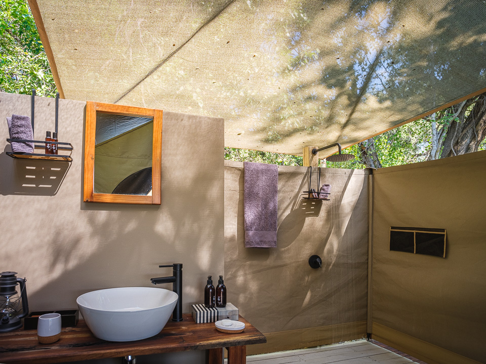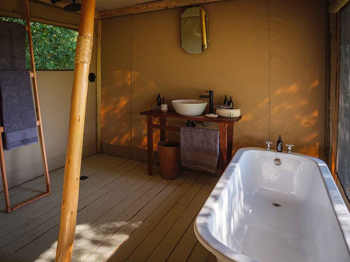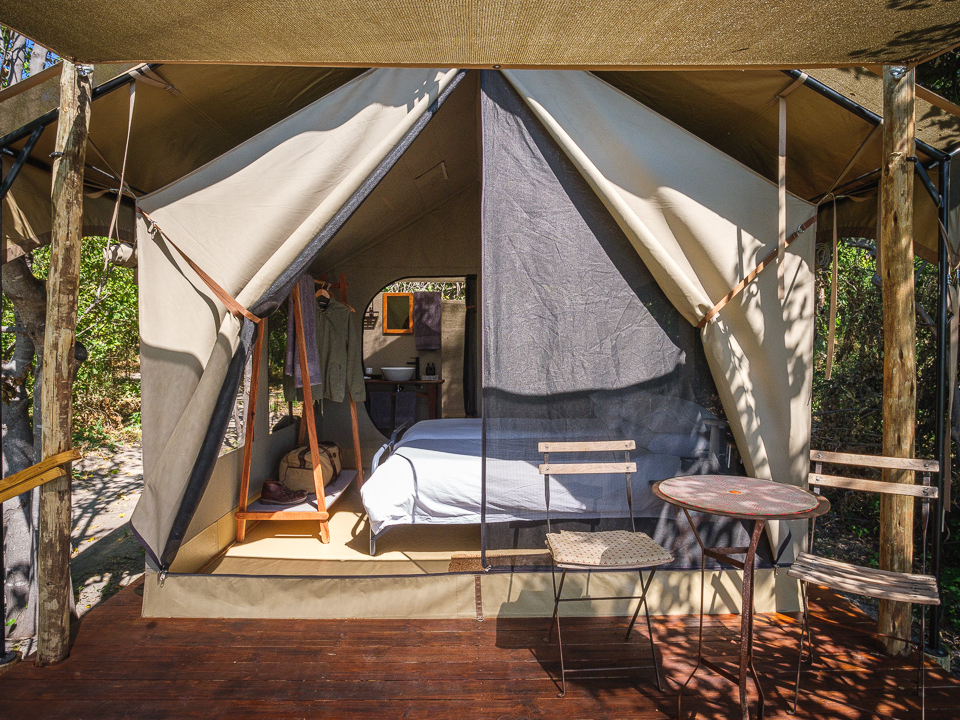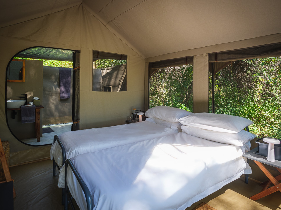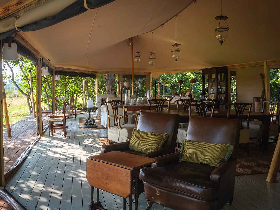 Das Camp verfügt über sechs komfortable Zeltsuiten, darunter zwei Familienzelte. Versteckt unter einem kühlen Baldachin aus Ahnen- und Knopfdornbäumen bieten alle Zelte malerische Ausblicke auf das Wasser. Ansässige Flusspferde sorgen für Unterhaltung und können einen manchmal nachts wachhalten. Die Zelte sind auf Holzdecks gebaut, mit Wänden aus Canvas im klassischen Meru-Stil. Jede Suite ist mit gemütlichen Betten (entweder einem King-Size-Bett oder zwei Einzelbetten) ausgestattet, die von Moskitonetzen umhüllt sind. Die En-suite Badezimmer bieten ein Waschbecken, WC und Dusche. Die zwei Familiensuiten sind etwas geräumiger und verfügen über eine kleine Sitzecke sowie eine freistehende Badewanne mit Blick auf das Delta.