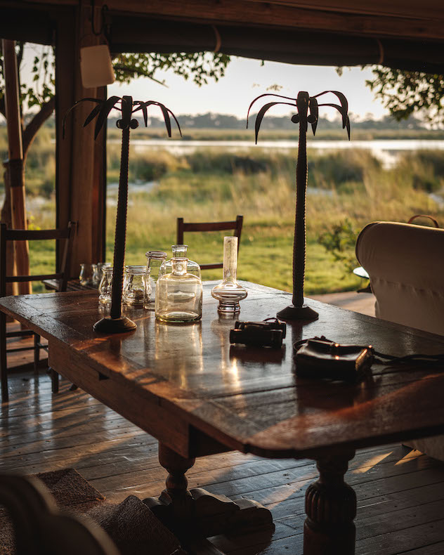 Das Cha Cha Metsi ist im Expeditions-Stil der 1930er Jahre gestaltet und verbindet moderne Annehmlichkeiten mit traditionellen afrikanischen Elementen, was eine warme und einladende Atmosphäre schafft. Die gemütliche Gemeinschaftslounge, ausgestattet mit komfortablen Sitzgelegenheiten und dekorativen Familienerbstücken, bietet einen atemberaubenden Panoramablick auf das umliegende Feuchtgebiet. Die gut sortierte Bar lädt zu erfrischenden Getränken ein und abends kann man den Tag an der traditionellen Boma unter dem funkelnden afrikanischen Sternenhimmel ausklingen lassen. Im gesamten Camp ist zudem WLAN verfügbar.
