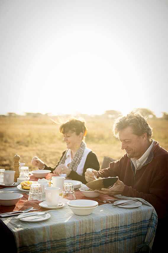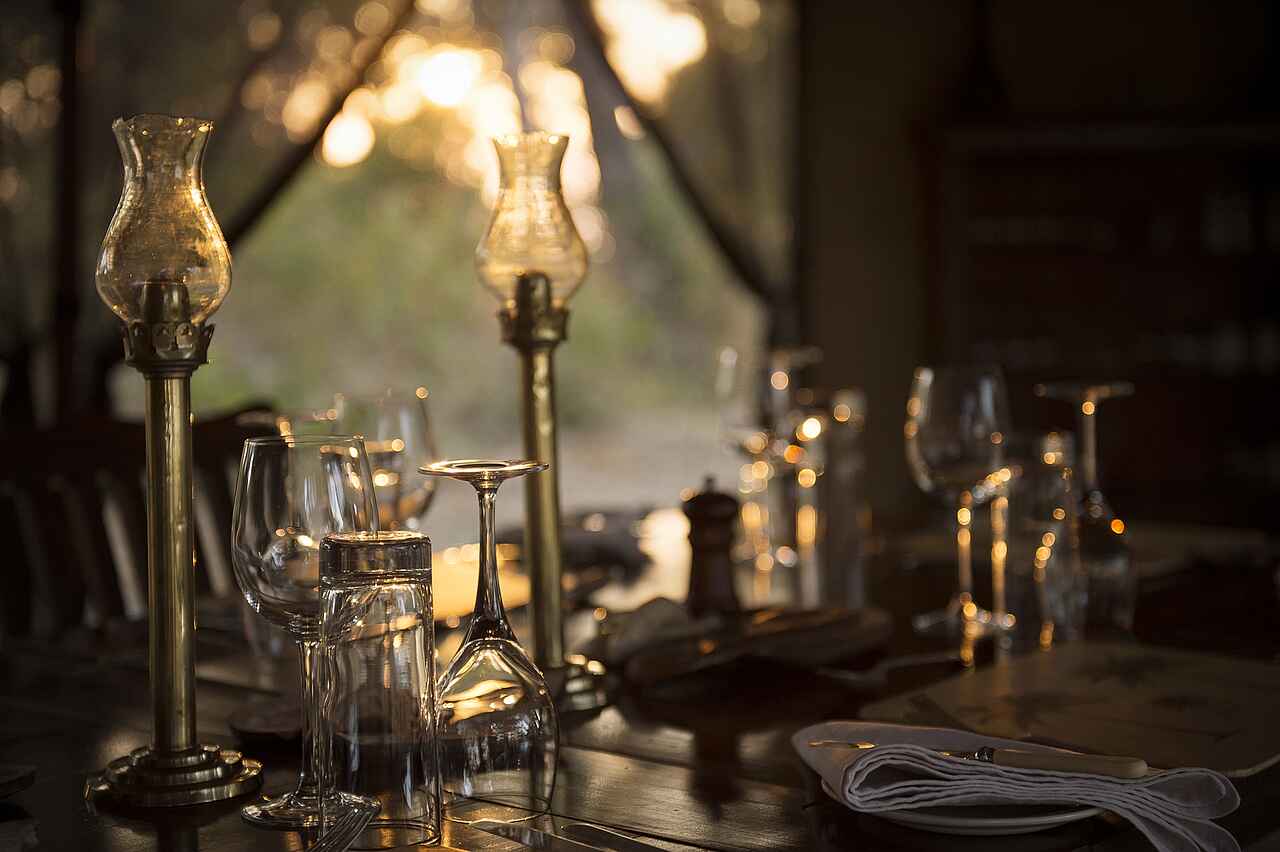 Vollpension, Getränke inkl., außer Champagner, importierte Weine und Spirituosen. Morgens wird ein üppiges englisch-kontinentales Frühstücksbuffet serviert, mittags ein leichtes, frisches Buffet. Brot wird täglich frisch gebacken. Frühstück und Mittagessen werden oft auf den Pirschfahrten gereicht. Abends wird ein 3-Gänge-Dinner serviert. Gespeist wird immer gemeinsam im Speisezelt oder unter freiem Himmel auf dem Gelände.
