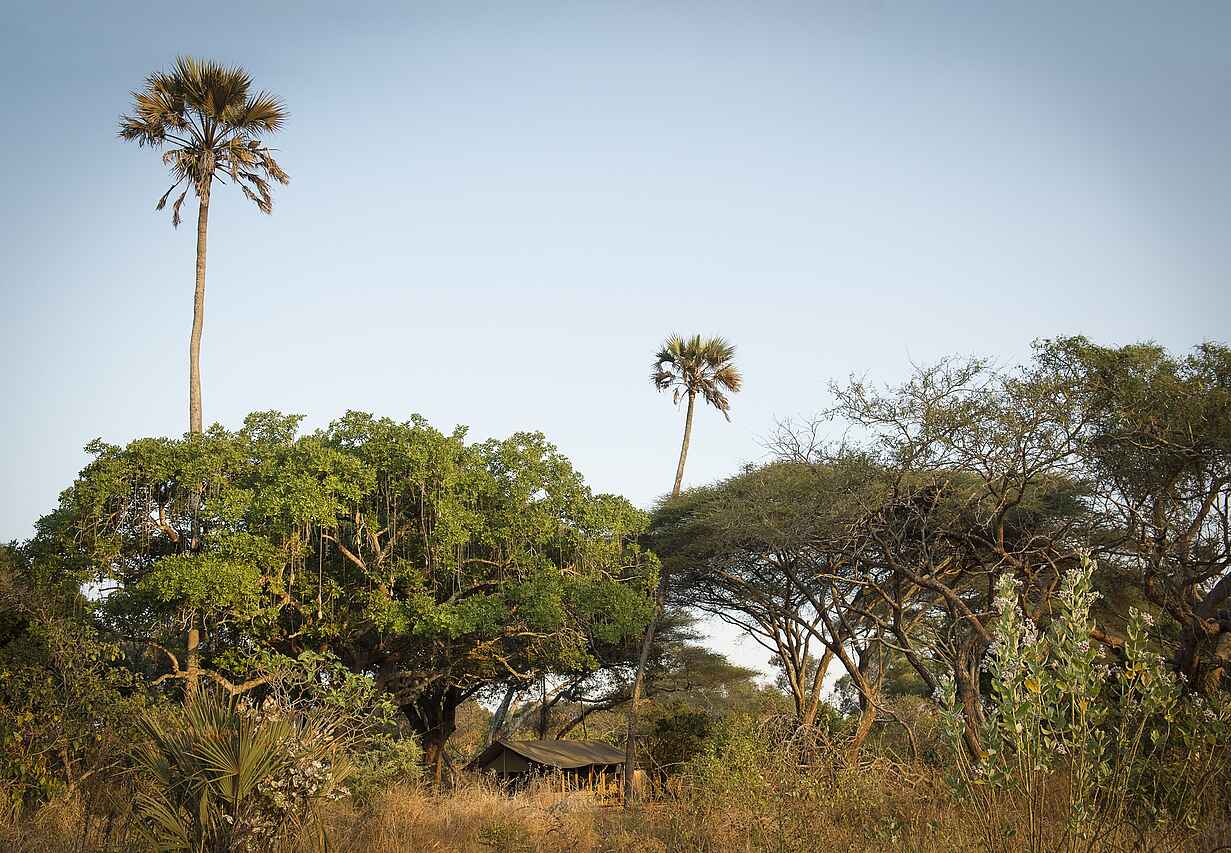 Abgeschieden auf einer Halbinsel im Schatten von Akazien- und Tamarindenbäumen mit Blick auf die weitläufige Chada-Ebene im Westen des Katavi National Park im touristisch wenig frequentierten Südwesten Tansanias. Der drittgrößte Nationalpark von Tansania (etwa 4.500 km²) nördlich des Rukwa-Sees ist geprägt von Wäldern, Sümpfen, Grasflächen, Flüssen und Seen und bildet die Heimat zahlreicher Wildtier- und Vogelarten.