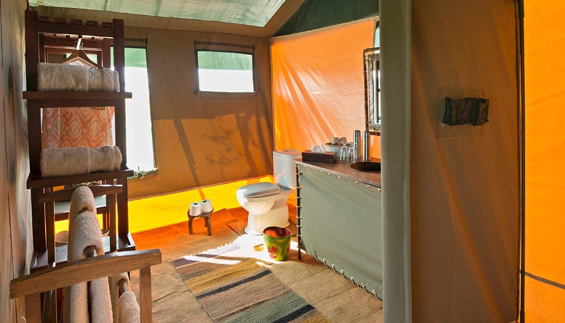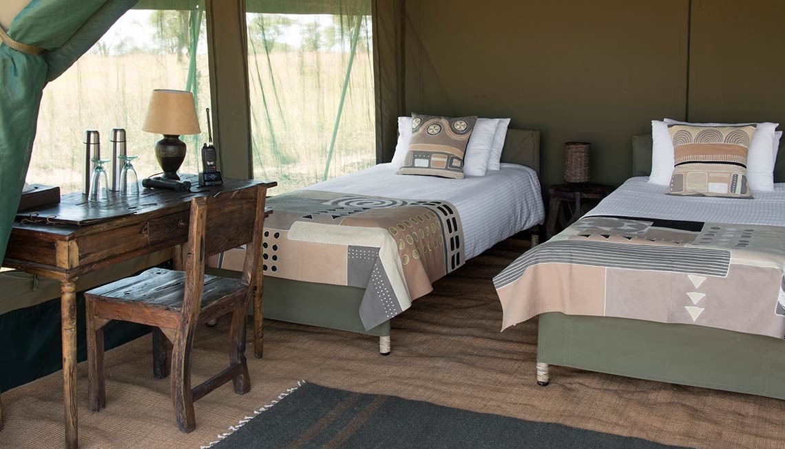 Zehn komfortable, ebenerdige Zelte bestehend aus Segeltuchwänden mit Sichtfenstern aus Moskitonetzen ergänzen den Hauptbereich. Die Sichtfenster und der Eingang können durch Segeltuchbahnen verschlossen werden. Ausgestattet mit je einem Doppelbett, zwei Nachtischen, einer Truhe, Sekretär, Stuhl und einem Beistelltisch, als bestehend aus dunklem Holz. Der Boden ist mit Sisalmatten ausgelegt. Die privaten Zelte umfassen eine kleine vorgelagerte Veranda mit Sonnenschutz, Sessel und Beistelltisch sowie ein hinter dem Bett liegendes, durch Segeltuchbahnen abgetrenntes en-suite Bad mit Spültoilette, Waschtisch mit fließendem Wasser und einer Eimerdusche sowie einem Schrank. Die Segeltuchwände am Eingang besitzen Reißverschlüsse. Auch die Sichtfenster können durch zusätzliche Segeltuchbahnen verschlossen werden. Insgesamt finden bis zu zwei Erwachsene und zwei Kinder mit der Option auf Beistellbetten in den Zelten Platz. Elektrizität wird durch Solarenergie erzeugt. Wäscheservice wird extra berechnet.