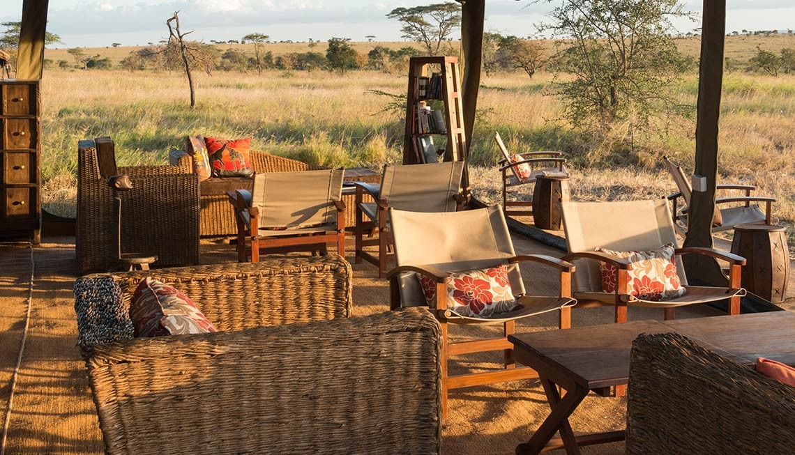 Hauptbereich bestehend aus zwei Zelten, Lounge-Bereich und Speisezelt mit integrierter Bar und Bibliothek, beide ebenerdig. Die vorgelagerte Feuerstelle, die große Veranda und die offenen Front- und Seitenwände bieten einen freien Blick auf die Grassavanne der Serengeti. Es sind kleinere Gruppentische für die gemeinsamen Mahlzeiten vorhanden. Im Speisezelt können Elektrogeräte über UK-Steckdosen geladen werden und es herrscht teilweise Handyempfang im Camp. Toiletten sind auch im Hauptbereich vorhanden.