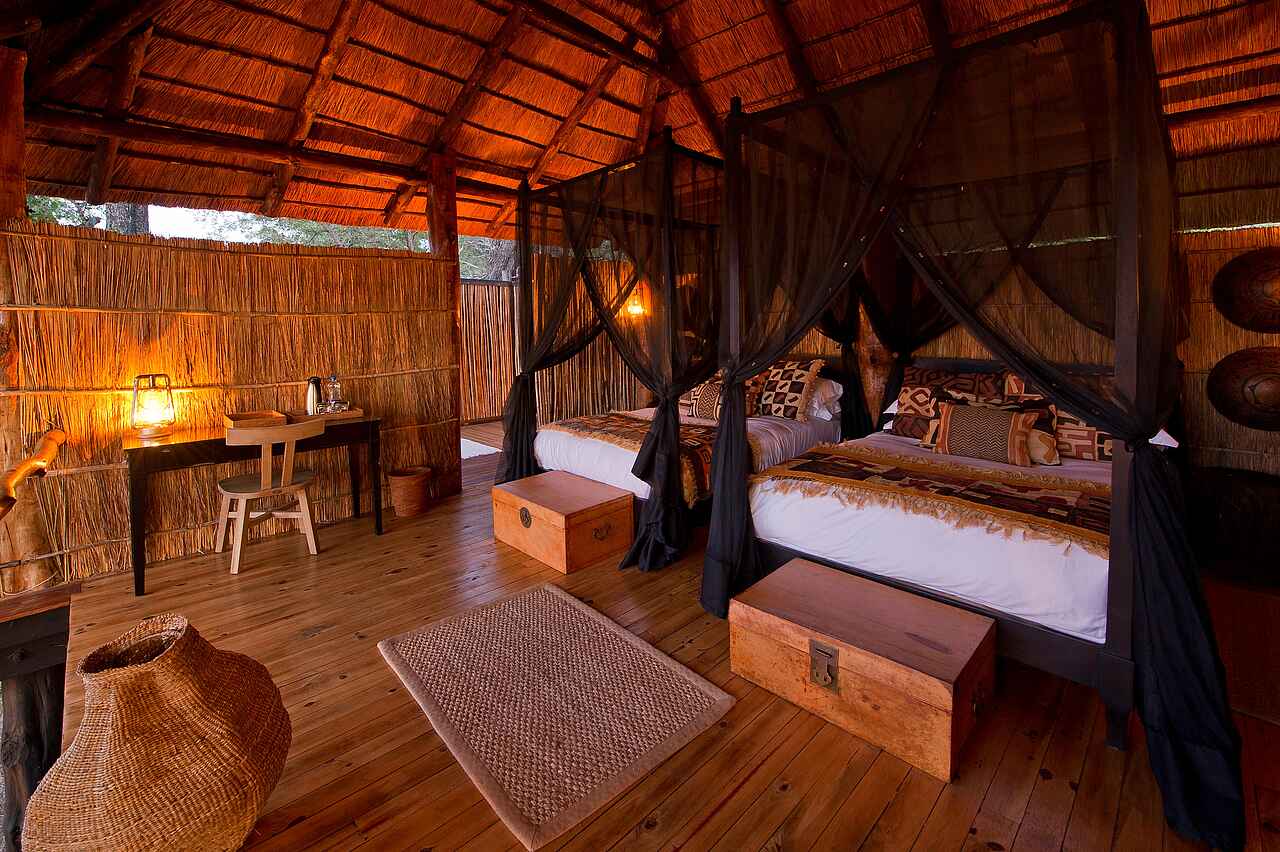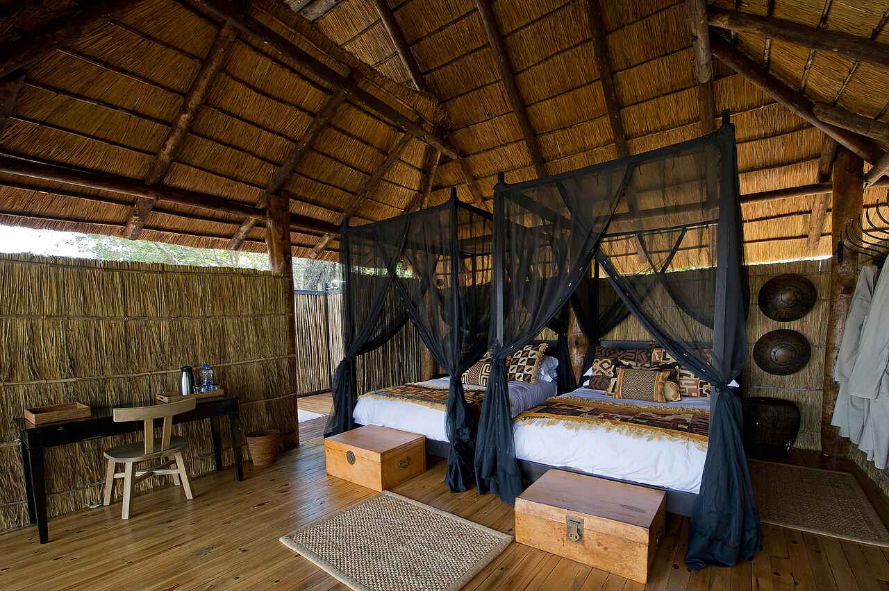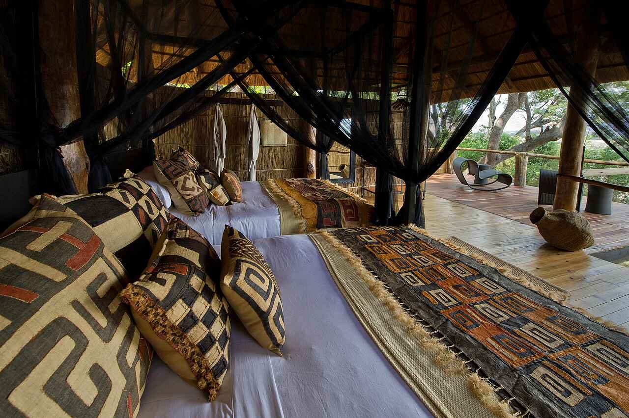 Drei Strohgedeckte Chalets auf 2 Meter hohen hölzernen Stelzen, Reet-Wände an drei Seiten, vom Schlafzimmer aus freier Blick auf Ufer, afrikanische Farbgebung bei Textilien, Teppiche in Naturtönen dezent eingesetzt, dunkle Moskitonetze, zwei Truhen als Ablage und Stauraum vor dem Bett, dekorative runde Nachtische, kleiner Sekretär, Rattan-Sessel und Stuhl, Schaukelstühle auf der Veranda, abgesetztes Open-Air Bad mit zwei Waschtischen (Kalt- und Warmwasser), offener Dusche, WC