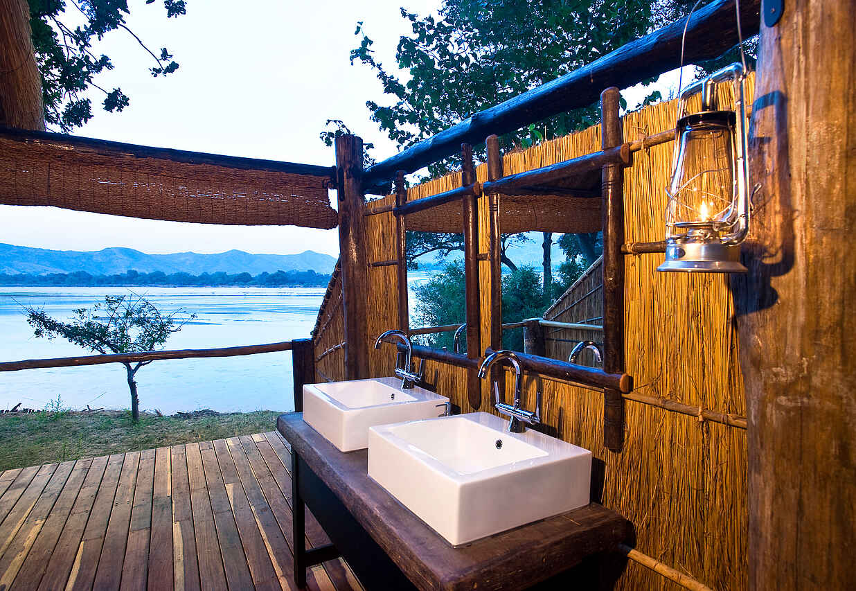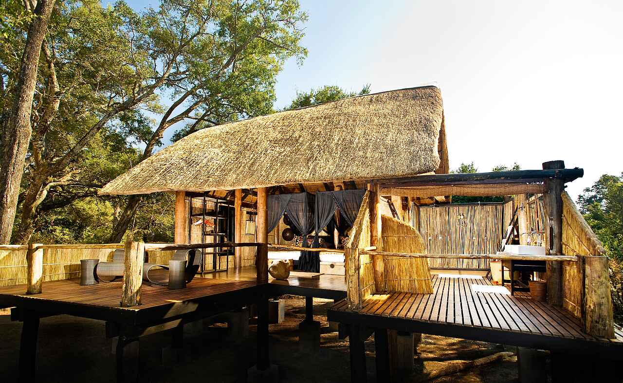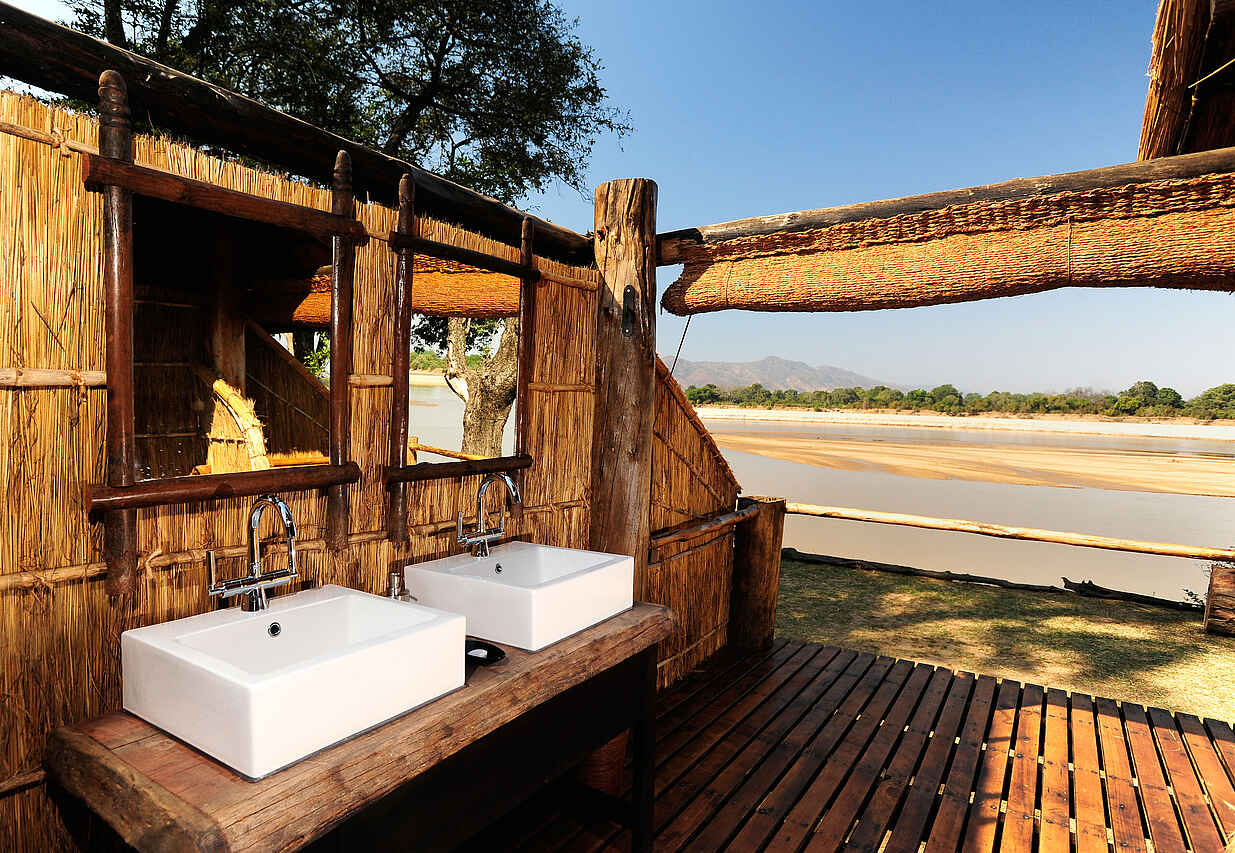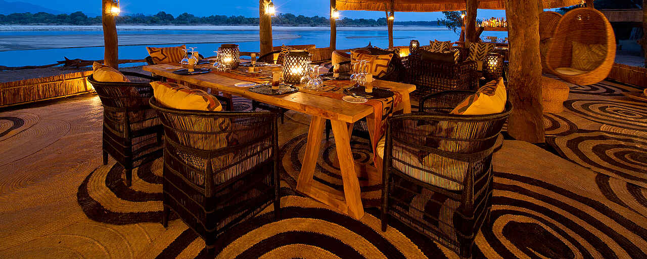 Zentraler Bereich ebenerdig auf leicht erhöhter Lichtung am Luangwa Fluss inmitten von Ebenholz-Hainen gelegen, steil abfallendes Ufer zum Fluss, offen gestalteter Ess- und Barbereich mit Sitzgruppe und vielen farbigen Kissen, überdacht. Kleine Bibliothek. Toilettenartikel werden täglich aufgefrischt, begrenzter Wäscheservice. Gästeunterkünfte