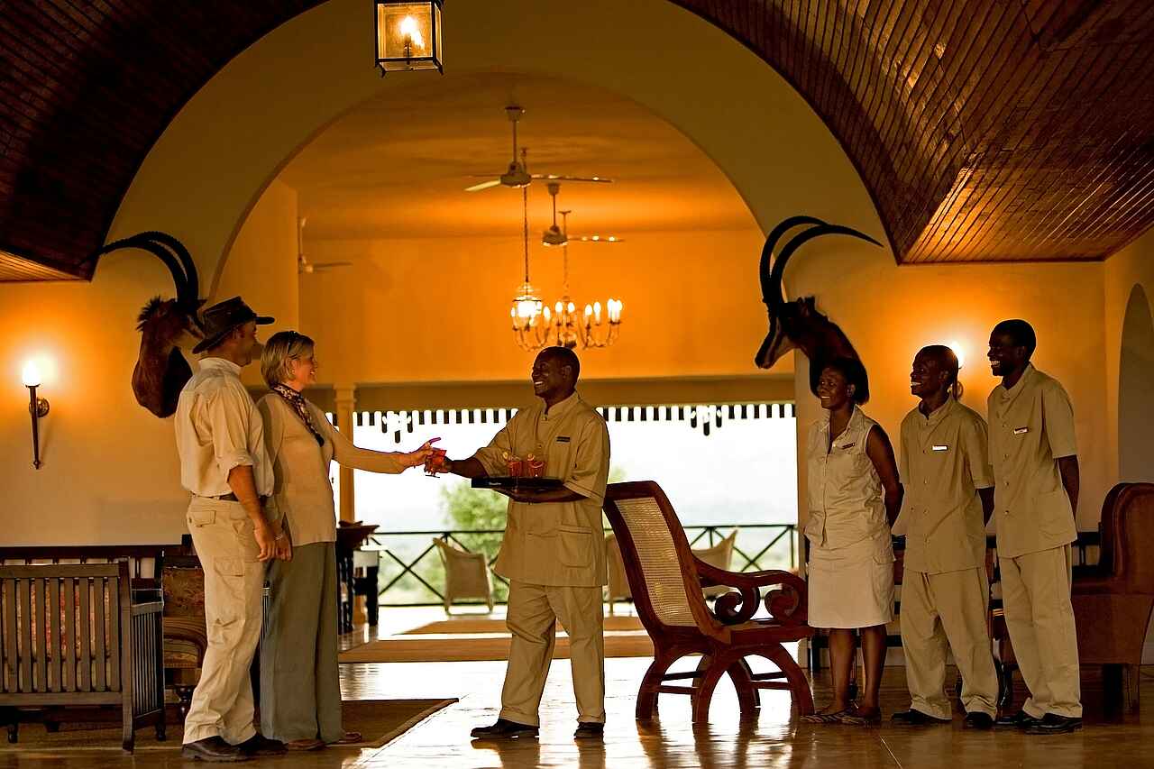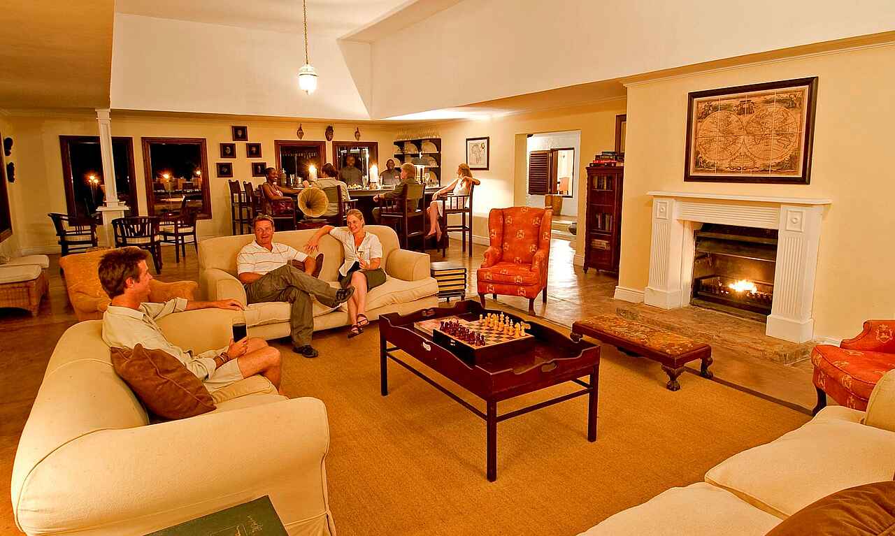 Insgesamt ist die Lodge in einem repräsentativen, viktorianischen Stil gehalten. Das Ambiente ist stets anspruchsvoll und gediegen. Passende Dekoration unterstreicht den Anspruch, ist aber nicht aufdringlich. Die Lodge ist sehr weitläufig angelegt. Man erreicht das Gelände durch eine Art Tor und betritt zunächst eine Rezeption, die direkt in einen sehr große Lounge übergeht. Hier gibt es Sessel, Sofas, einen Kamin, ein Klavier, eine Bar. Weiter folgt eine umlaufende, überdachte Terrasse, die zugleich als Speisesal für das Dinner dient. In einem Innenhof gibt es einen kleinen Teich. Zu den nahen Gästesuiten führen überdachte Säulengänge. Die weiter entfernten Suiten sind über Steinwege erreichbar. Vor der großen Lounge gibt es einen Swimming Pool. Dahinter breitet sich ein weiter Rasen aus, der den Panoramablick offen hält. Feuerplatz in einem Eck unter Bäumen. Souvenirshop.