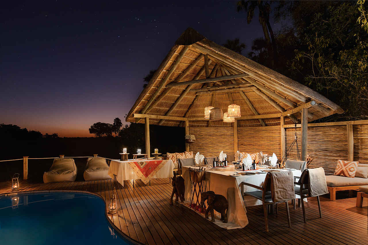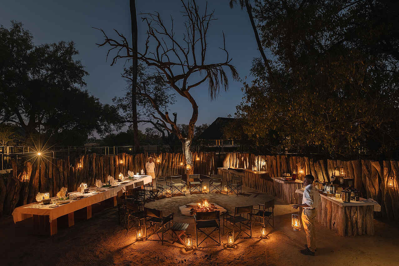 Im Außenbereich stehen mehrere Aufenthaltszonen zur Verfügung. Eine Terrasse mit Feuerstelle dient als Treffpunkt am Abend, tagsüber bieten schattige Sitzmöglichkeiten Raum für Ruhepausen. Ein Pool mit Liegen sorgt für Abkühlung in den warmen Stunden. Regelmäßig finden gemeinsame Abendessen in der Boma statt.