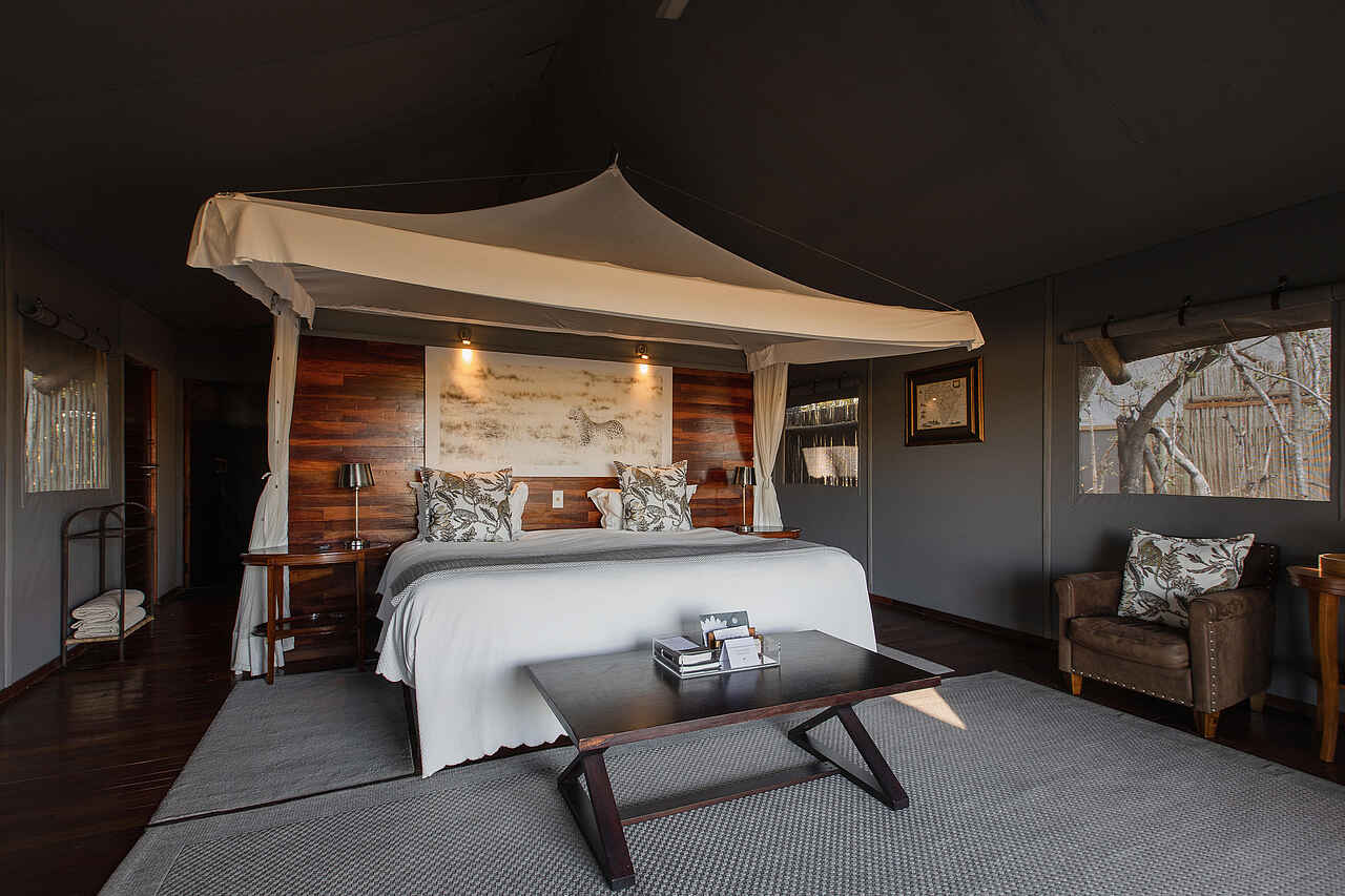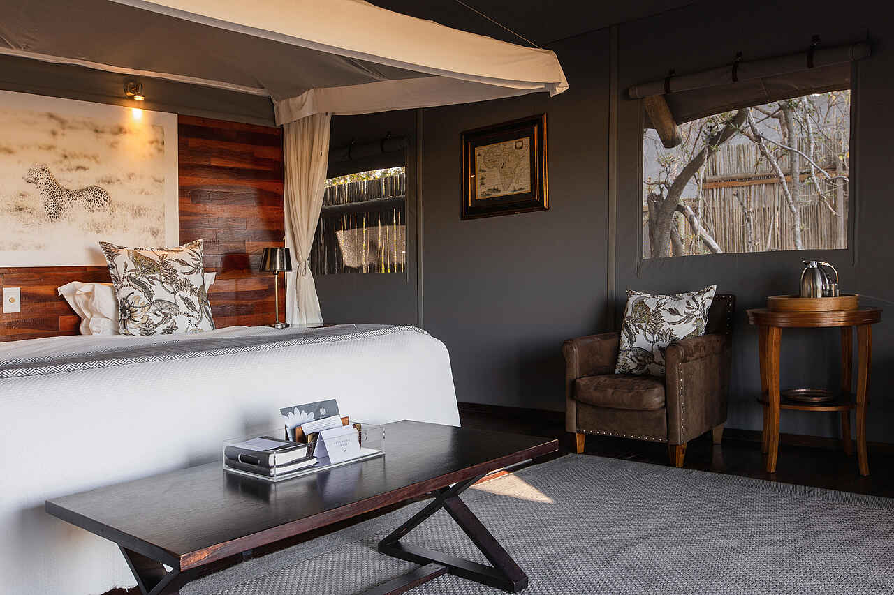 Die fünf Gästeunterkünfte des Chitabe Lediba Camp sind erhöht gebaut und über Holzstege erreichbar. Die Schlafbereiche sind großzügig geschnitten und mit dunklen Holzböden, ruhiger Farbgebung und Moskitonetzen über den Betten ausgestattet. Große Glastüren sorgen für viel Tageslicht, Ventilatoren und Klimaanlage für ein ausgeglichenes Raumklima. Zur Ausstattung gehören ein Schreibtisch, Safe, Trinkwasser sowie Stromanschlüsse zum Laden elektronischer Geräte.