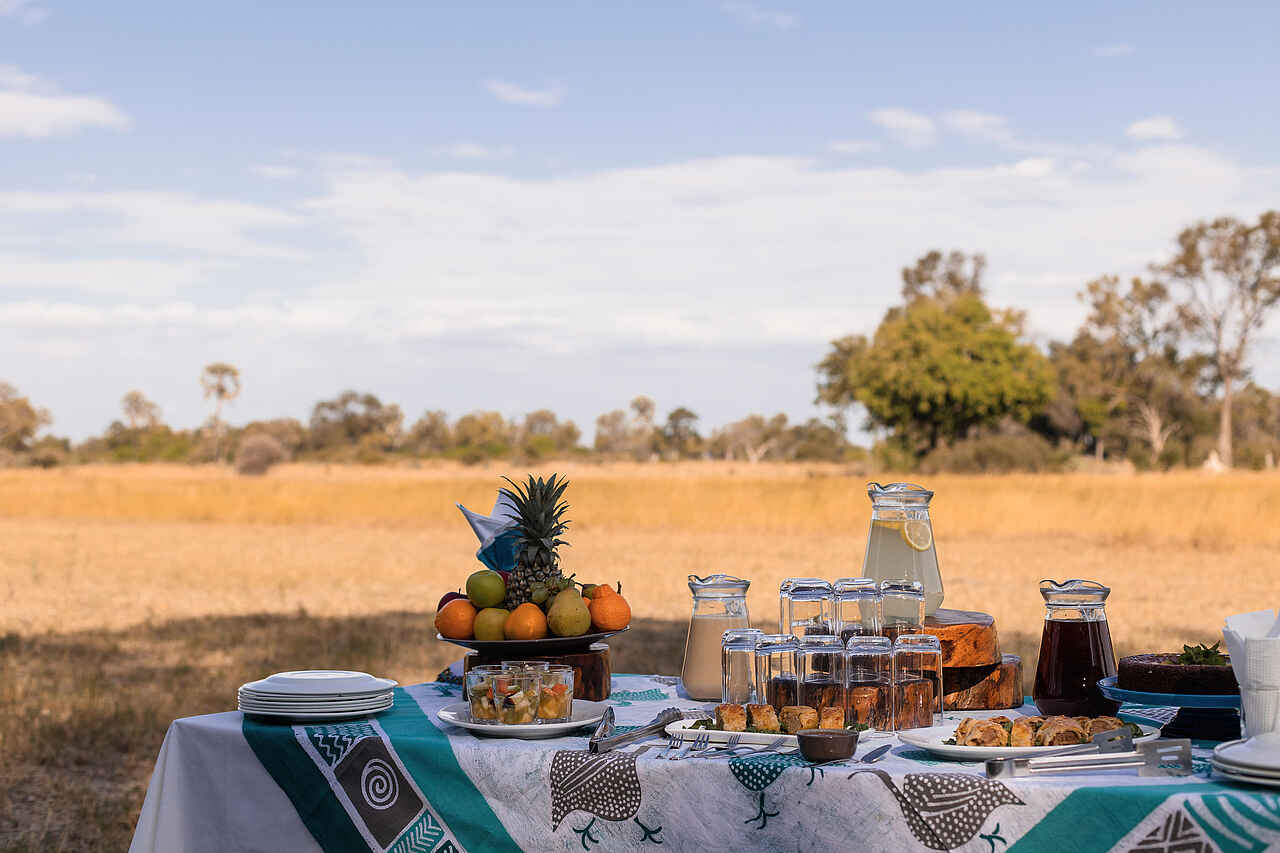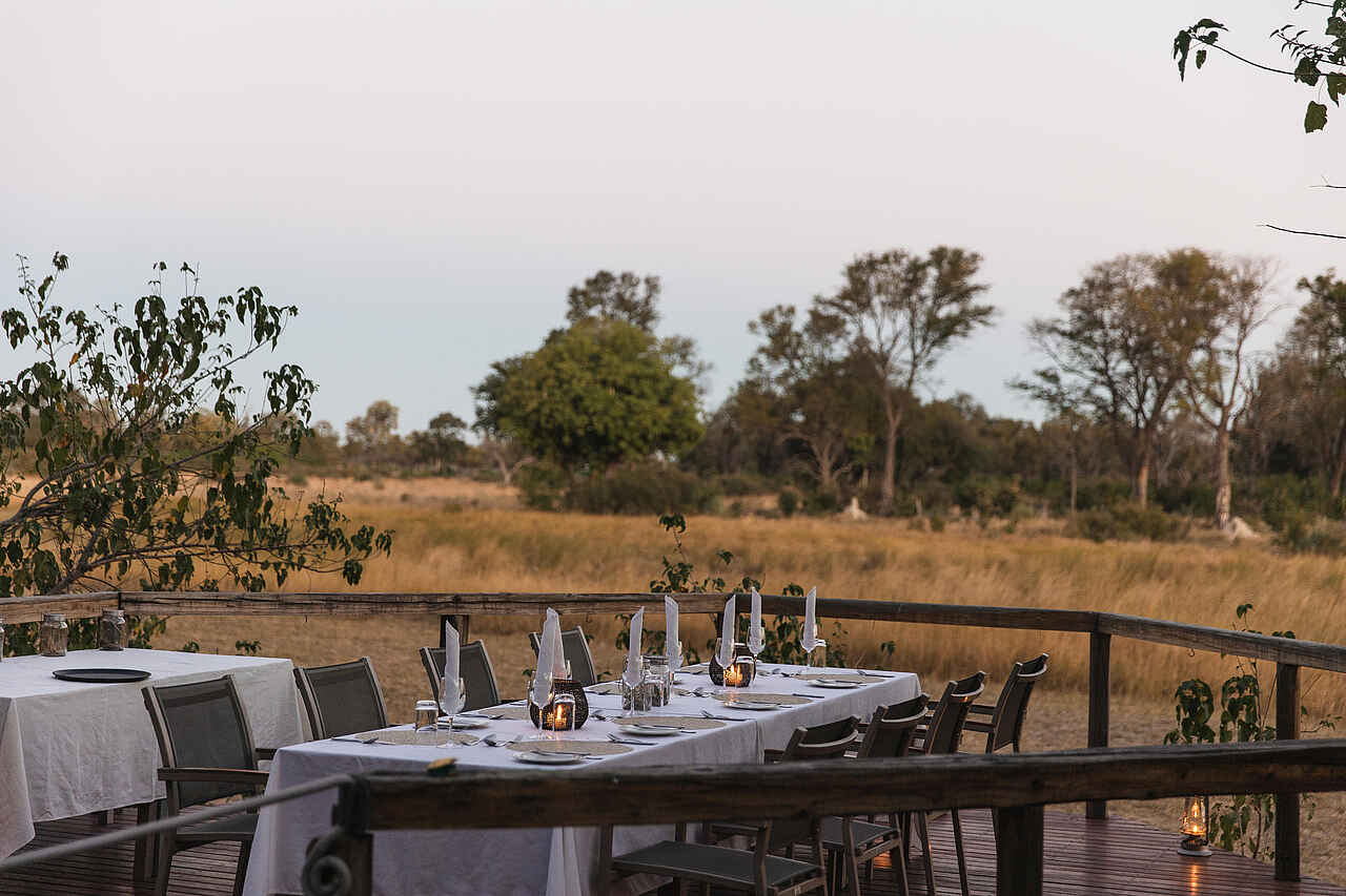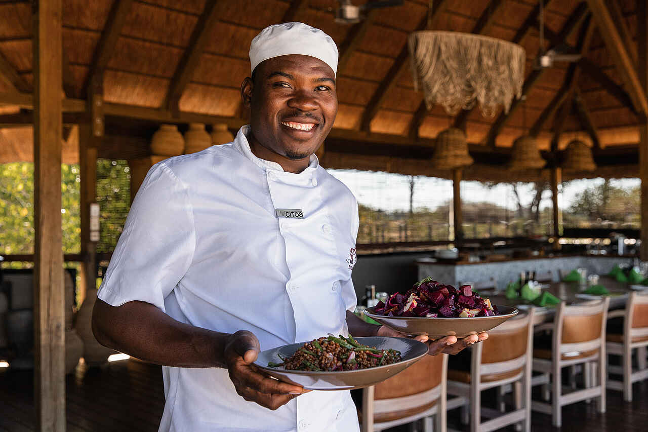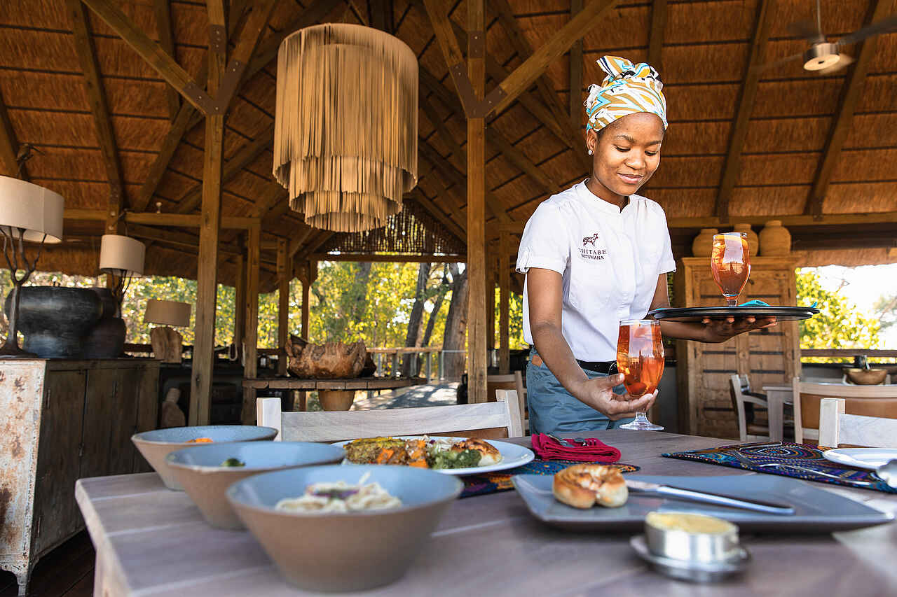 Die Küche im Chitabe Lediba Camp ist auf den Safari-Tagesablauf abgestimmt und bietet abwechslungsreiche, frisch zubereitete Mahlzeiten. Das Frühstück wird im Camp oder als Buschfrühstück während der Safari serviert. Mittags stehen leichte Gerichte und Salate auf dem Programm, die je nach Tagesplanung im Camp oder unterwegs eingenommen werden. Das Abendessen wird meist gemeinschaftlich im Essbereich oder an der Feuerstelle serviert. Vegetarische Gerichte sowie besondere Ernährungswünsche werden nach vorheriger Absprache berücksichtigt. Im Preis inbegriffen sind alle Mahlzeiten sowie lokale Getränke wie Softdrinks, Bier, Hausweine und ausgewählte Spirituosen. Die Atmosphäre beim Essen ist ungezwungen und persönlich.