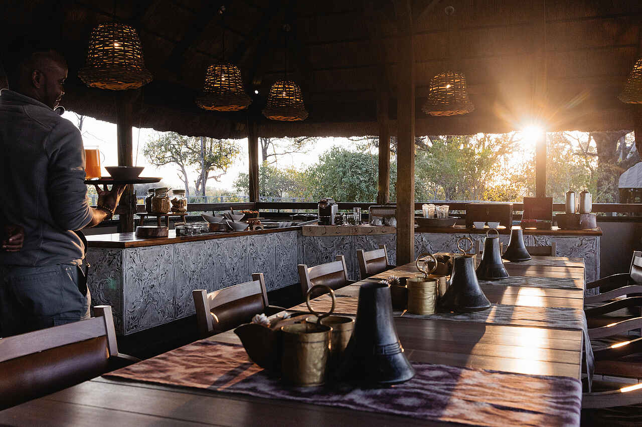 Der zentrale Bereich des Chitabe Lediba Camp ist offen gestaltet und klar strukturiert. Bar, Essbereich und Lounge gehen fließend ineinander über und schaffen einen angenehmen Rahmen für entspannte Stunden zwischen den Safaris. Bequeme Sitzmöbel und eine kleine Bibliothek mit ausgewählten Natur und Safari Büchern laden zum Verweilen ein. Ergänzt wird der Gemeinschaftsbereich durch einen separaten Raum mit einer Auswahl an Brettspielen sowie einen kleinen Shop mit Safari Kleidung und lokalen Handarbeiten.
